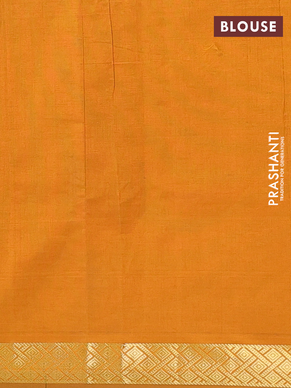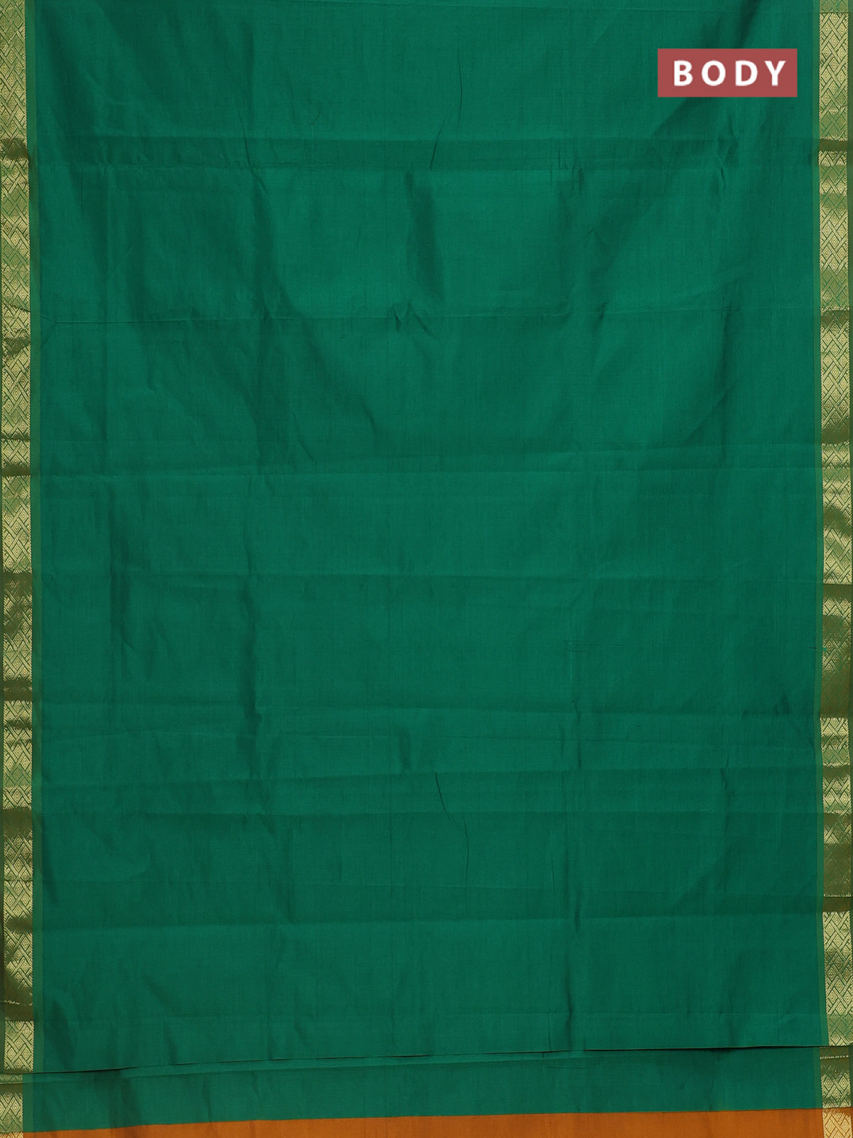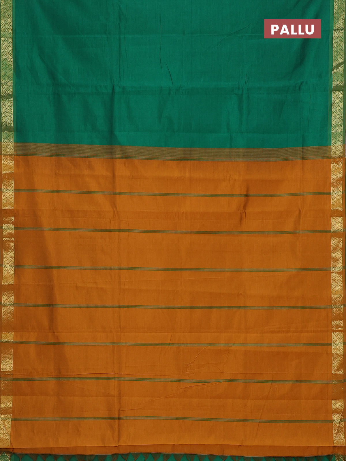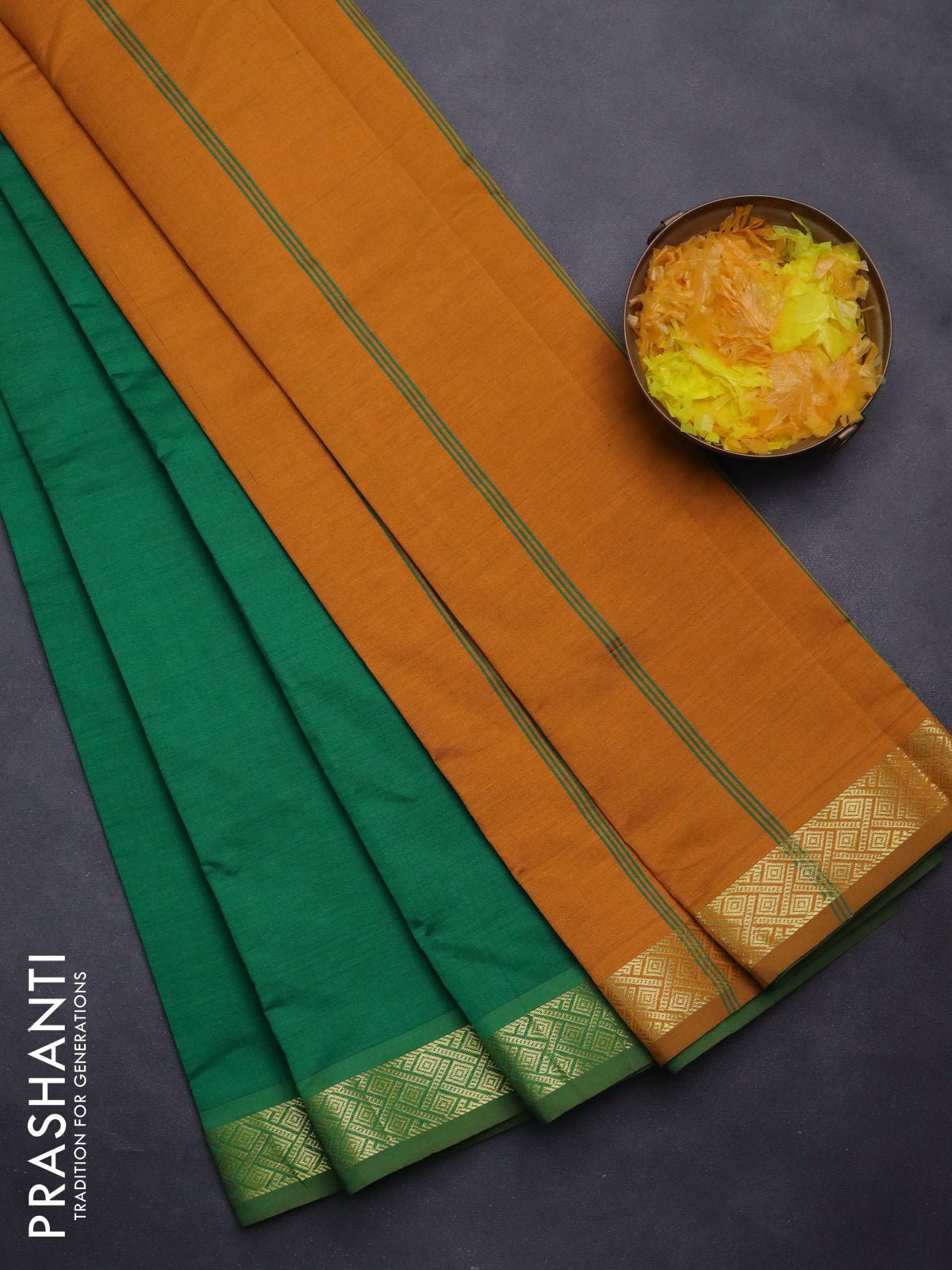 Semi silk cotton saree green and dark mustard with plain body and zari woven border