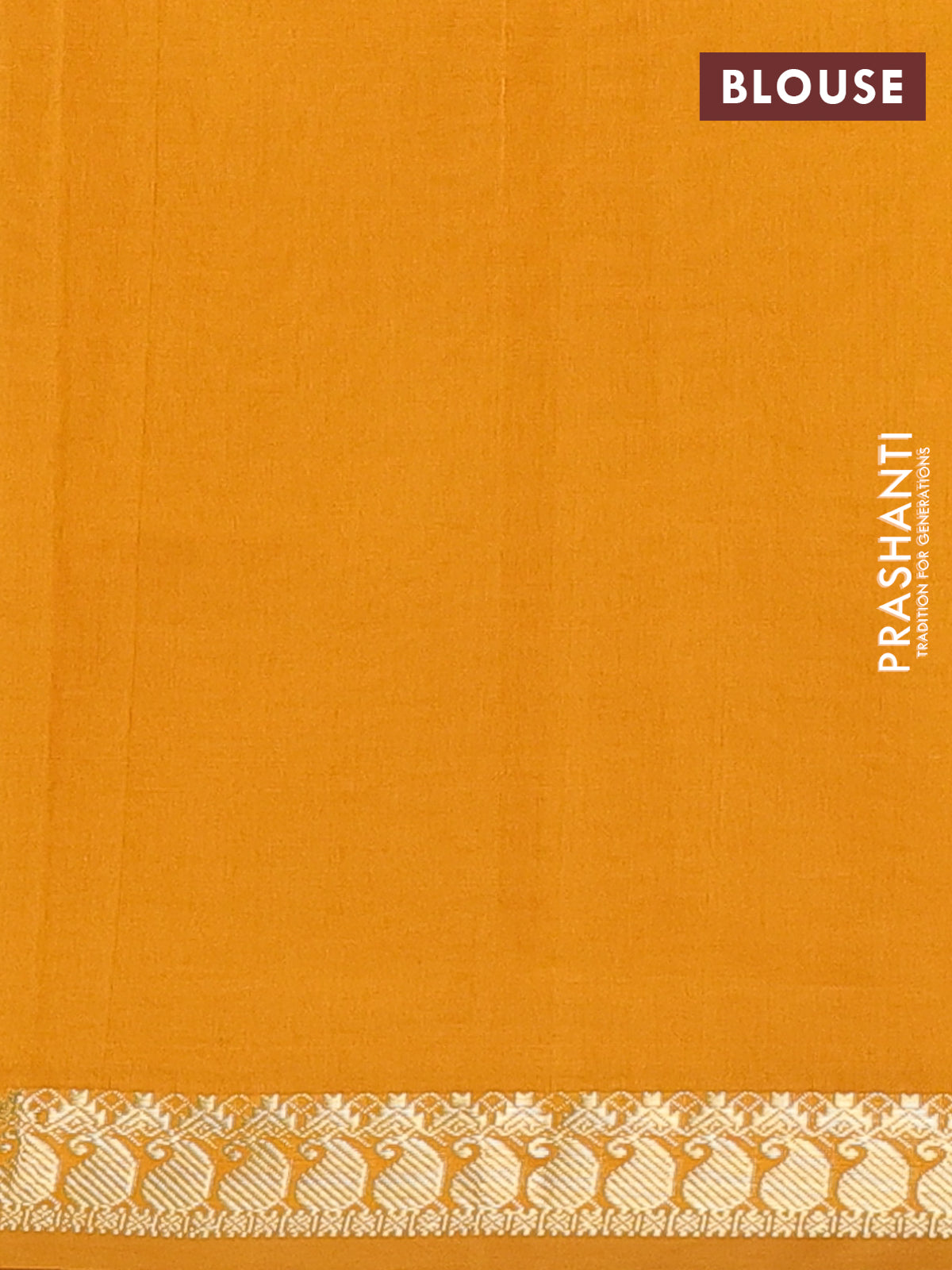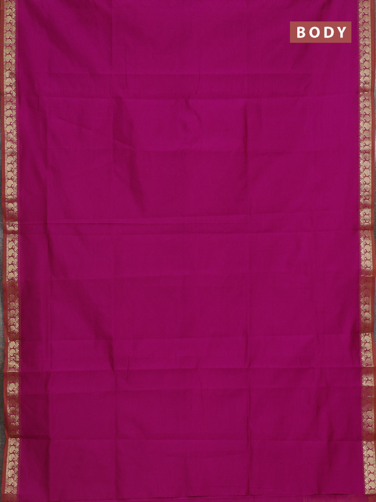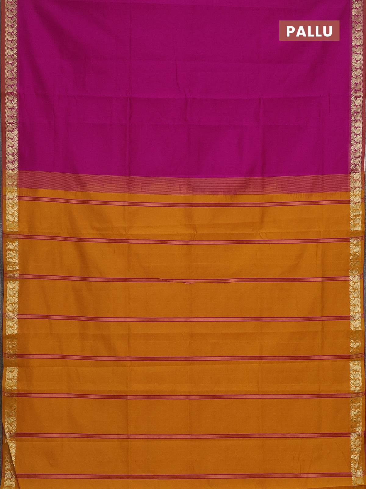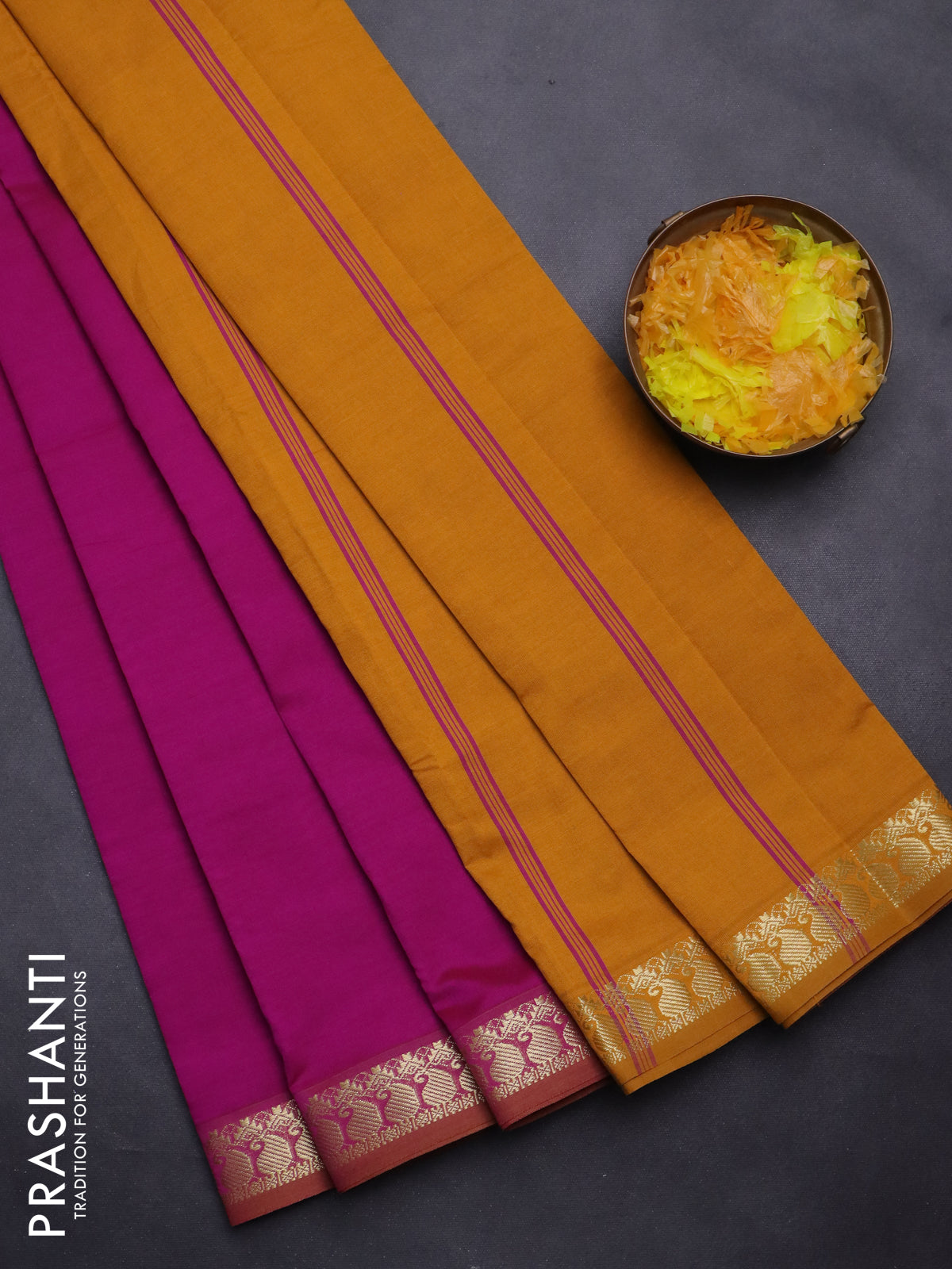 Semi silk cotton saree magenta pink and mustard yellow with plain body and zari woven border