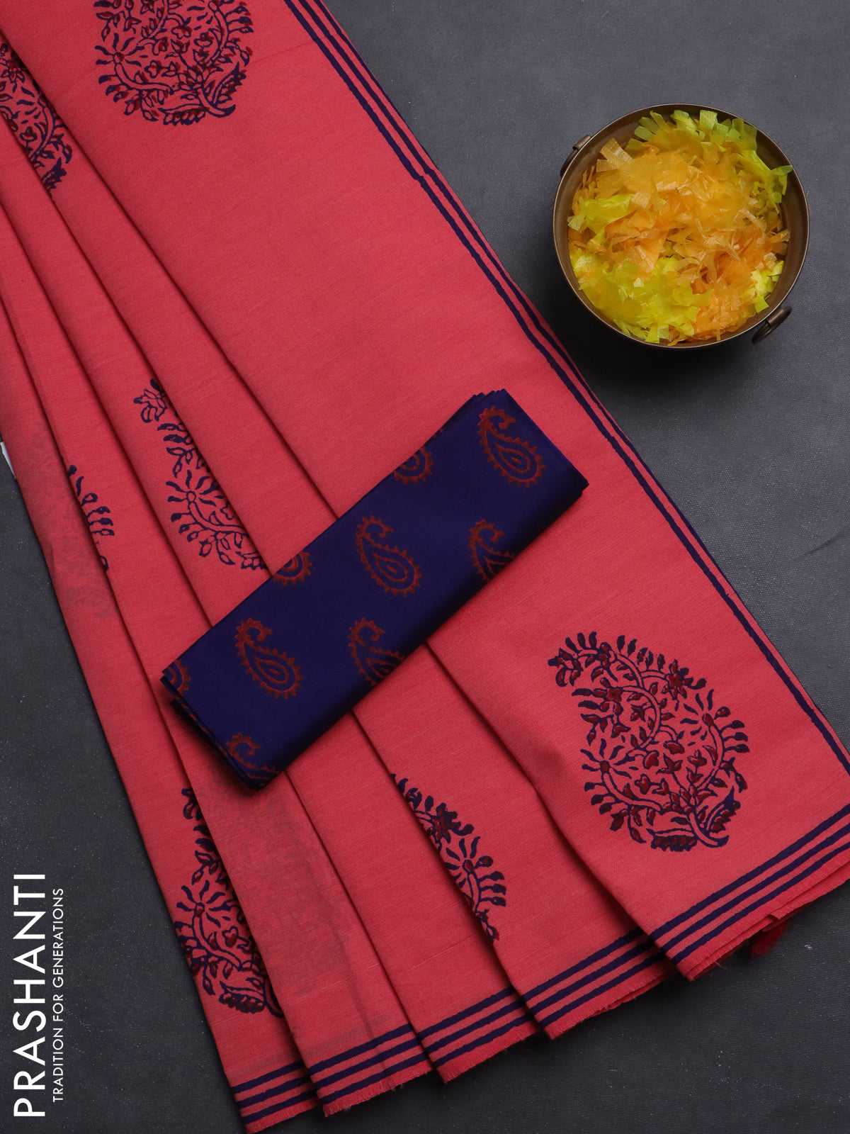 Semi silk cotton saree peach pink and blue with butta prints and printed border