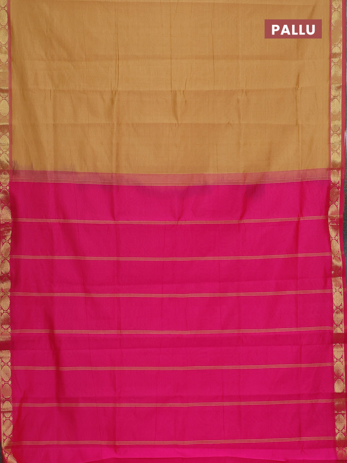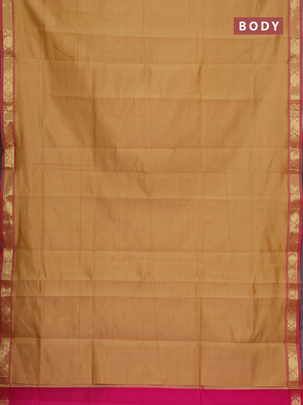 Semi silk cotton saree sandal and pink with plain body and zari woven border