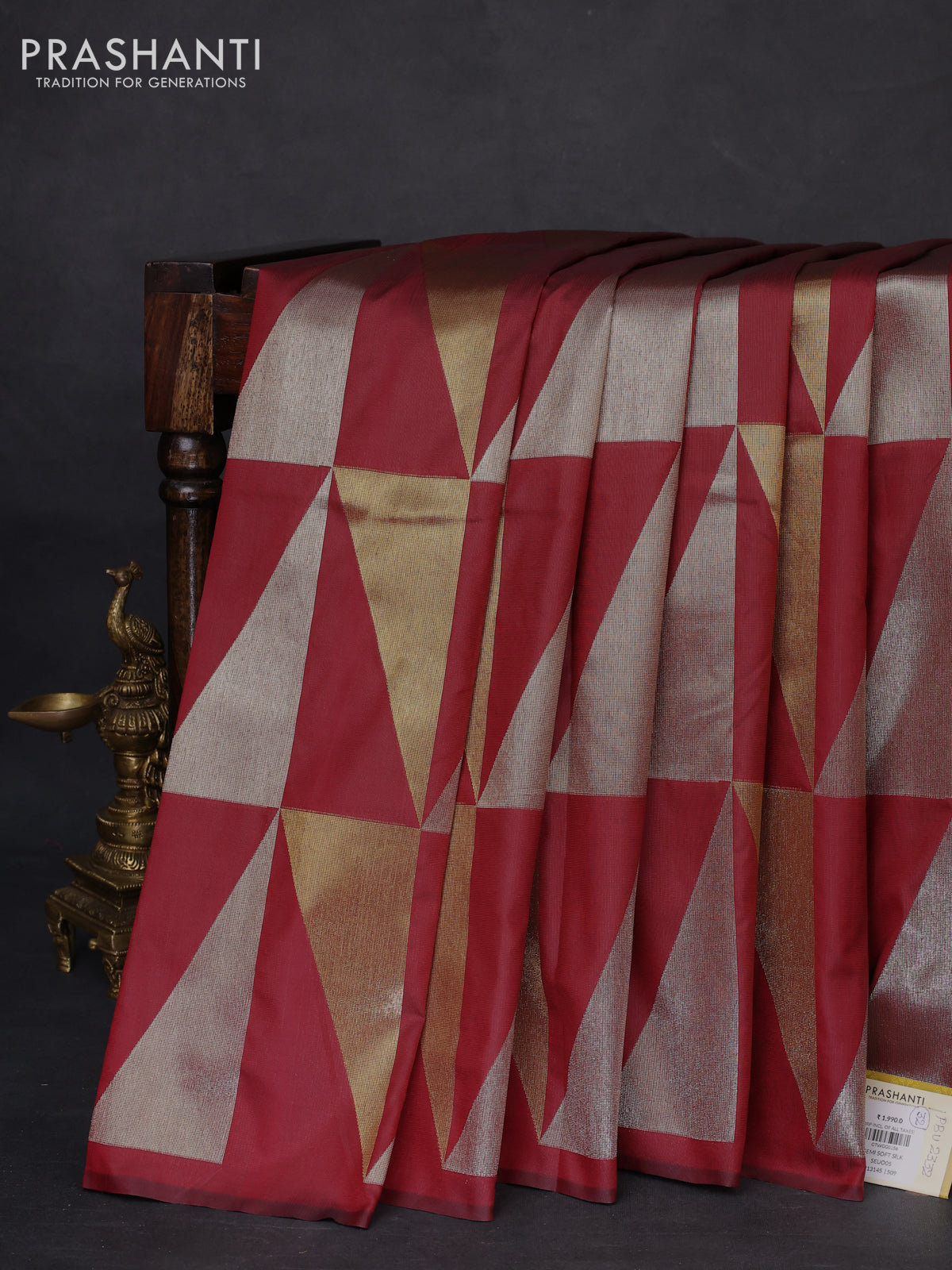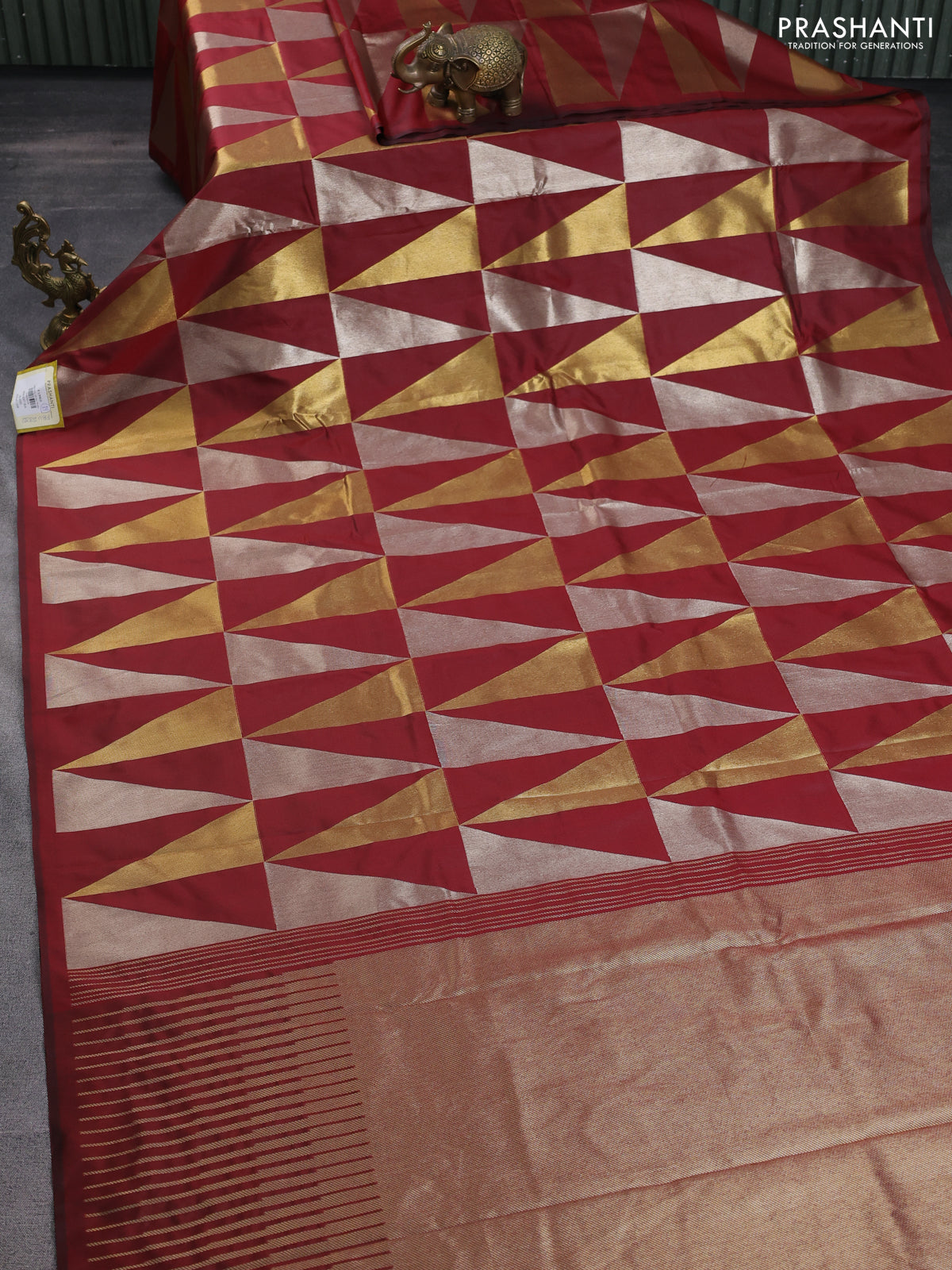 Semi soft silk saree maroon with allover silver & gold geometric weaves in borderless style