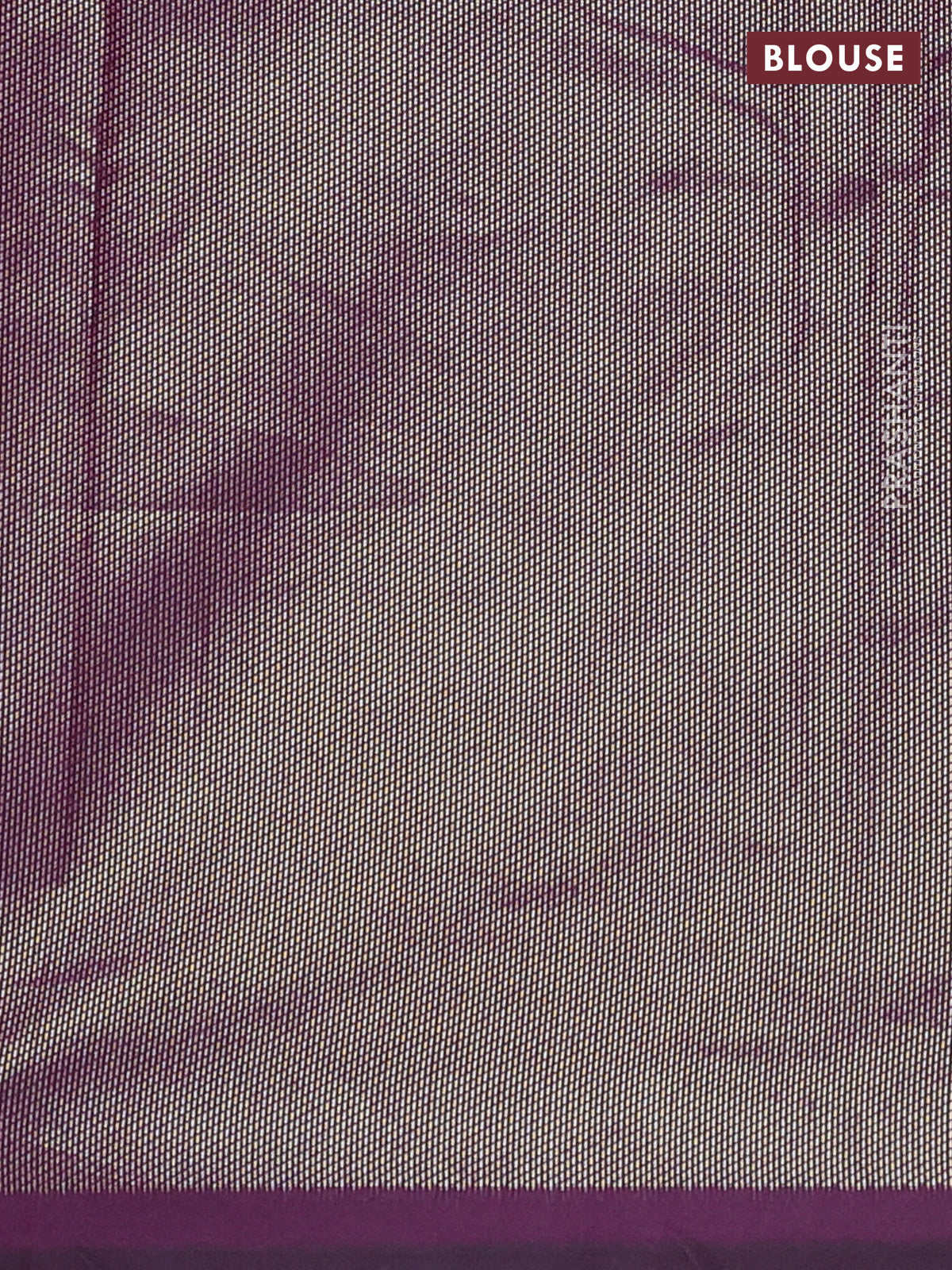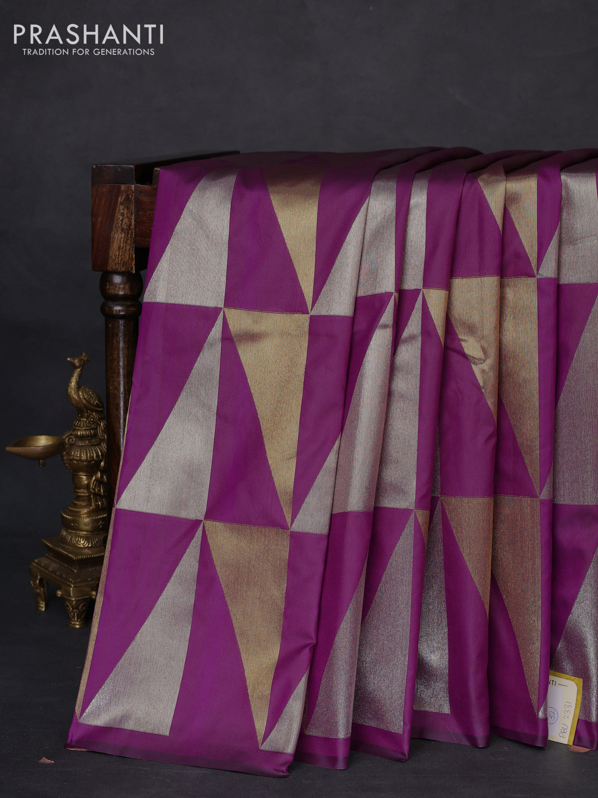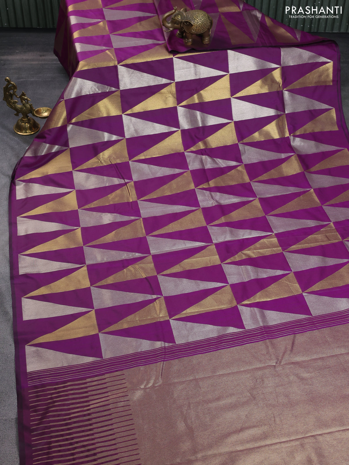 Semi soft silk saree purple with allover silver & gold geometric weaves in borderless style