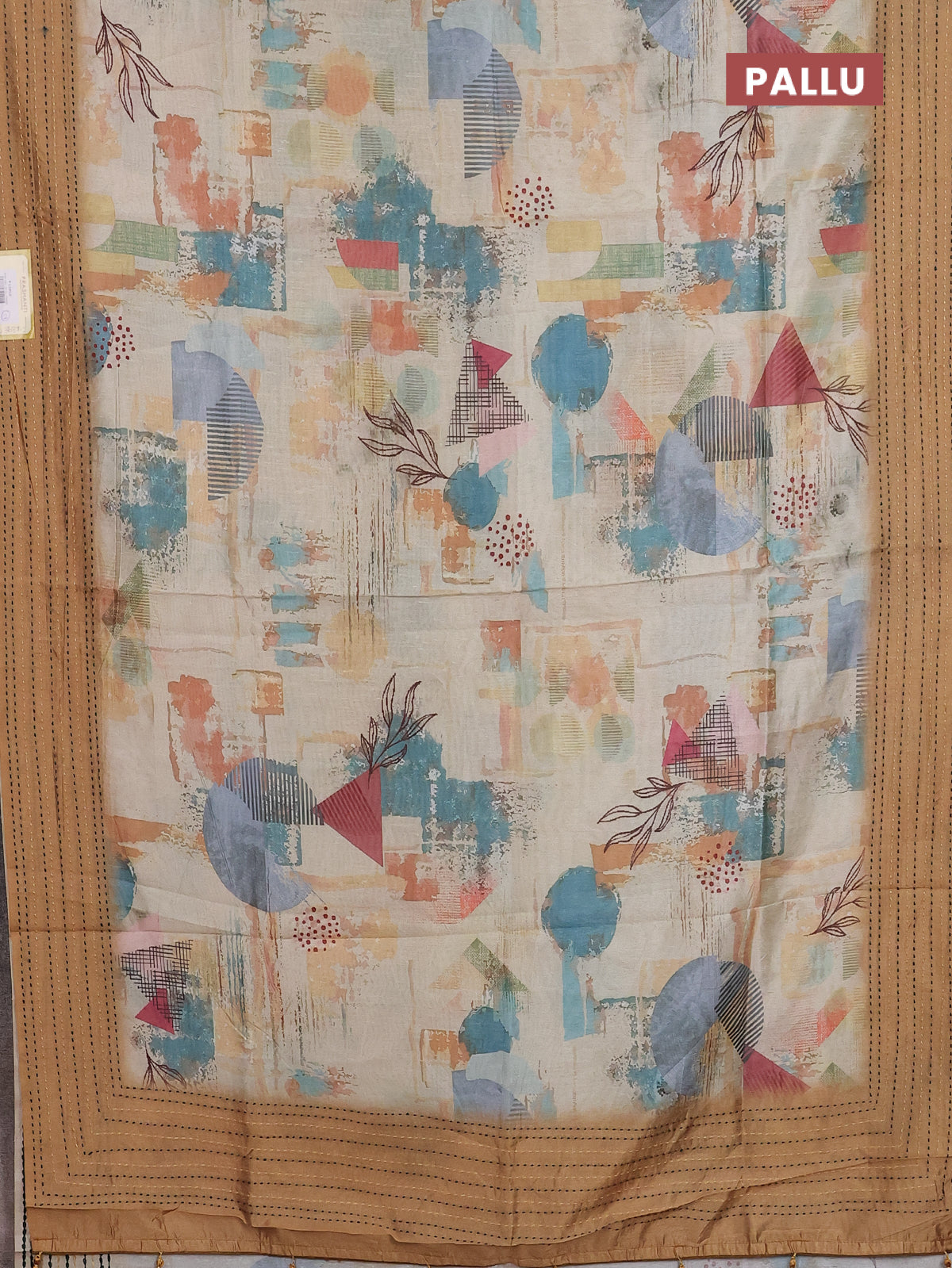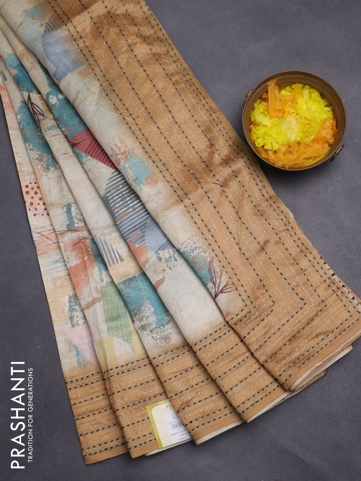 Semi tussar saree beige and sandal with allover prints and kantha stitch work border