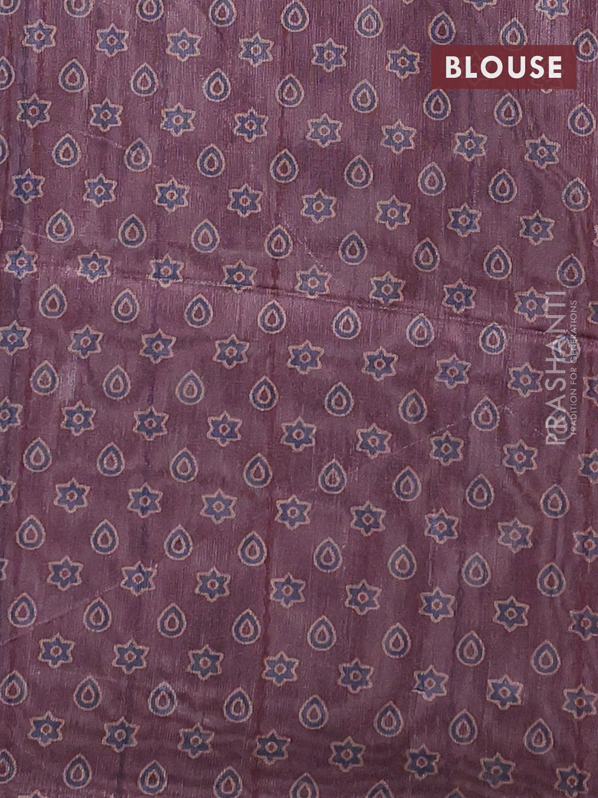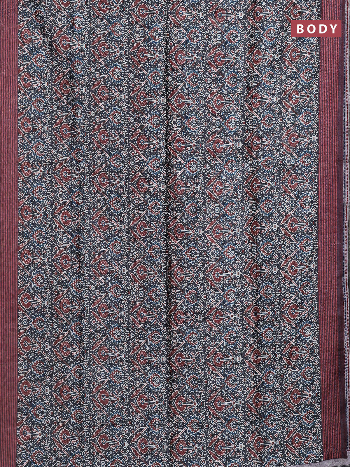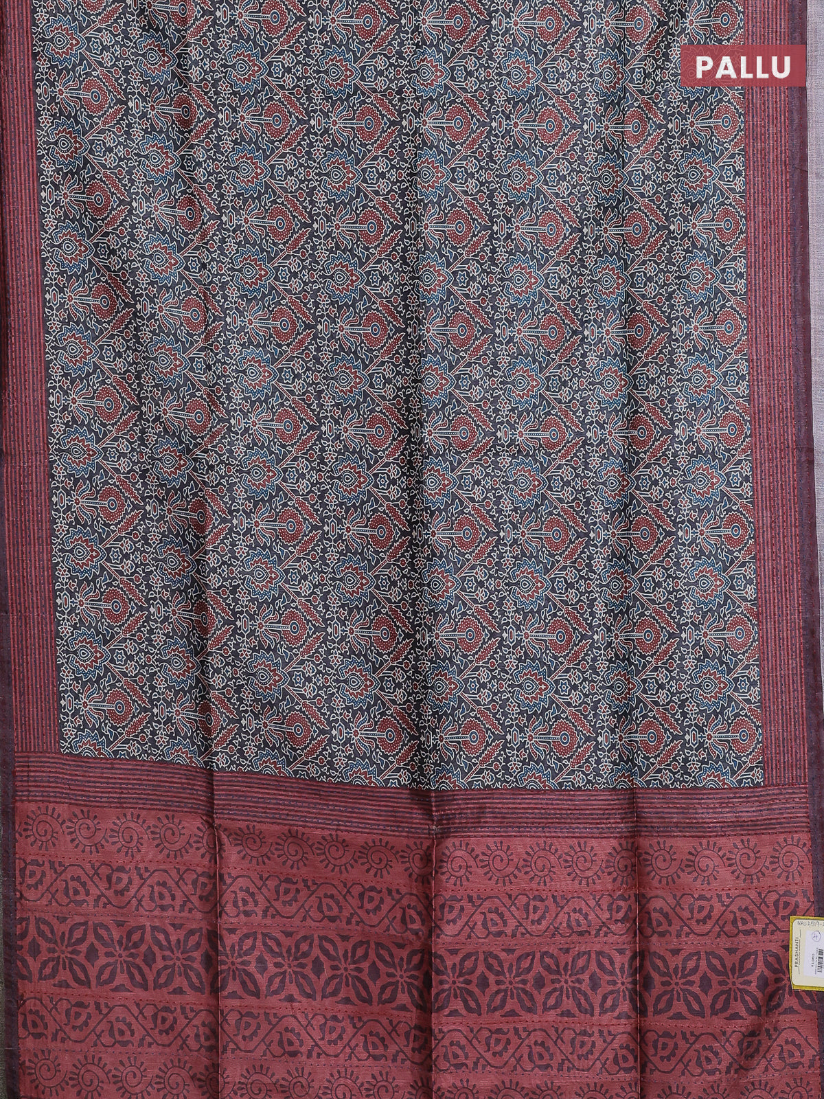 Semi tussar saree black and pastel maroon with allover ajrakh prints and katha stitch work pallu & border