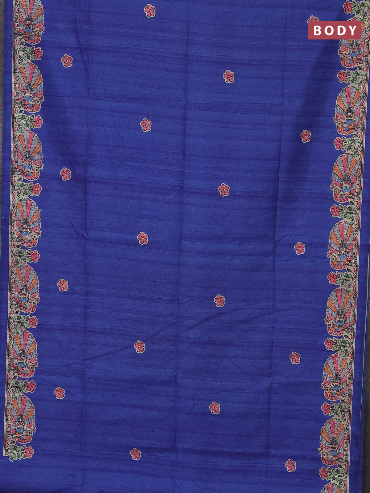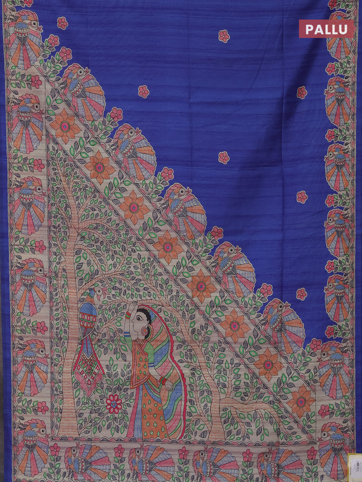 Semi tussar saree blue and beige with butta prints and madhubani printed pallu