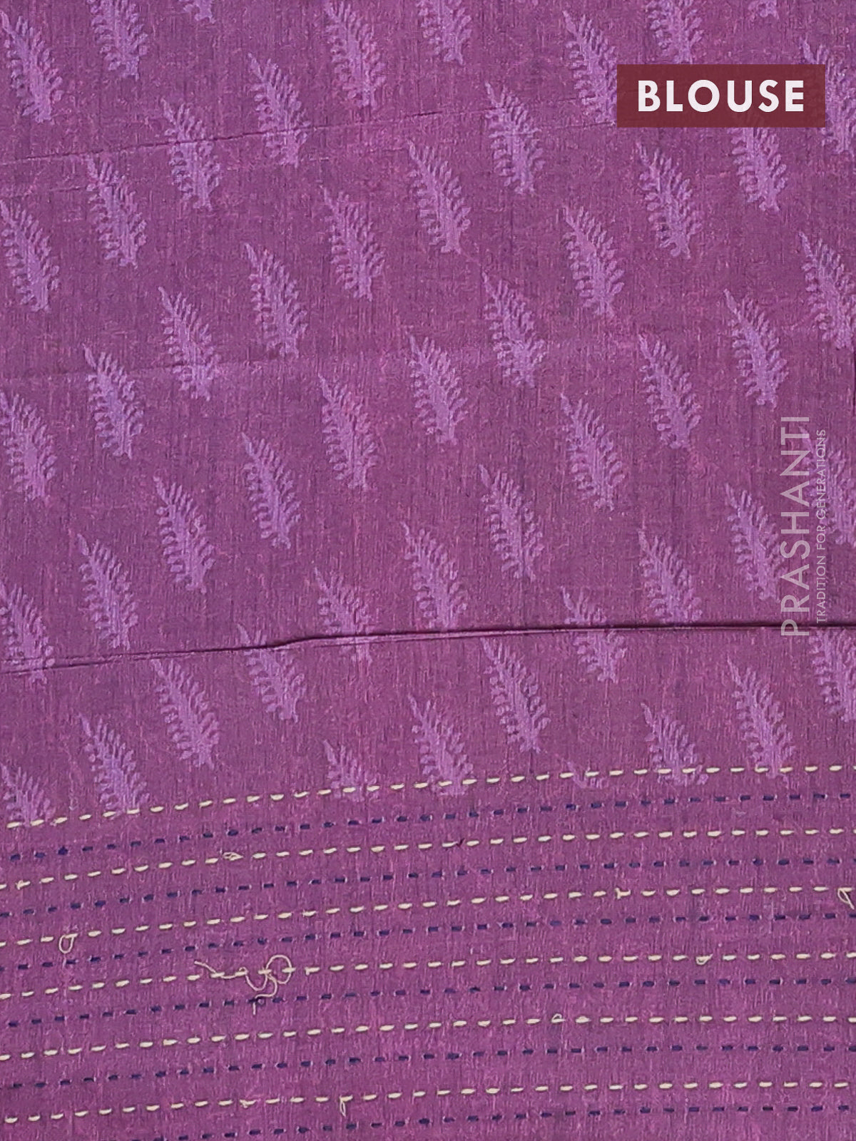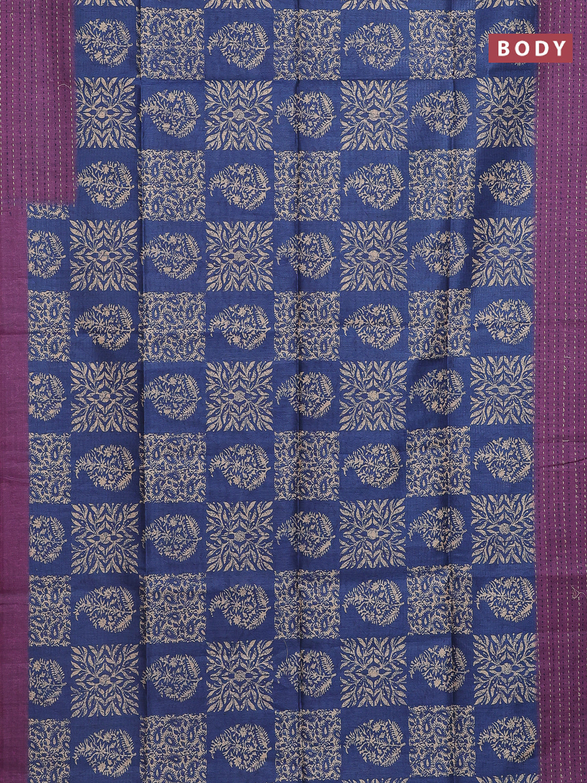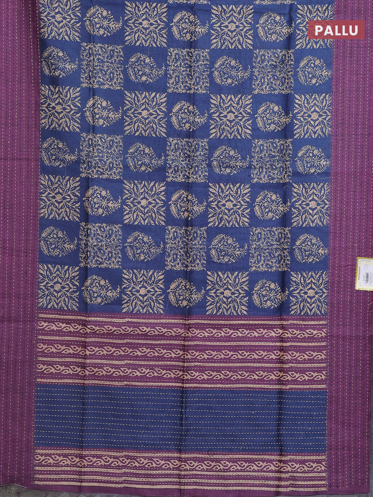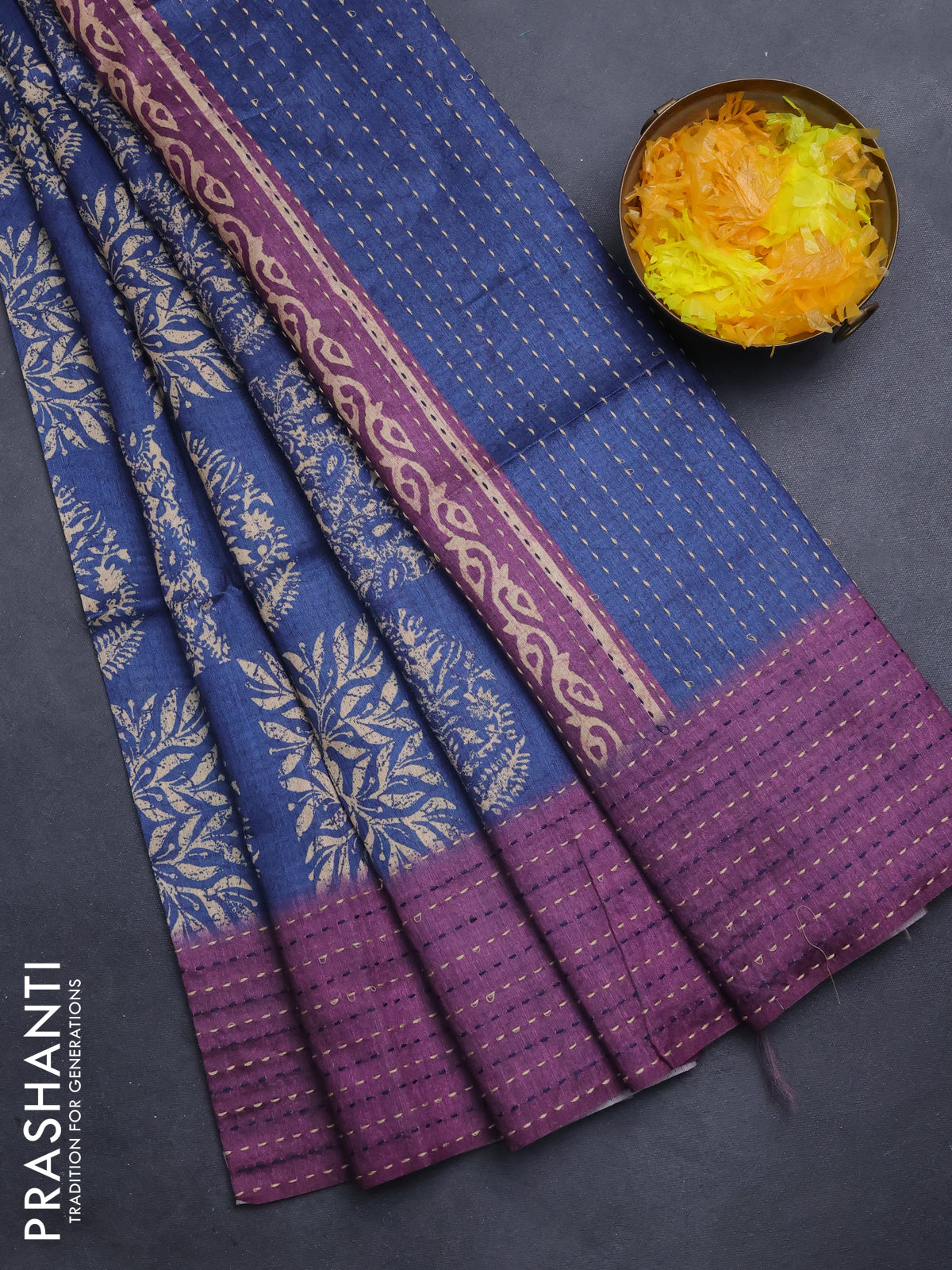 Semi tussar saree blue and purple with allover batik prints and katha stitch work pallu & border