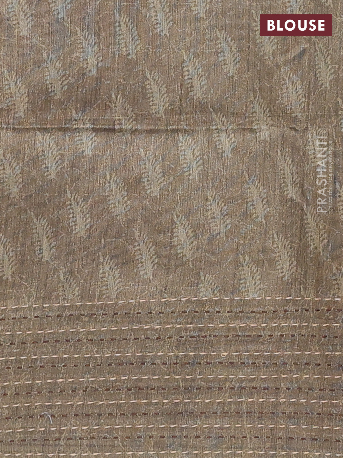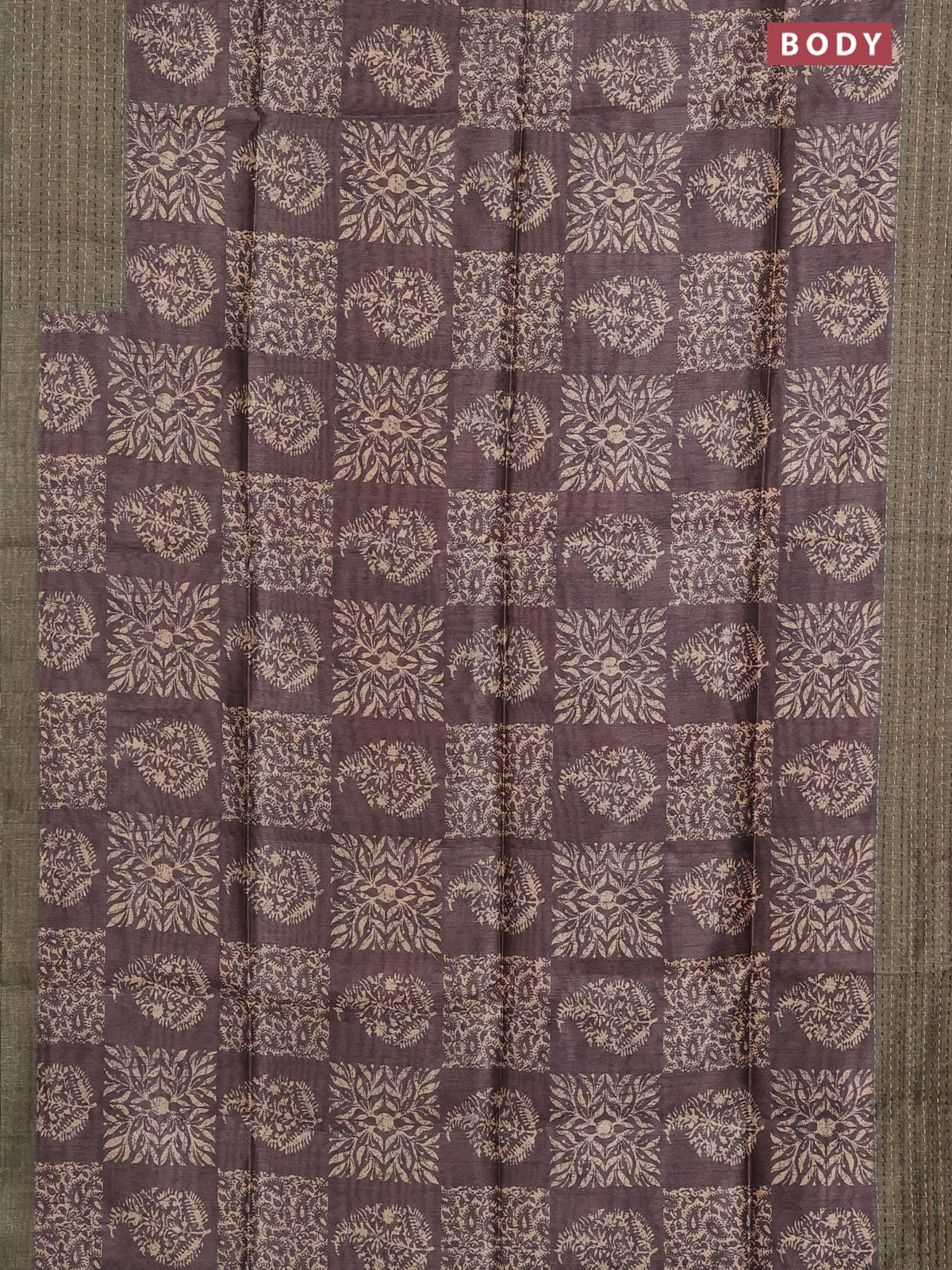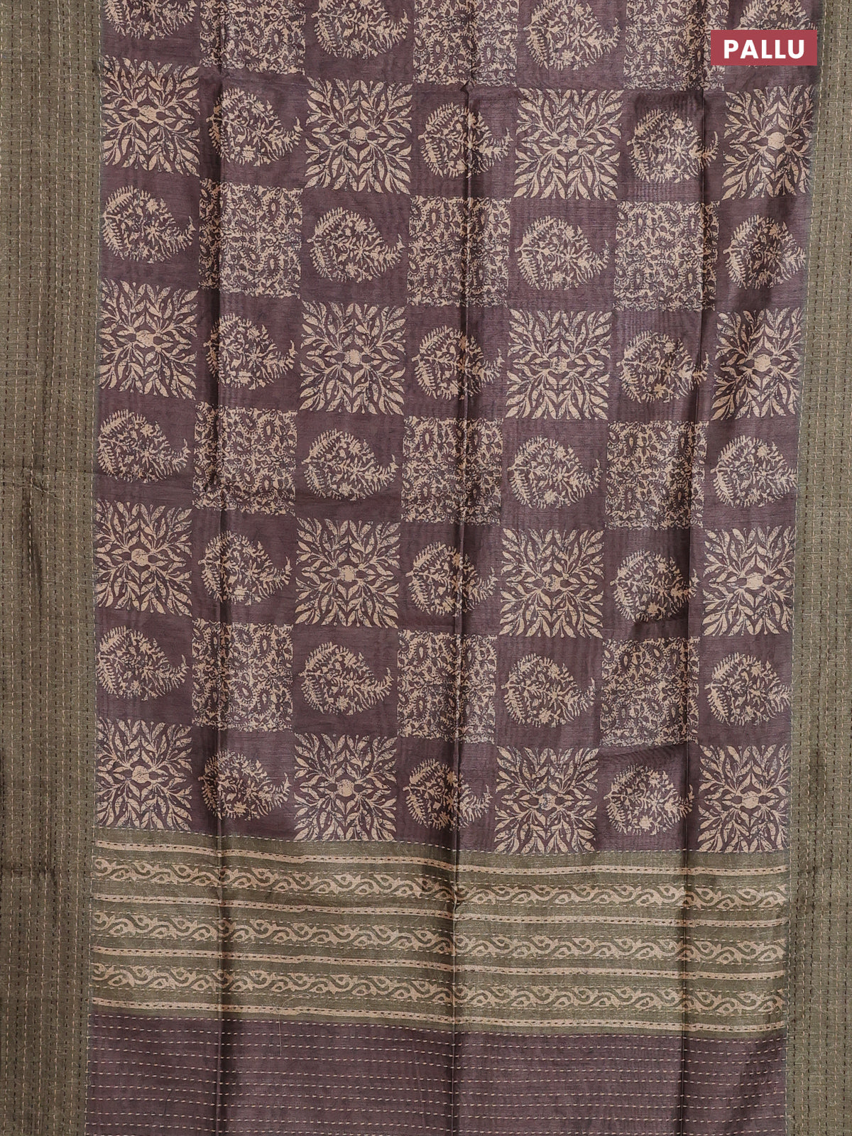 Semi tussar saree brown and sap green with allover batik prints and katha stitch work pallu & border
