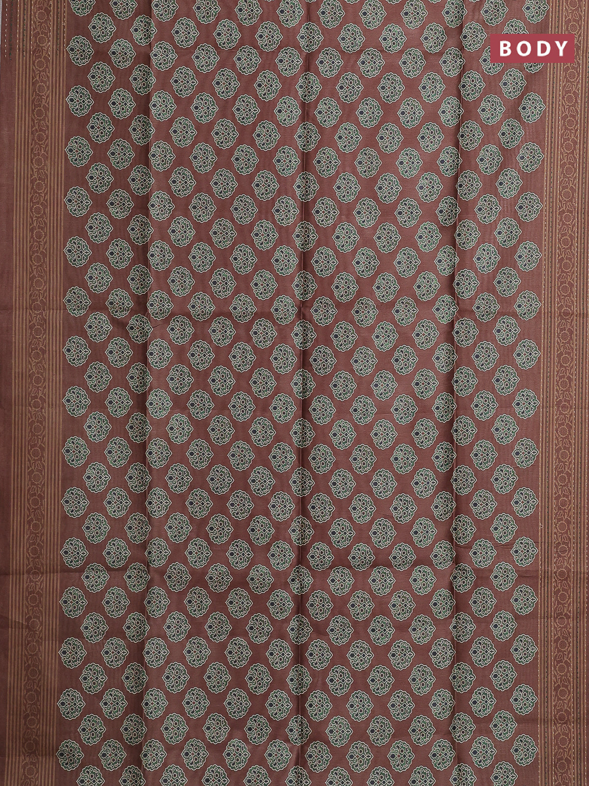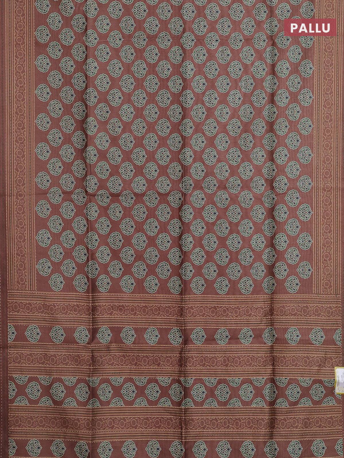 Semi tussar saree brown with allover ajrakh butta prints and katha stitch work pallu & border