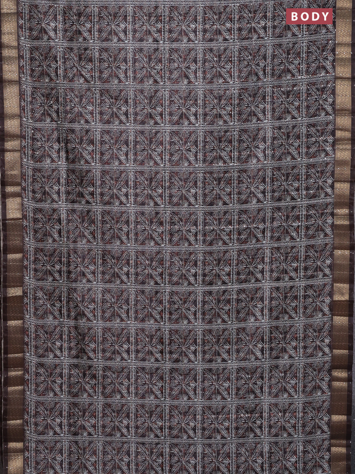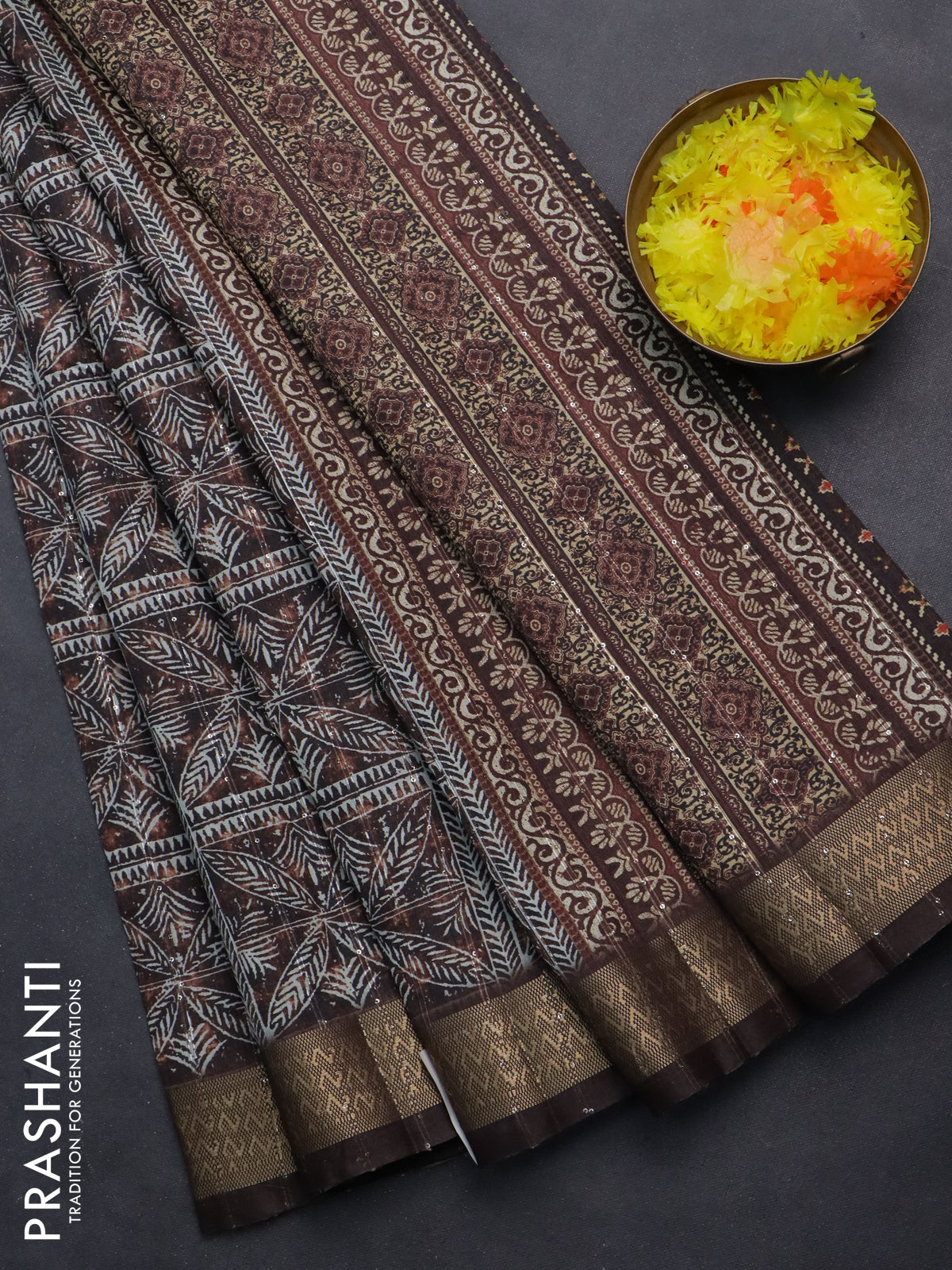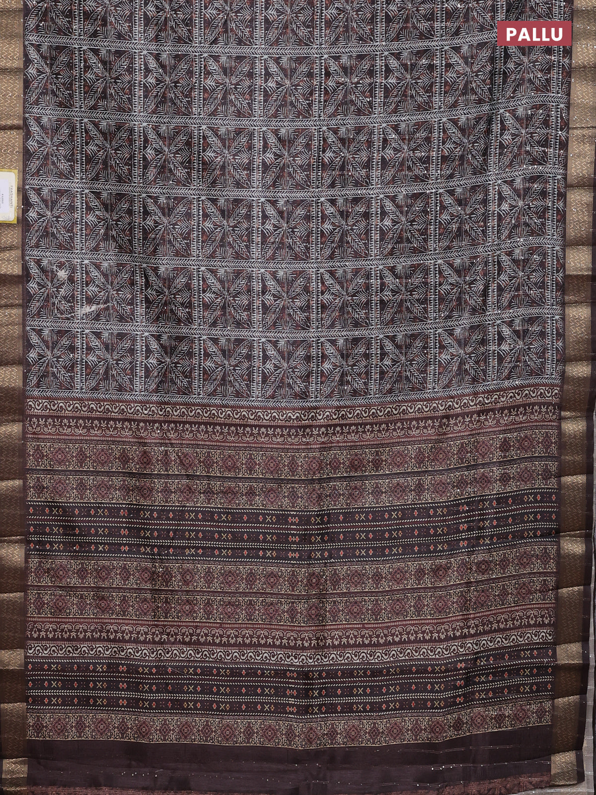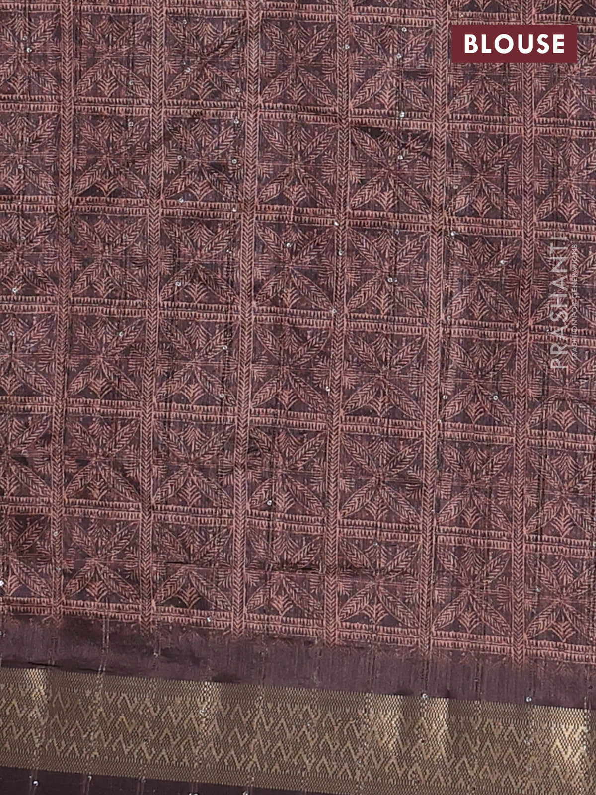 Semi tussar saree brown with allover leaf prints & sequin work and zari woven border