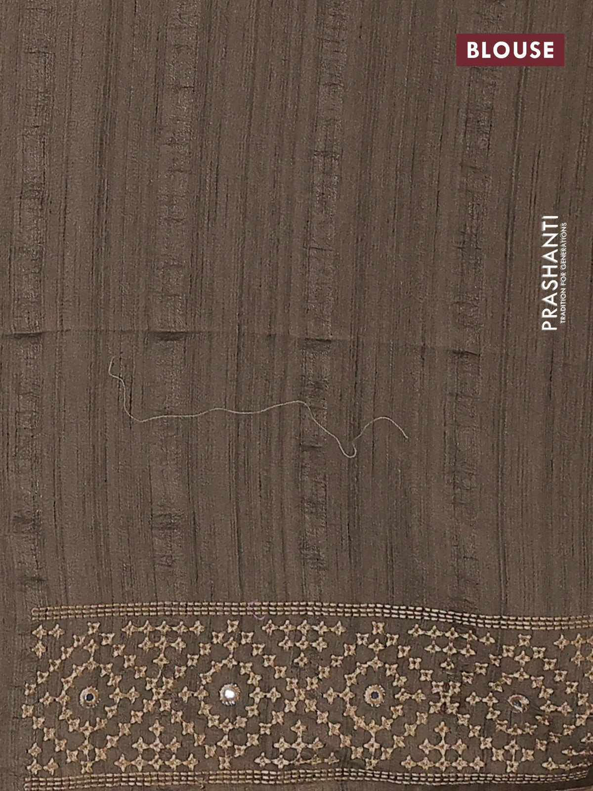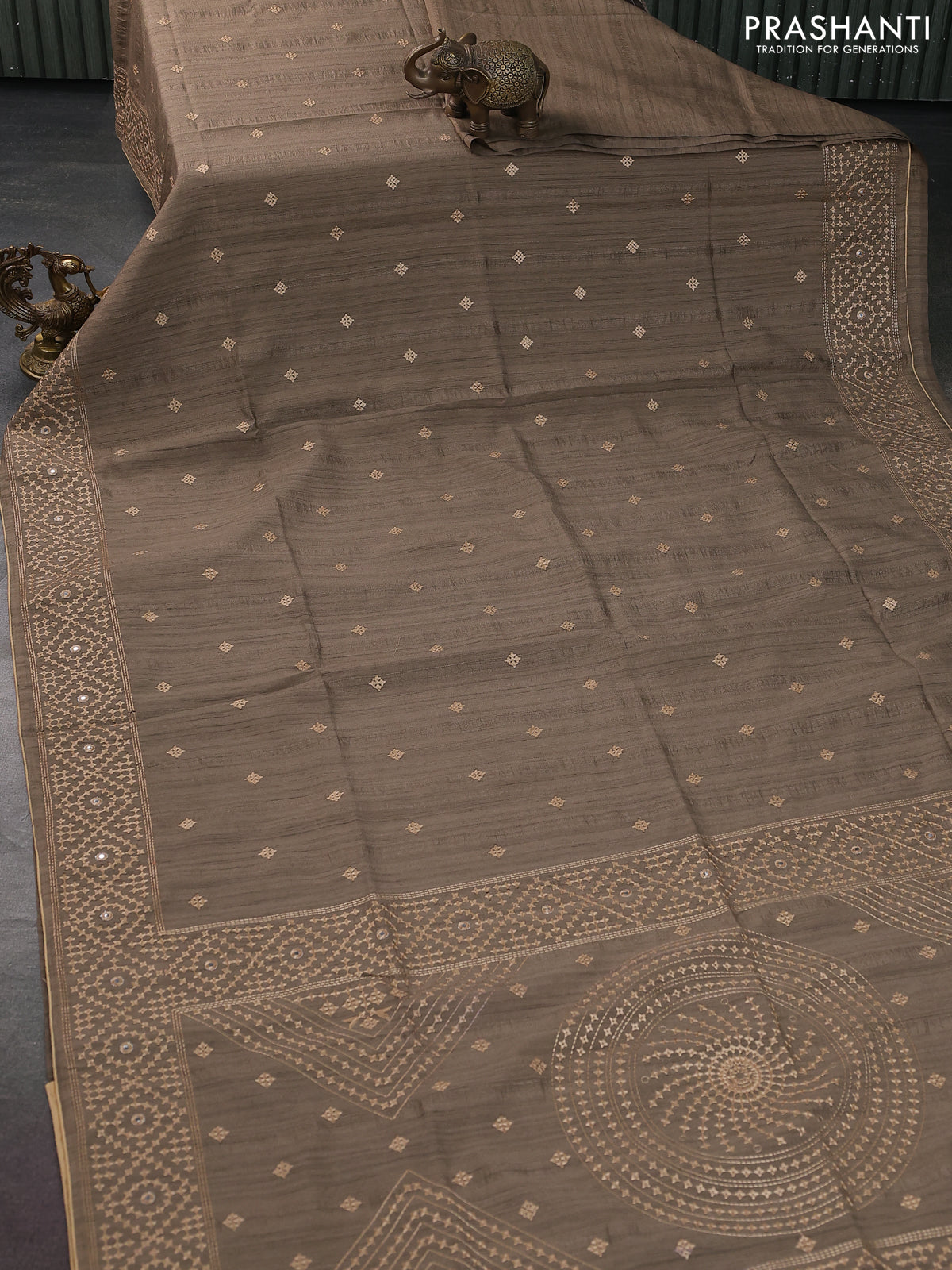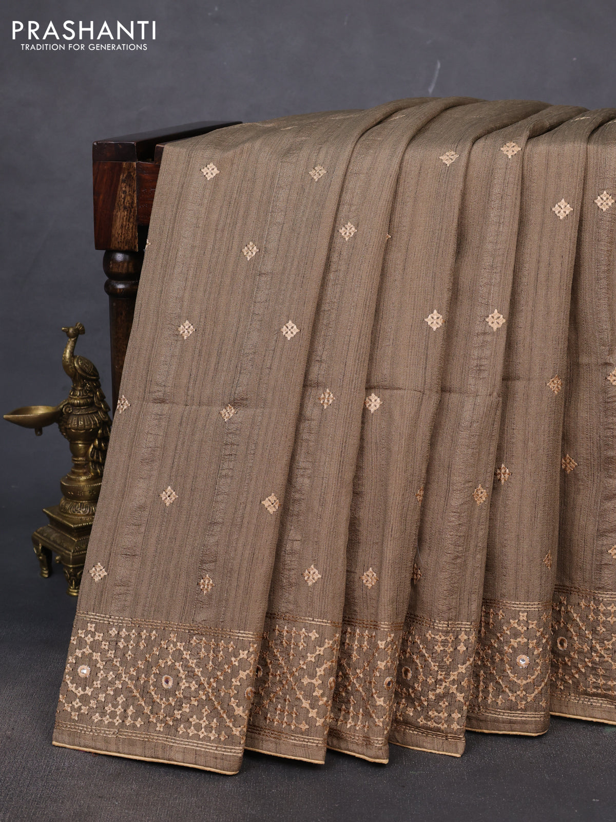 Semi tussar saree chikku shade and sandal with embroidery work buttas and embroidery mirror work border