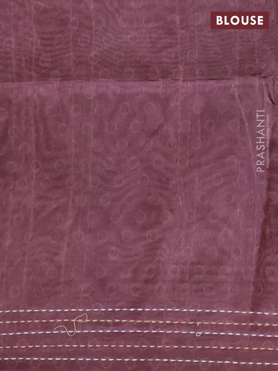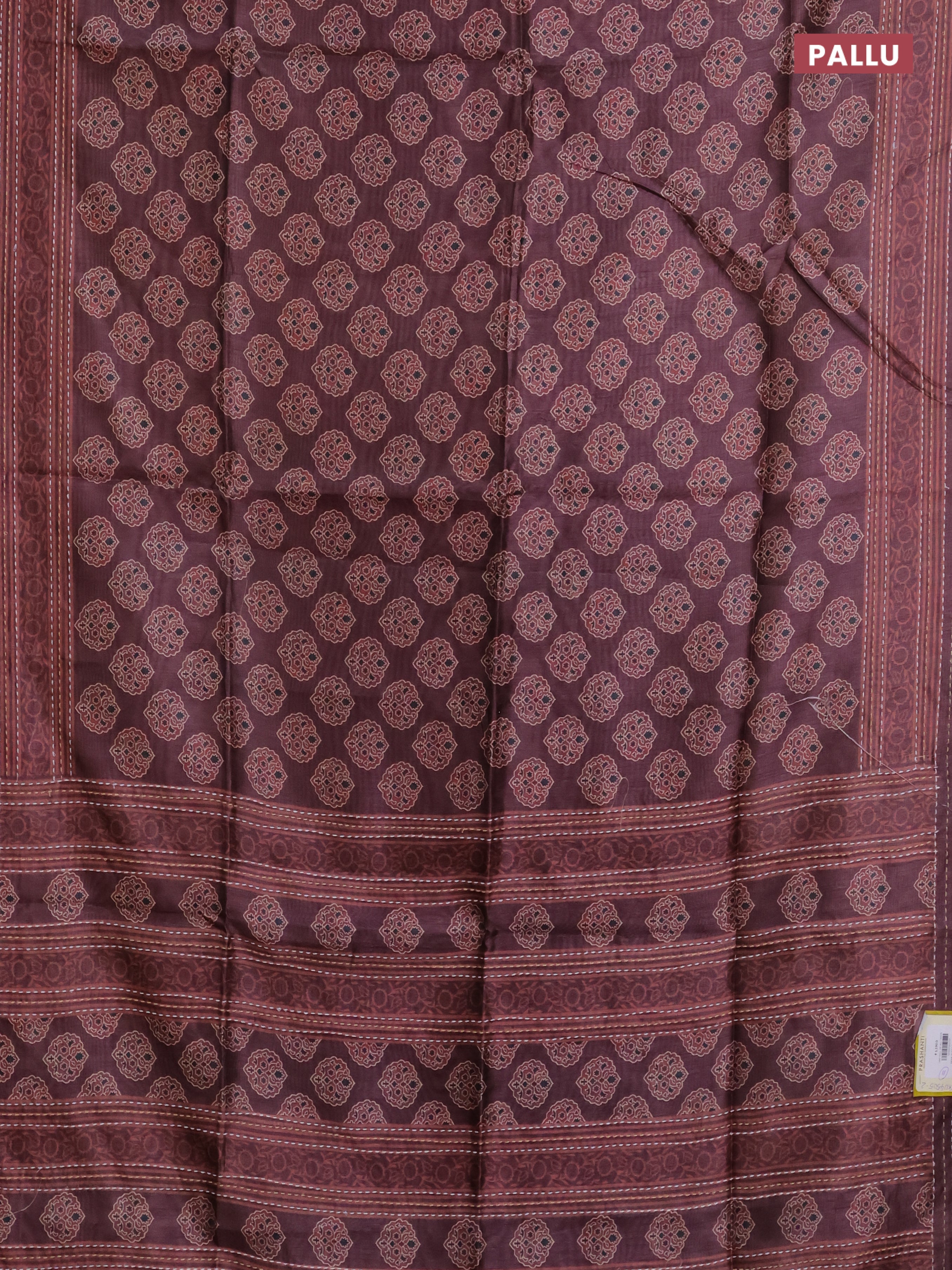 Semi tussar saree coffee brown with allover ajrakh butta prints and katha stitch work pallu & border