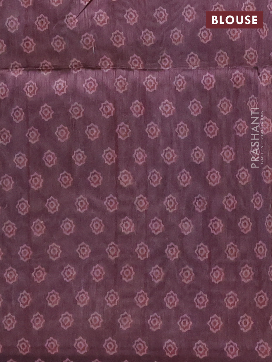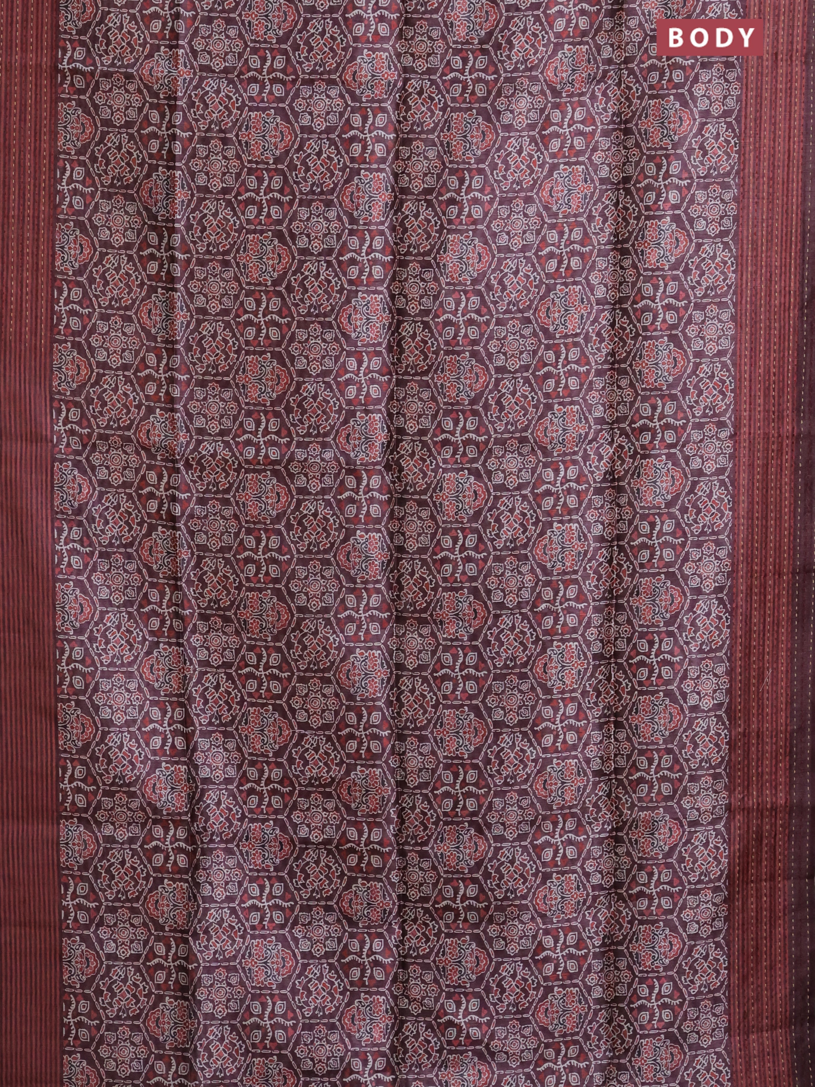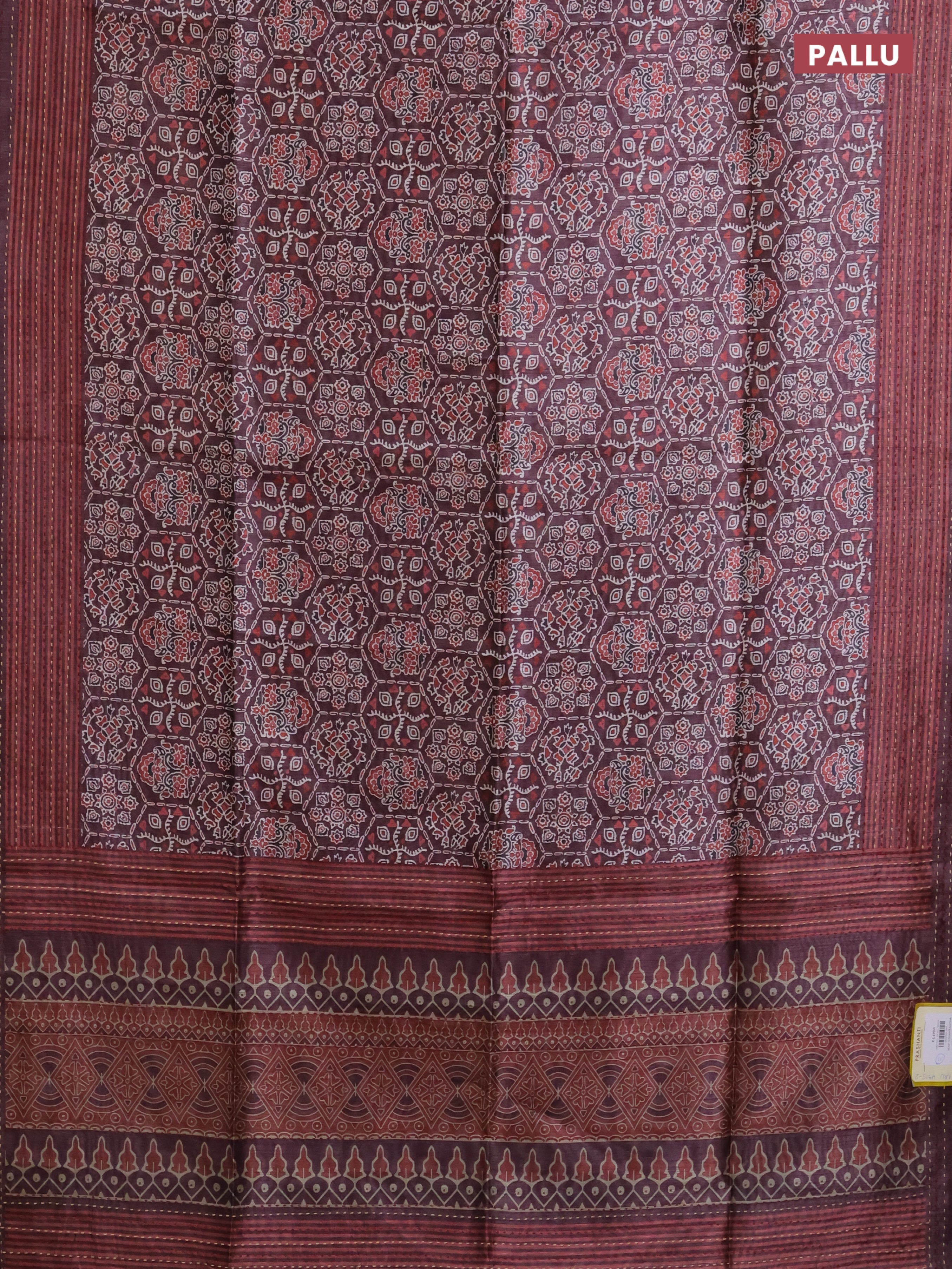 Semi tussar saree coffee brown with allover ajrakh prints and katha stitch work pallu & border