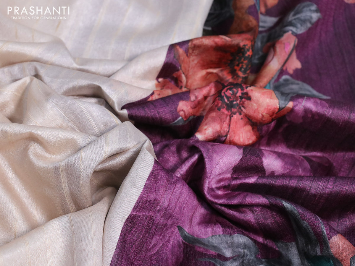 Semi tussar saree cream and deep purple with plain body and floral digital printed border