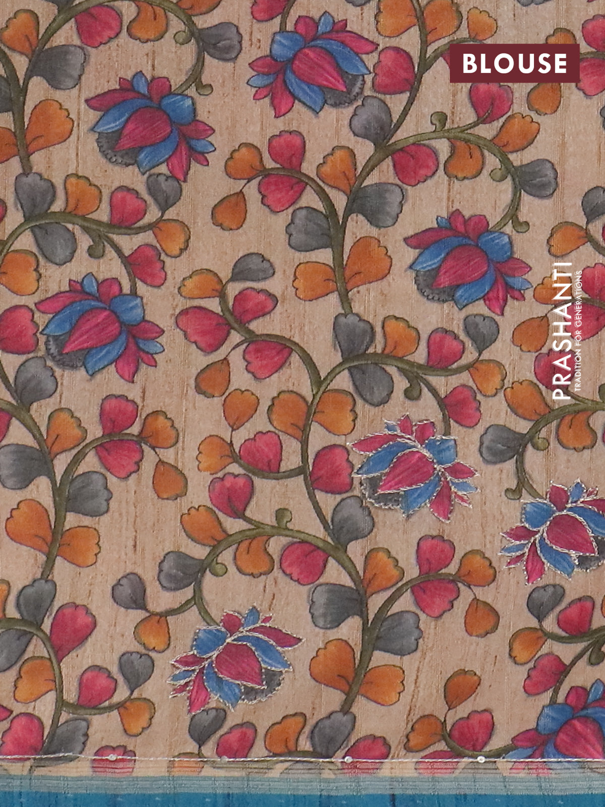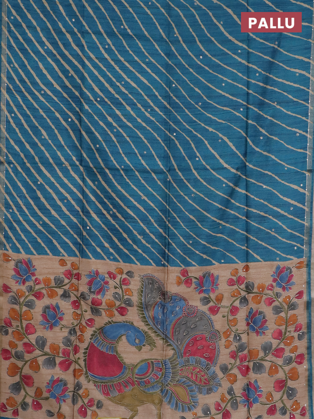 Semi tussar saree cs blue and beige with allover leheriya prints & zari buttas and kalamkari prints & pita work pallu