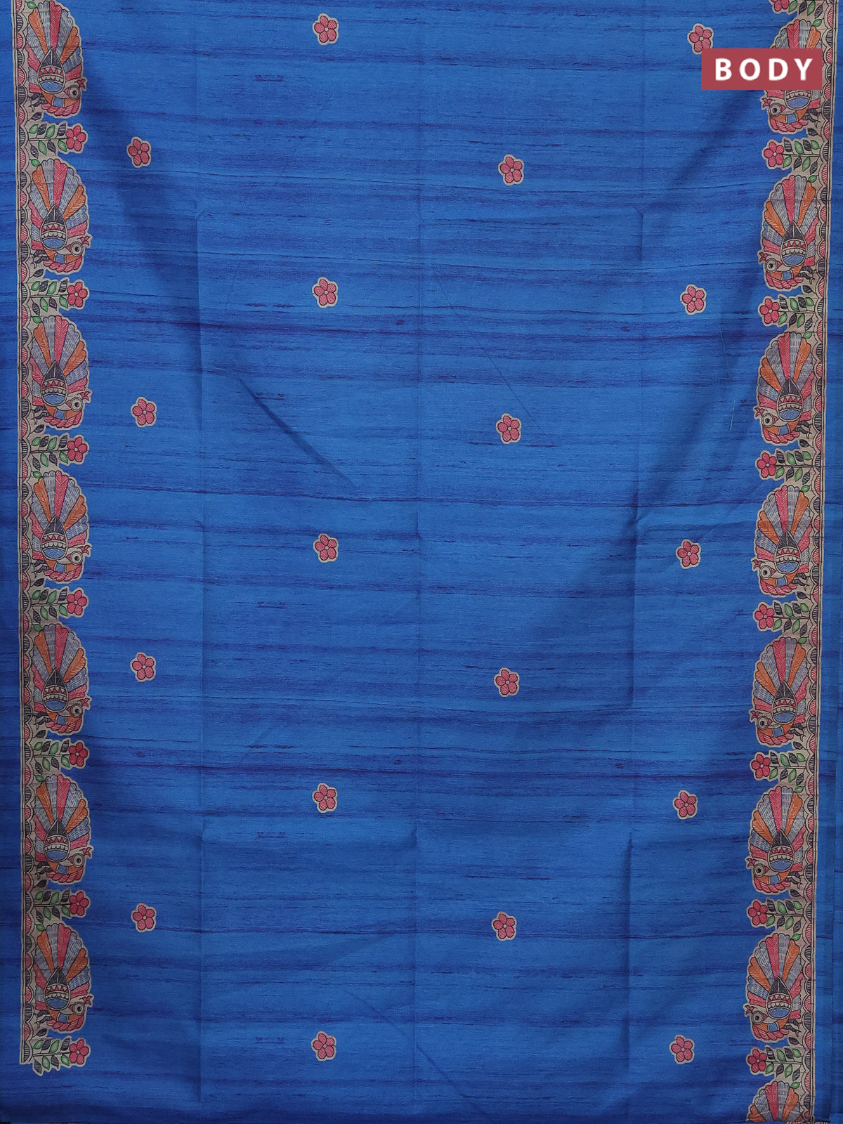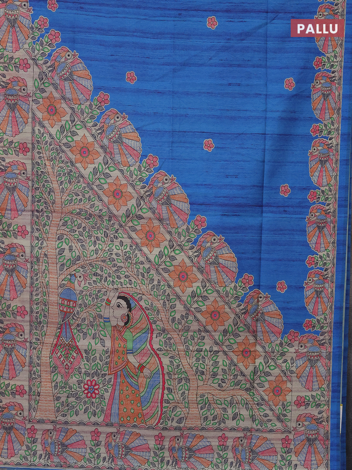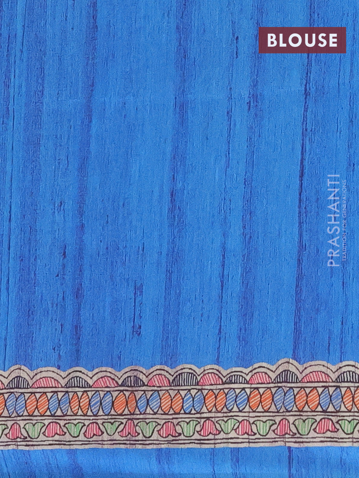 Semi tussar saree cs blue and beige with butta prints and madhubani printed pallu