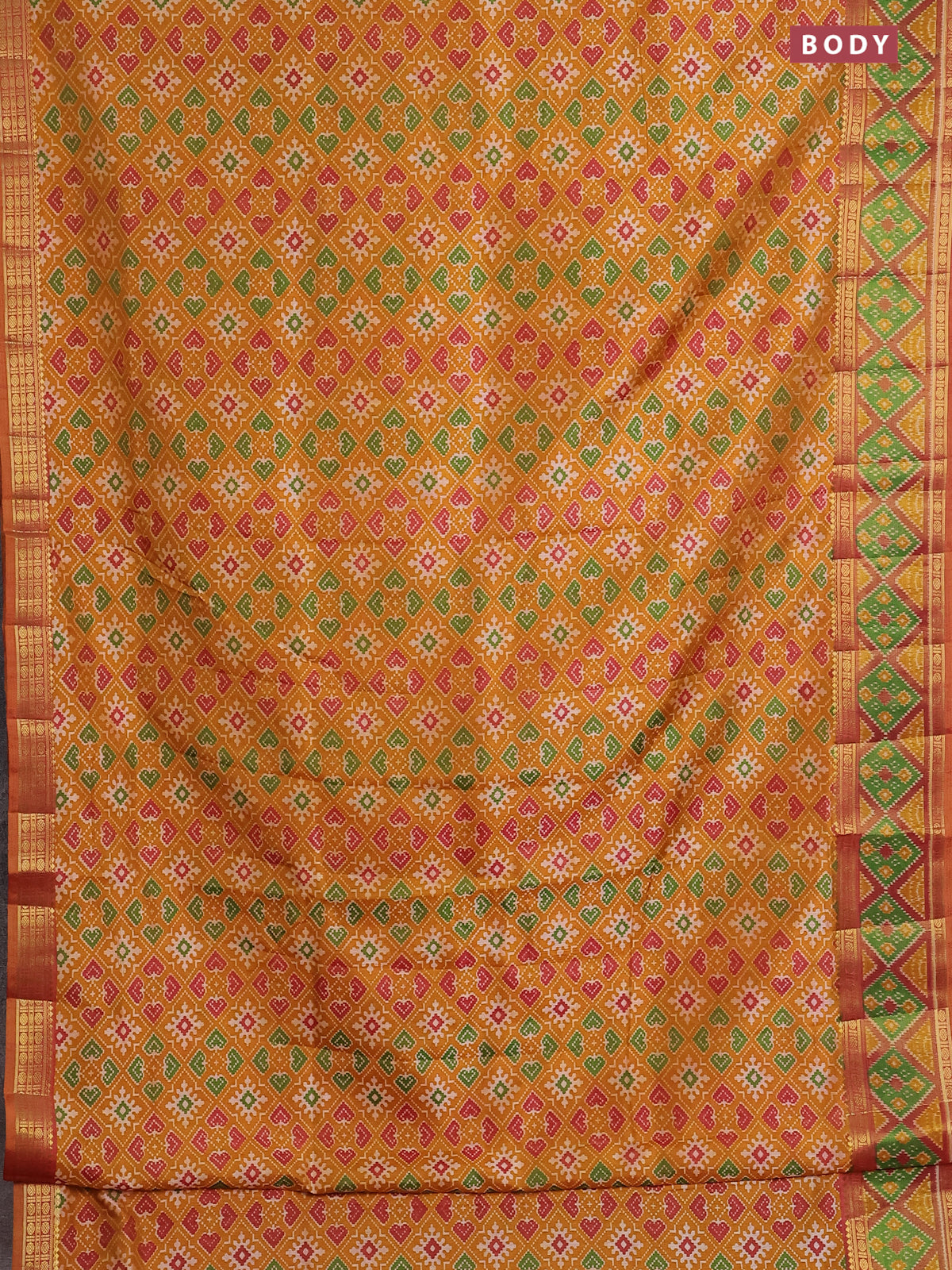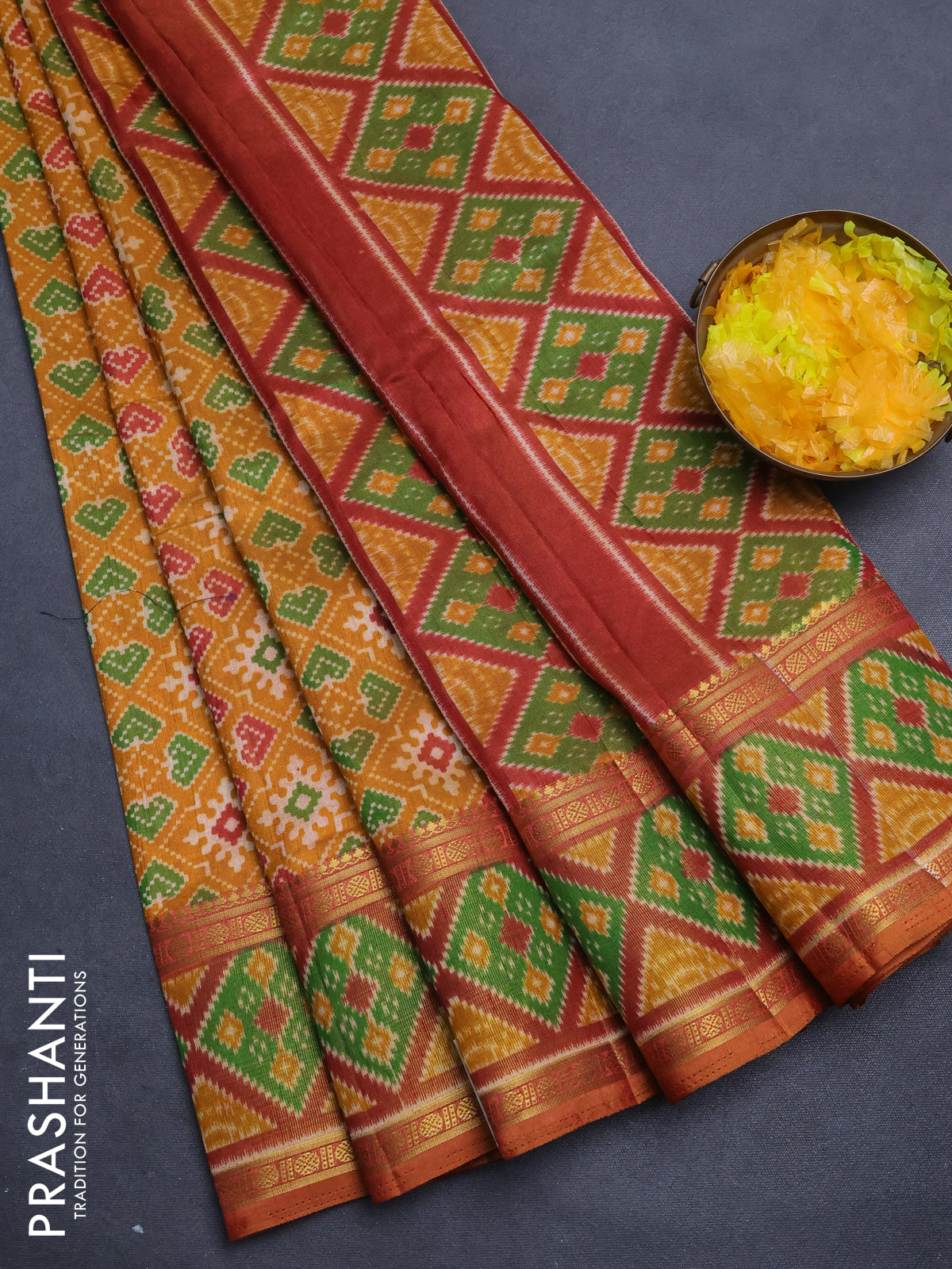 Semi tussar saree dark mustard with allover ikat prints and zari woven border