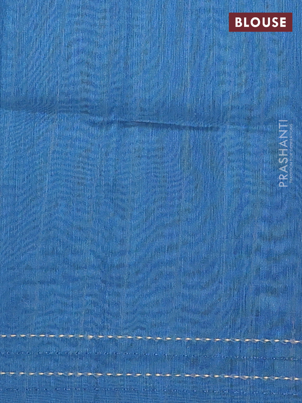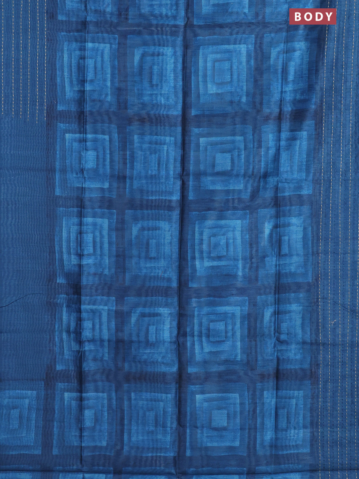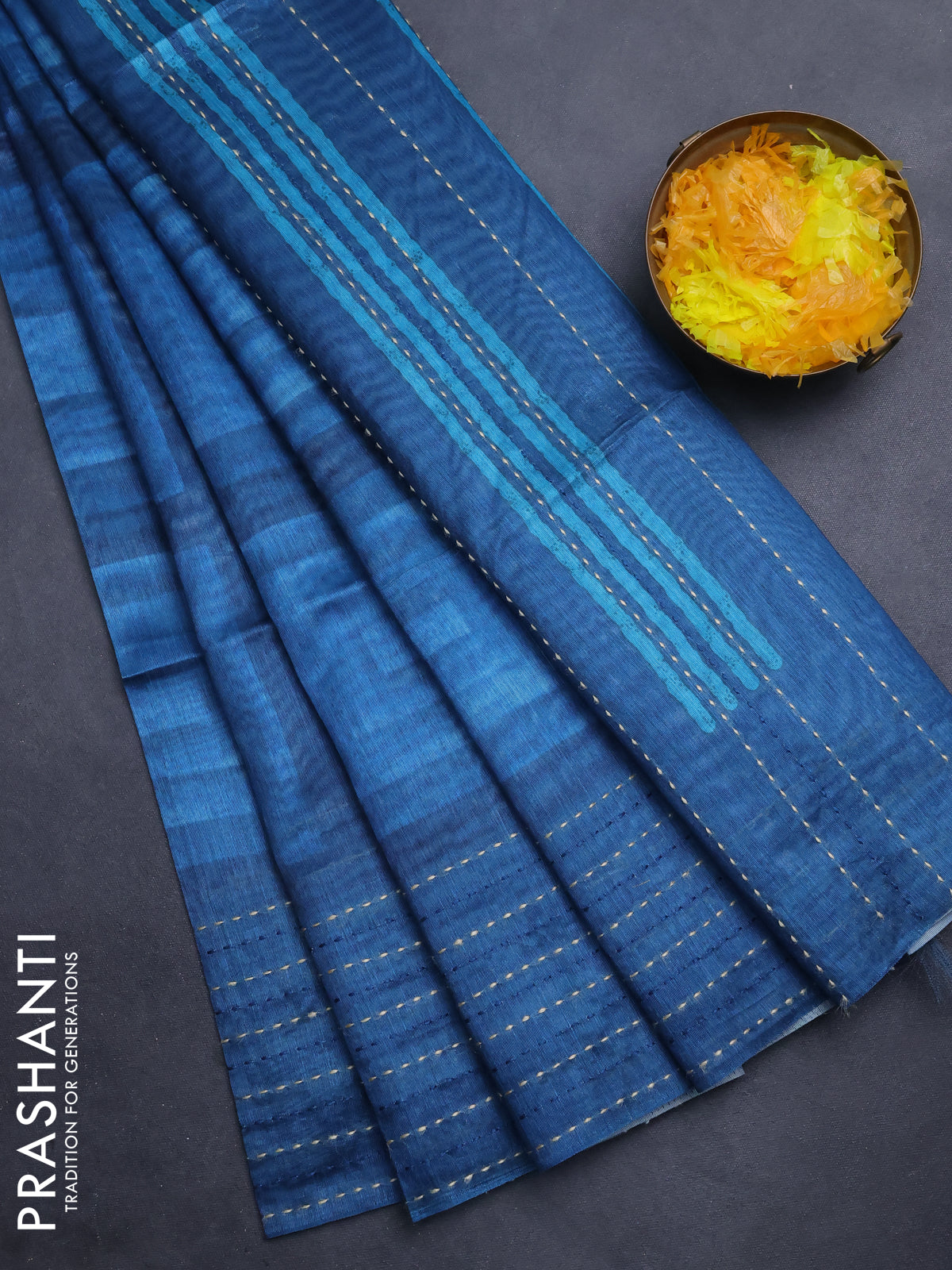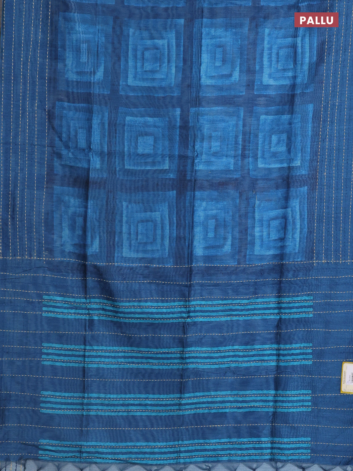 Semi tussar saree cs blue with allover geometric prints and katha stitch work pallu & border