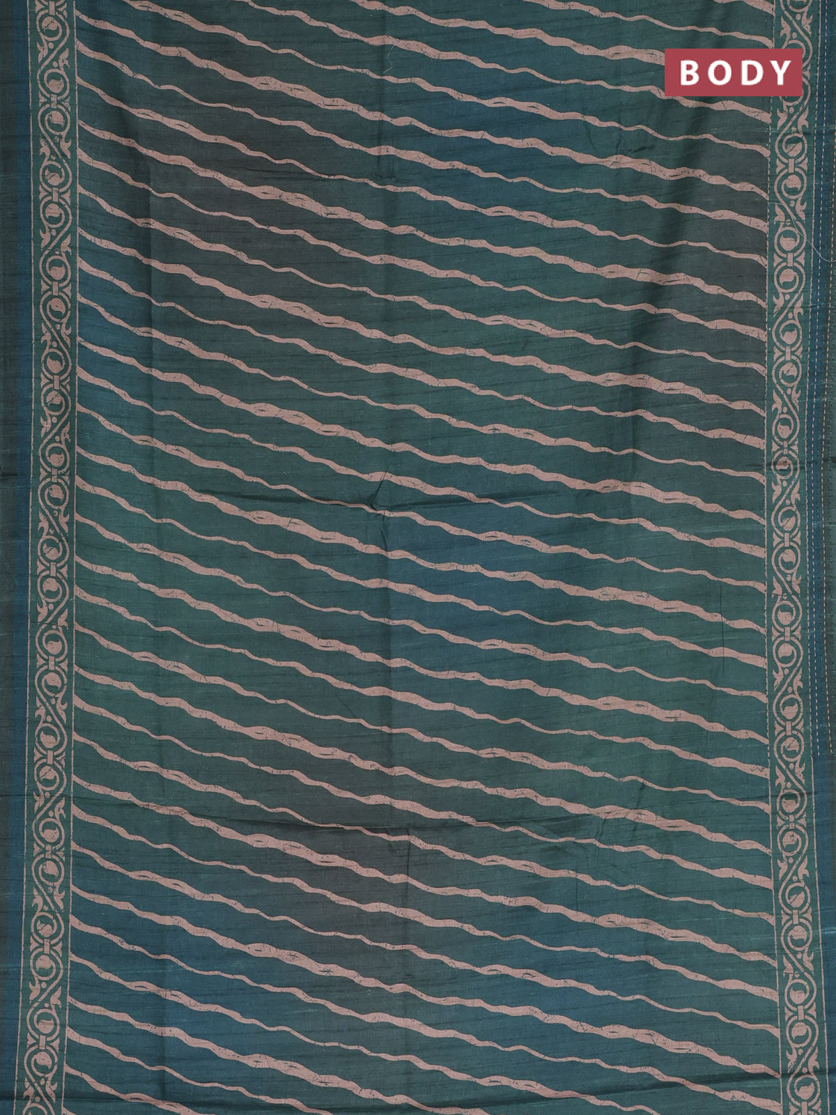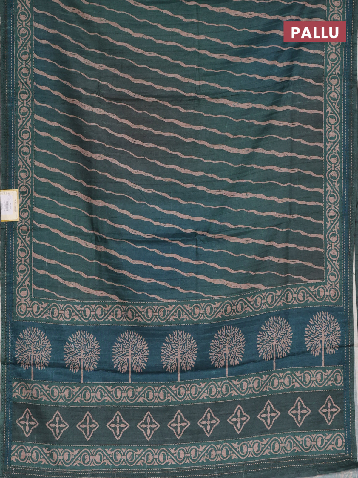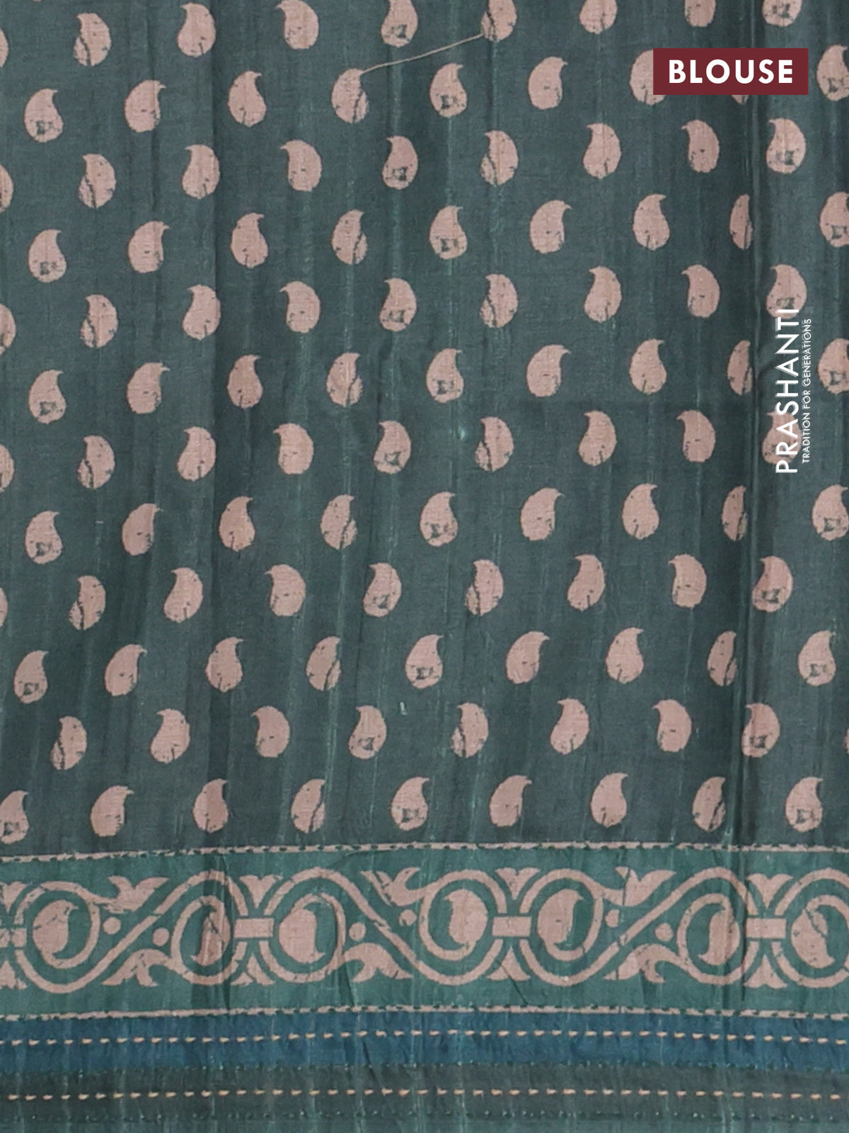 Semi tussar saree dark green with allover stripes pattern and kantha stitch work border
