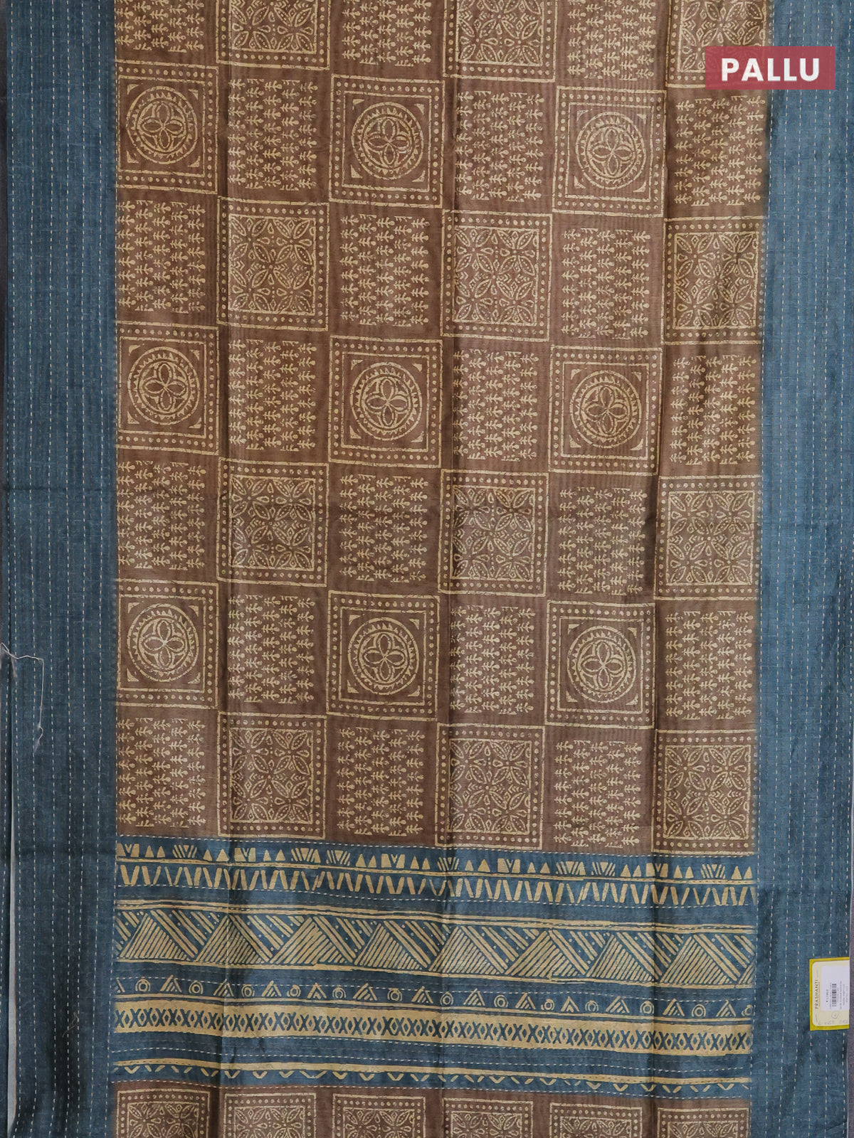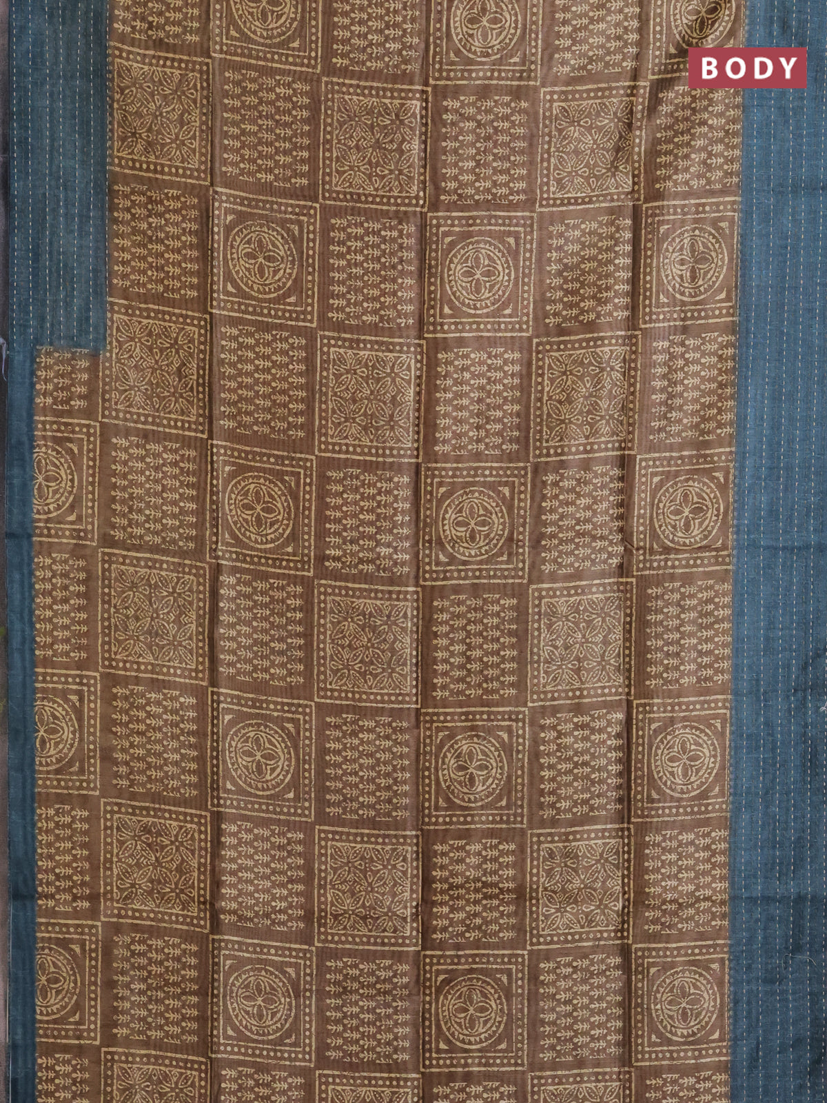 Semi tussar saree dark mehendi green and peacock blue with allover batik prints and katha stitch work pallu & border