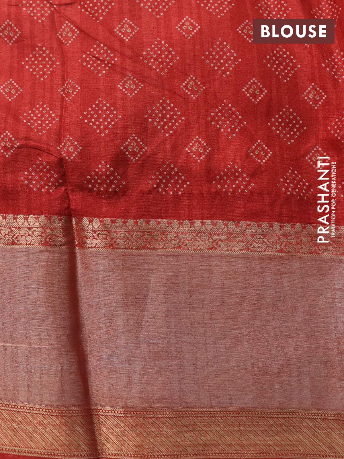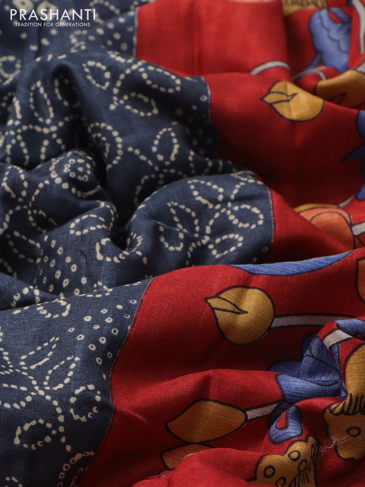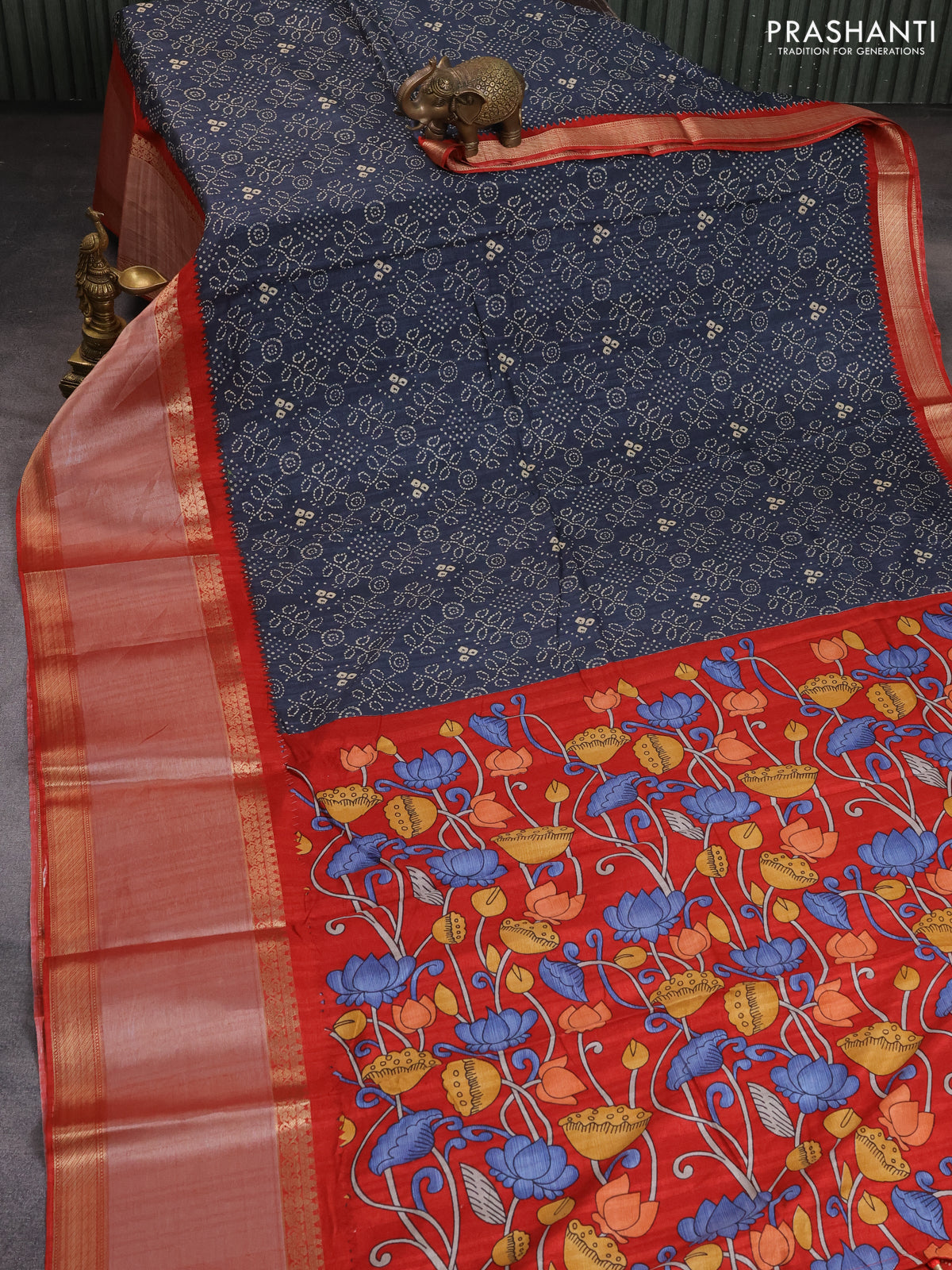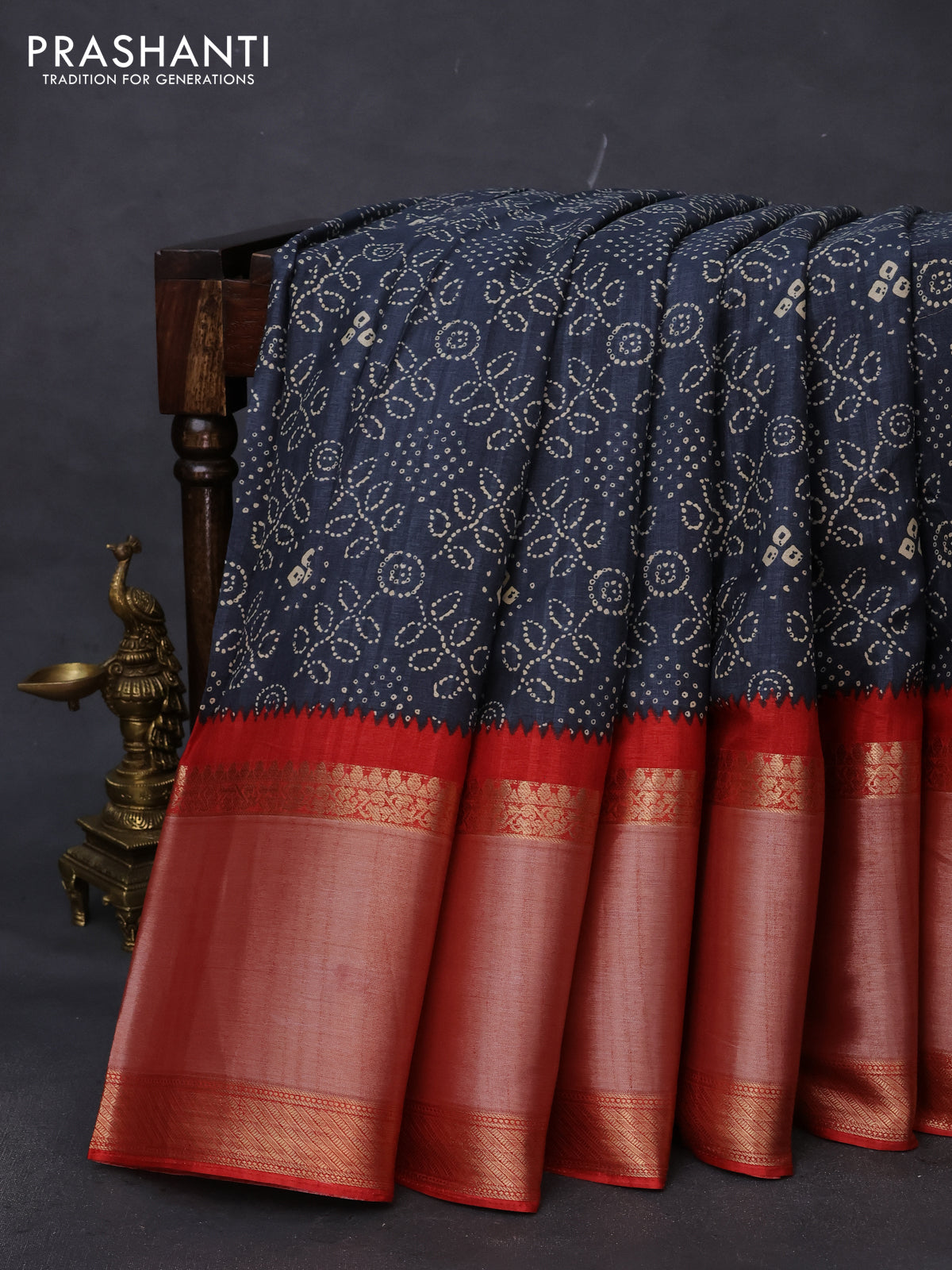 Semi tussar saree dark peacock blue and red with allover bandhani prints and long zari woven border