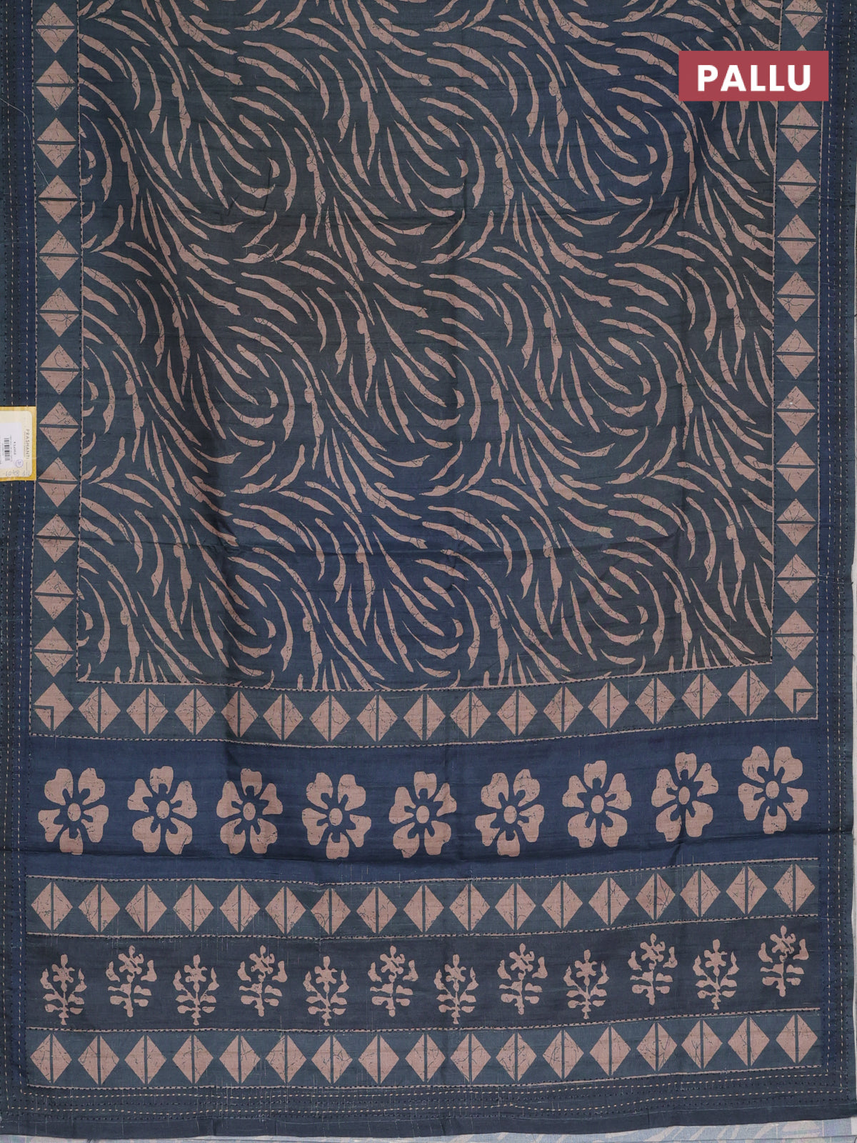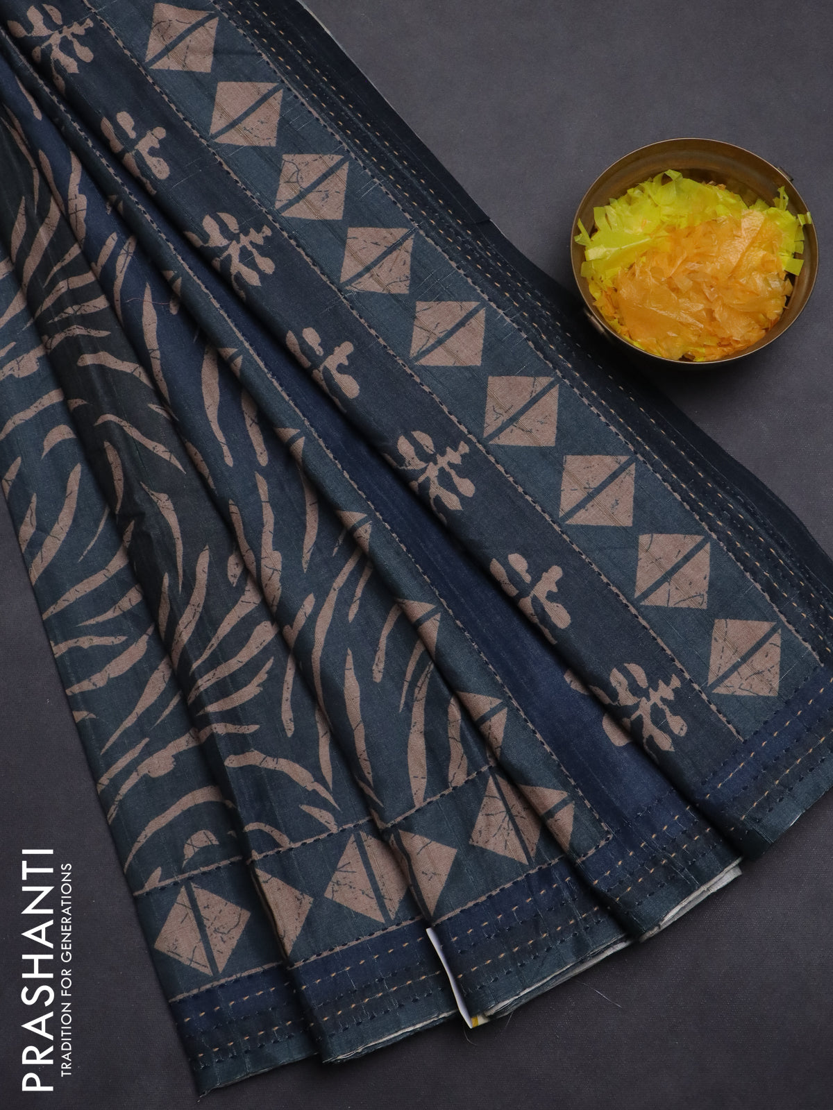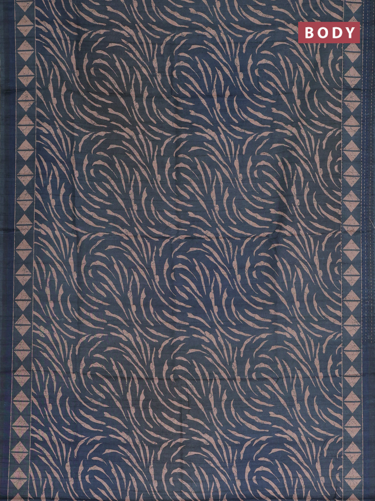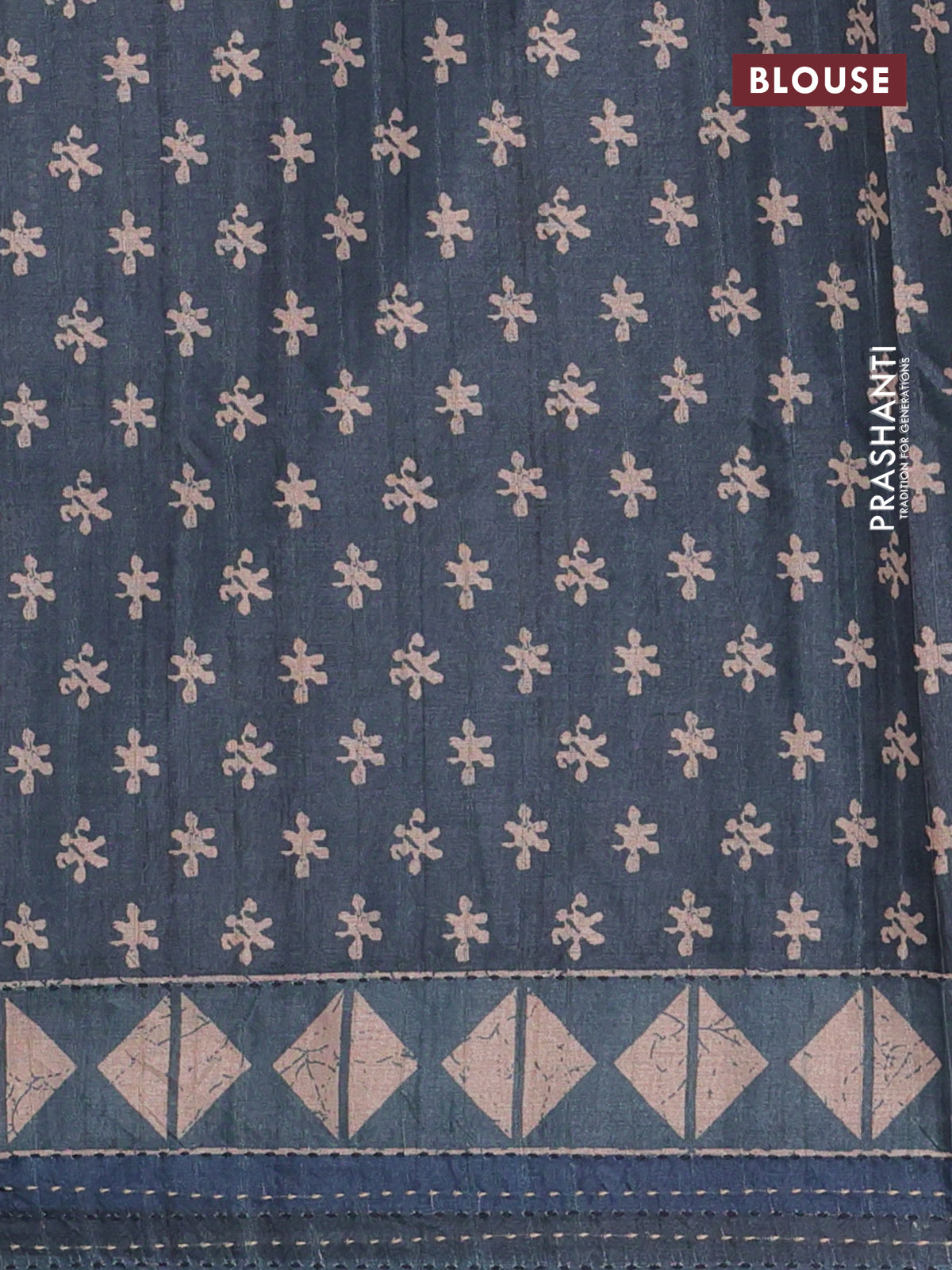 Semi tussar saree dark peacock blue with allover prints and kantha stitch work border