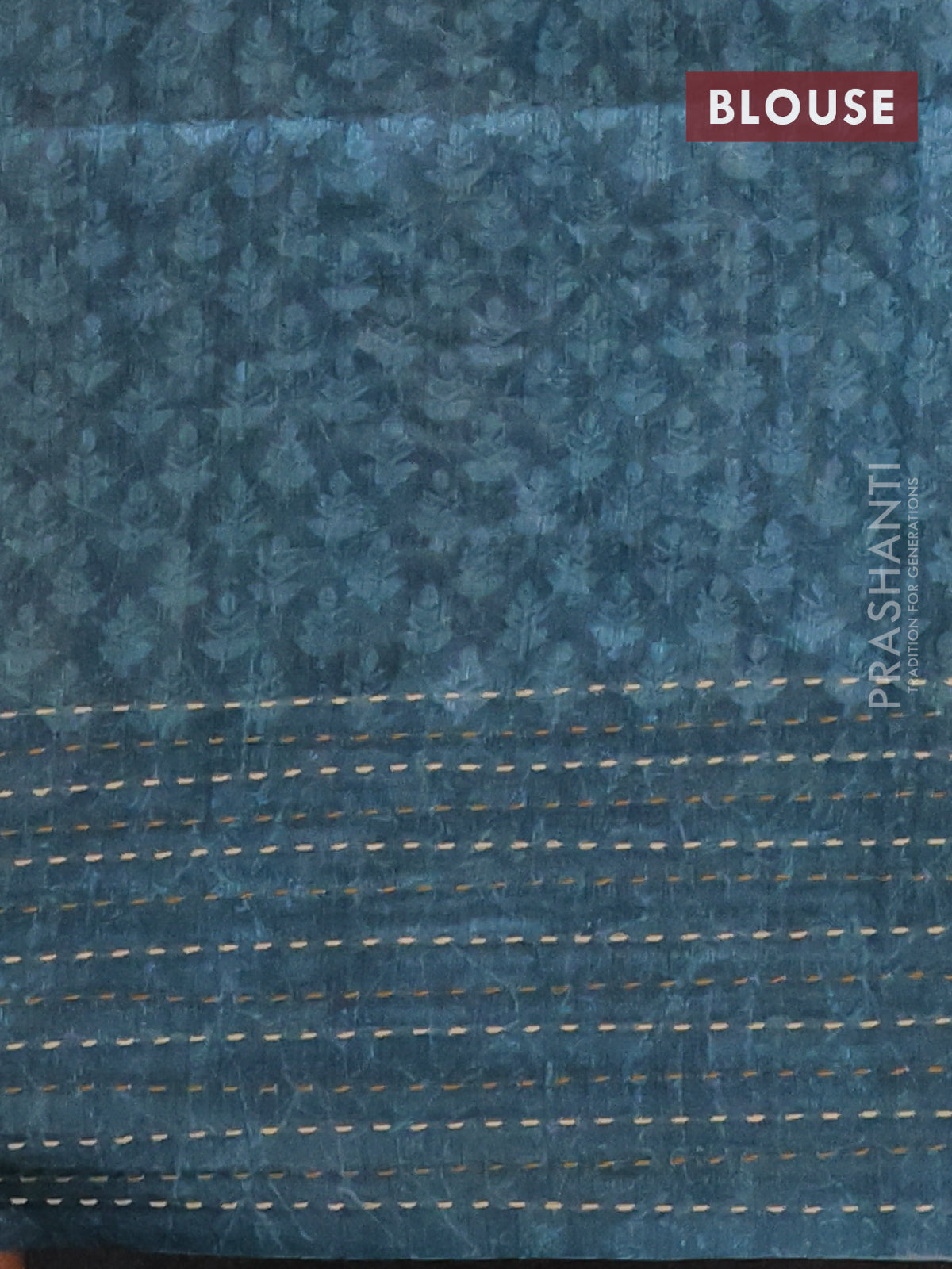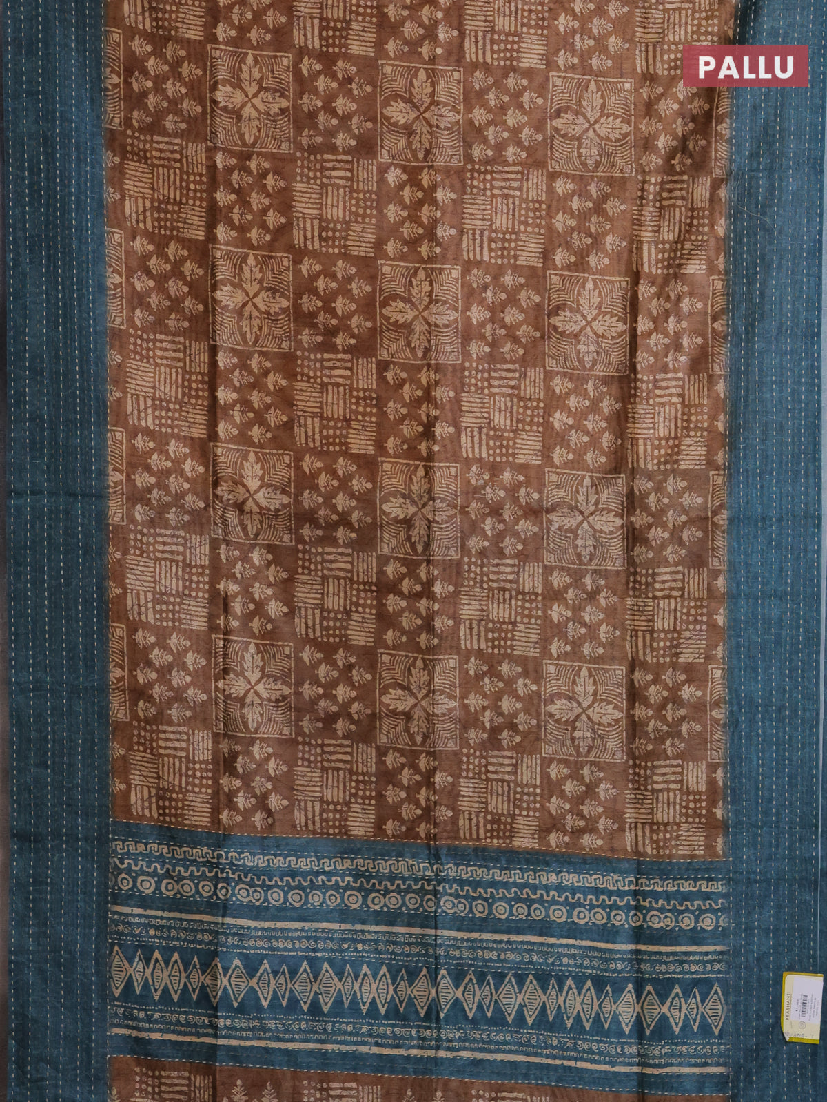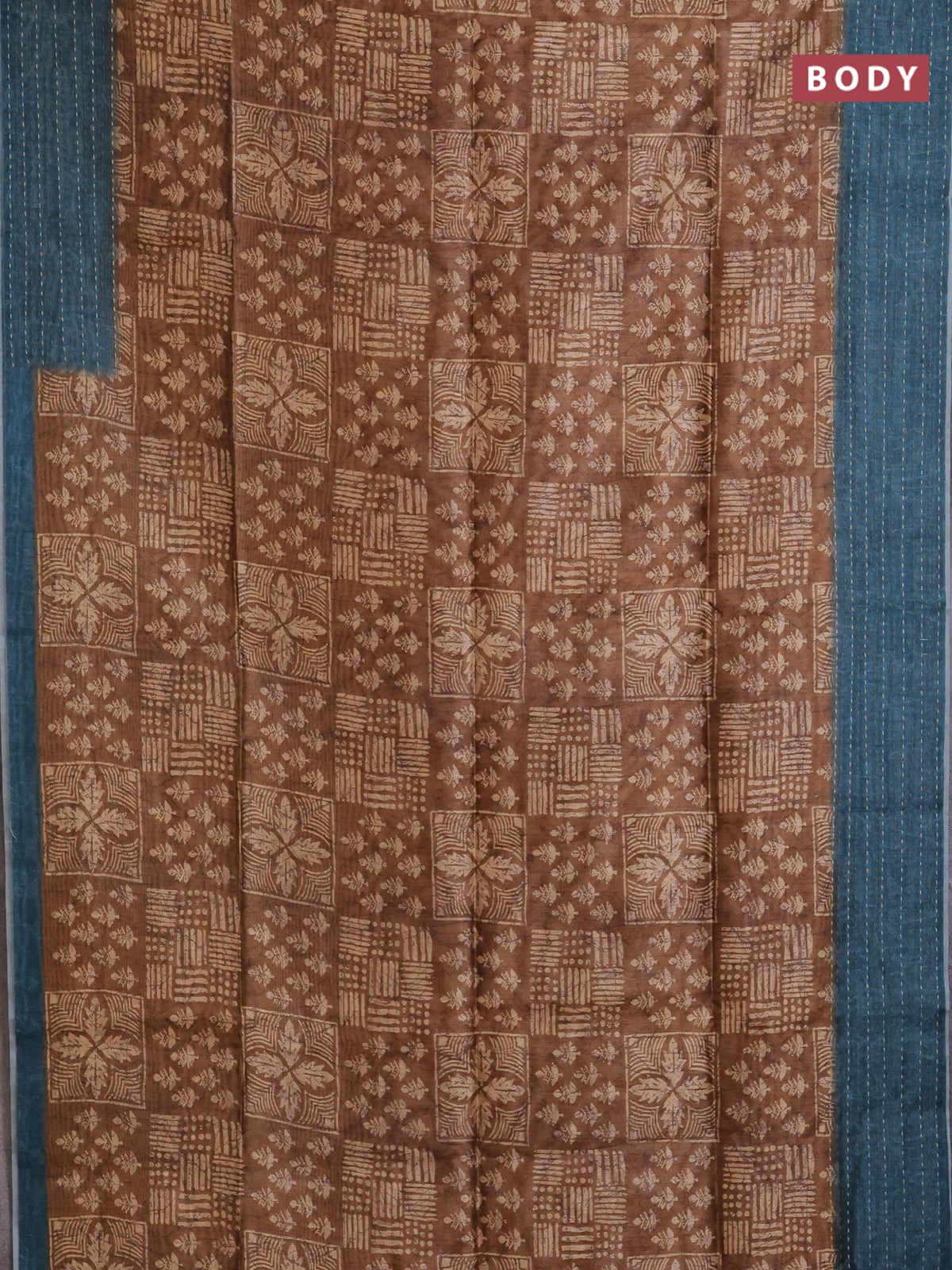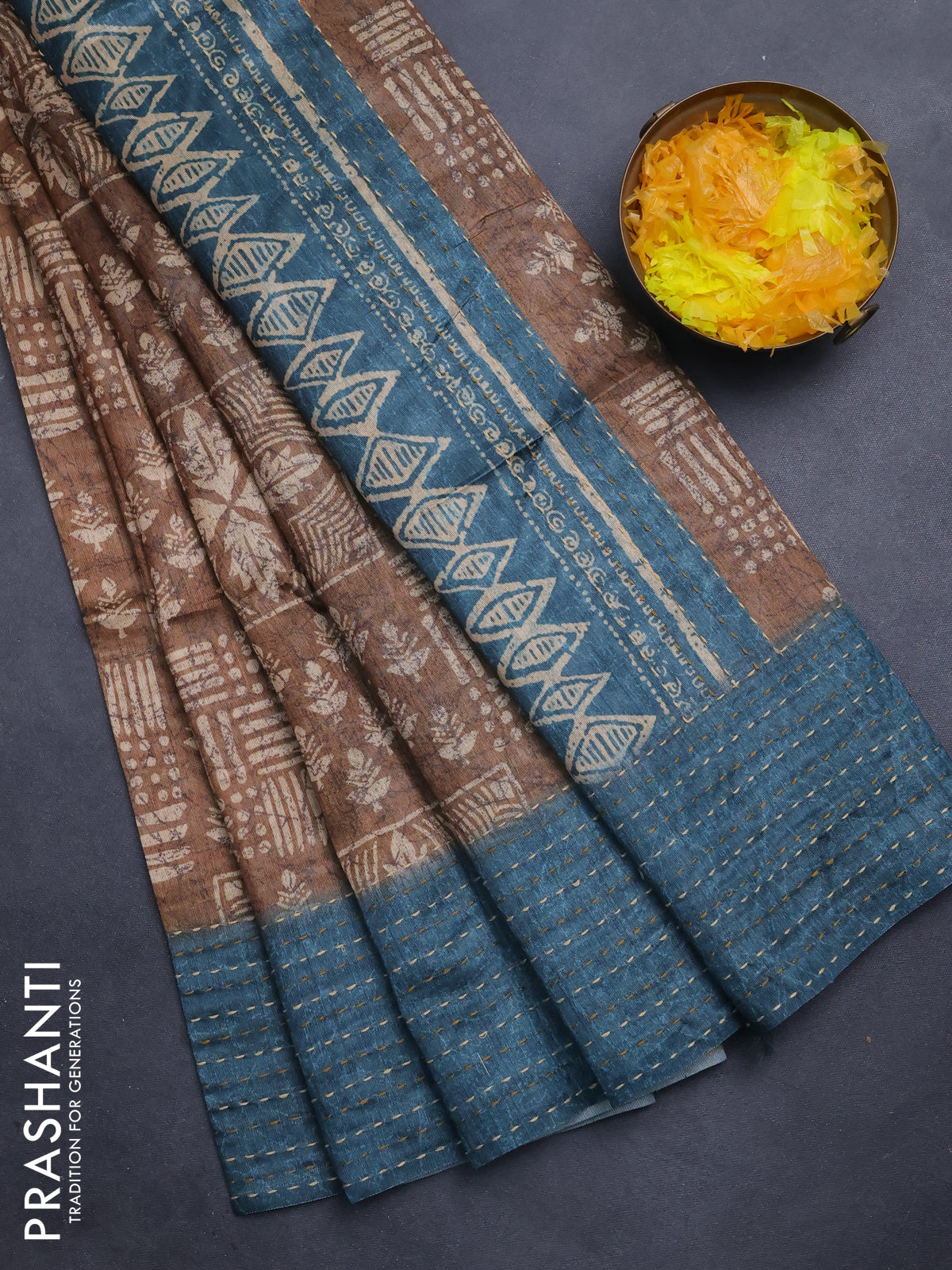 Semi tussar saree dark sandal and peacock blue with allover batik prints and katha stitch work pallu & border