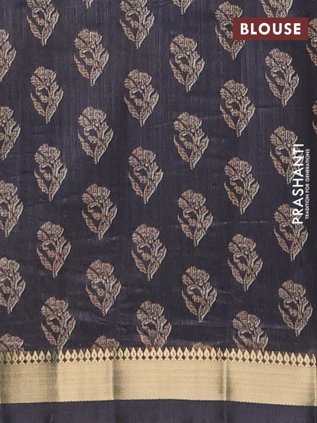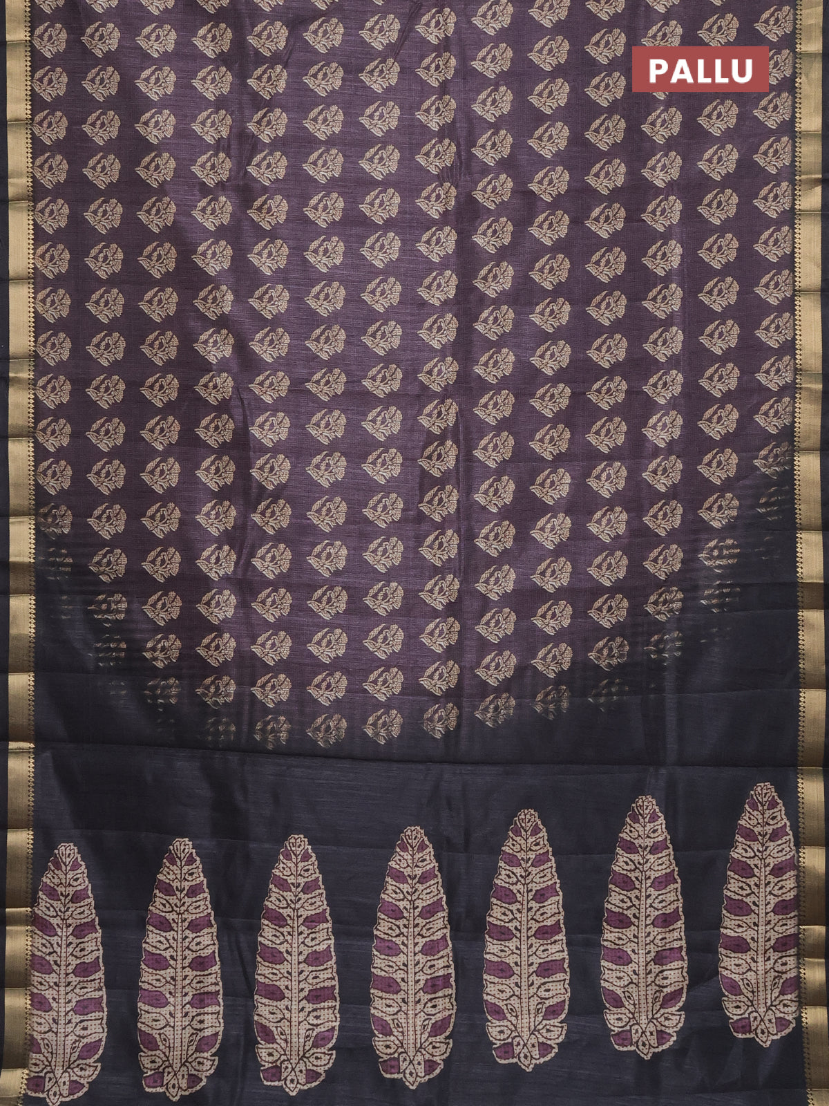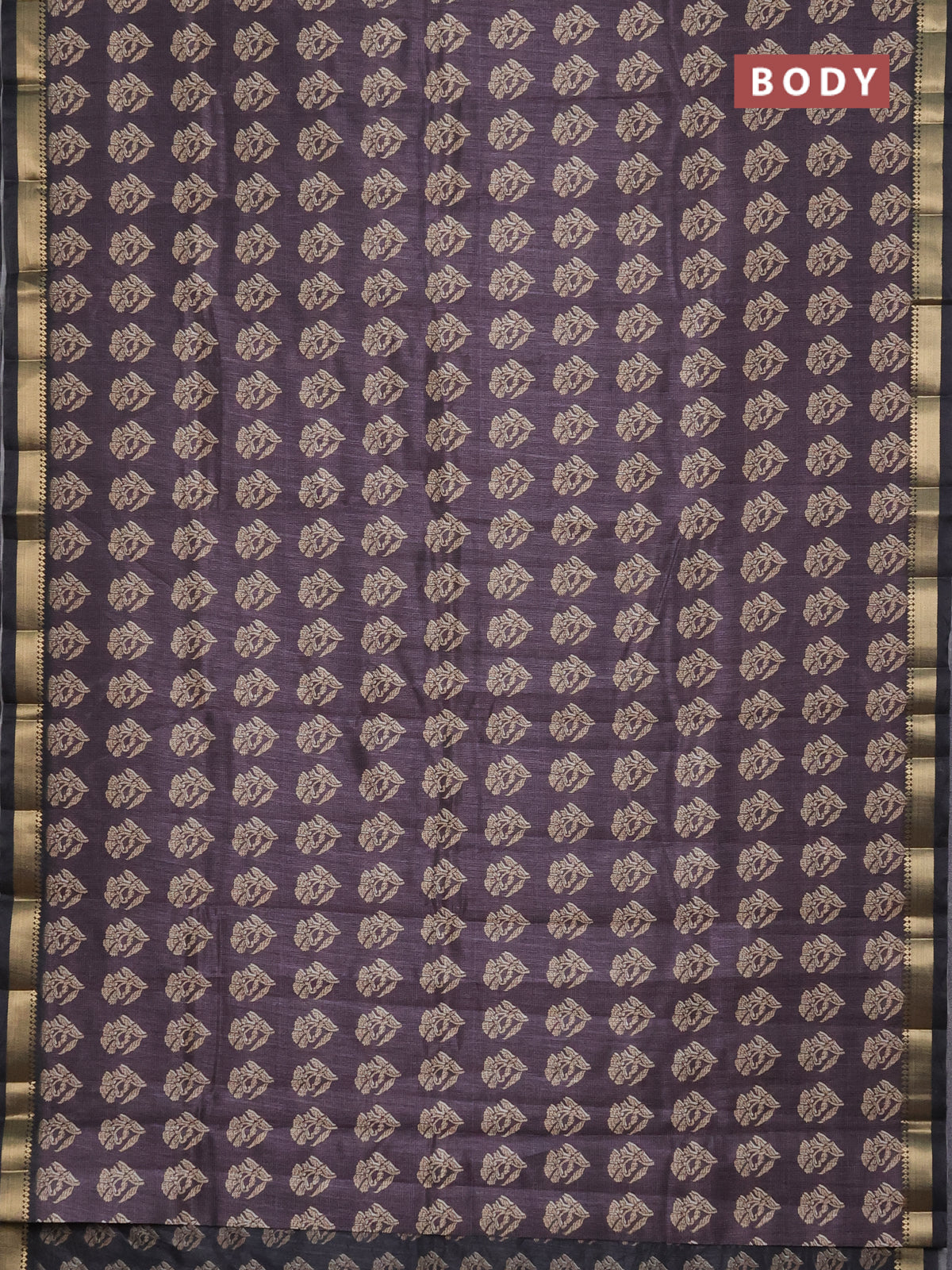 Semi tussar saree deep jamun and elephant grey with butta prints and zari woven border