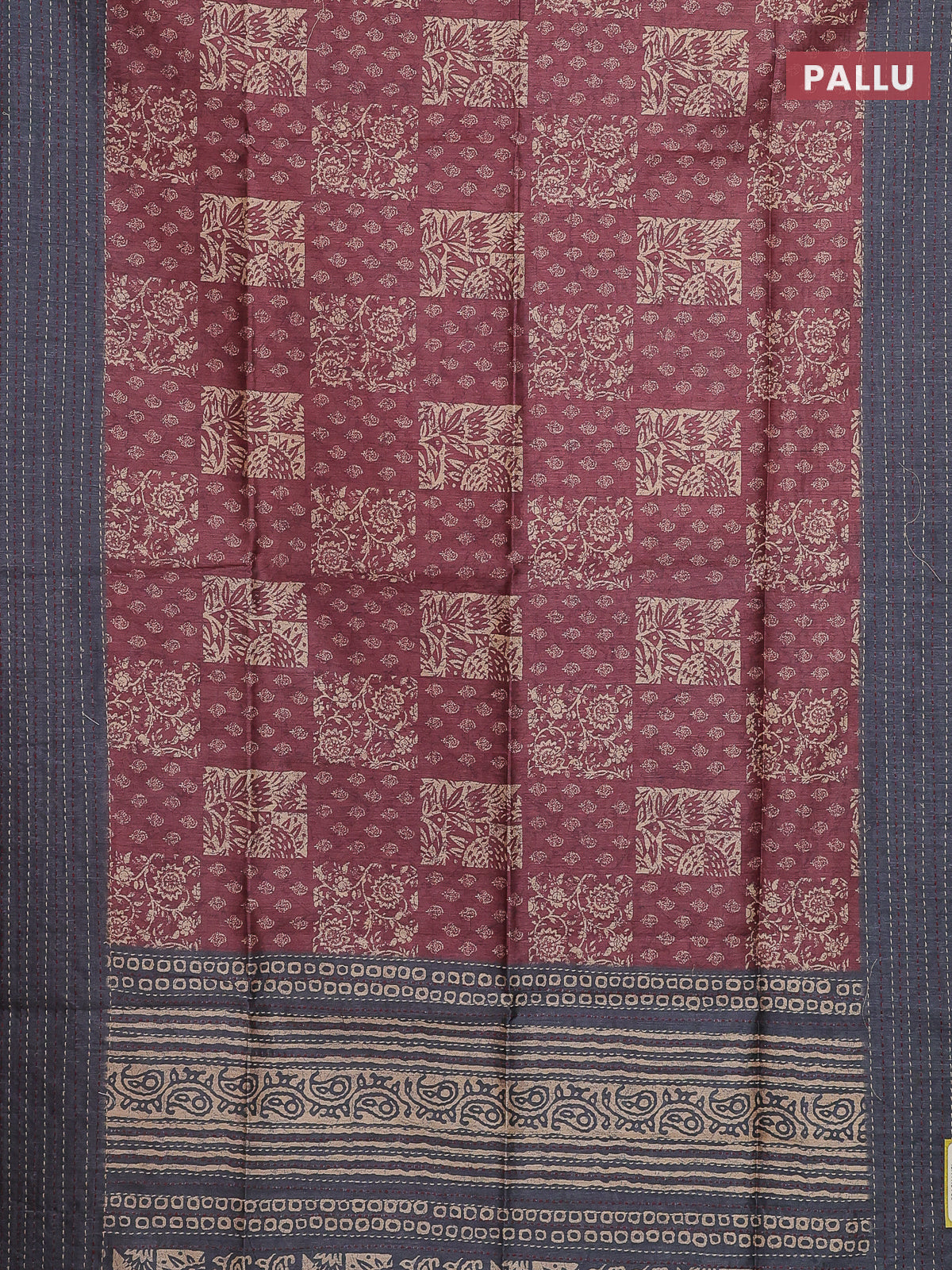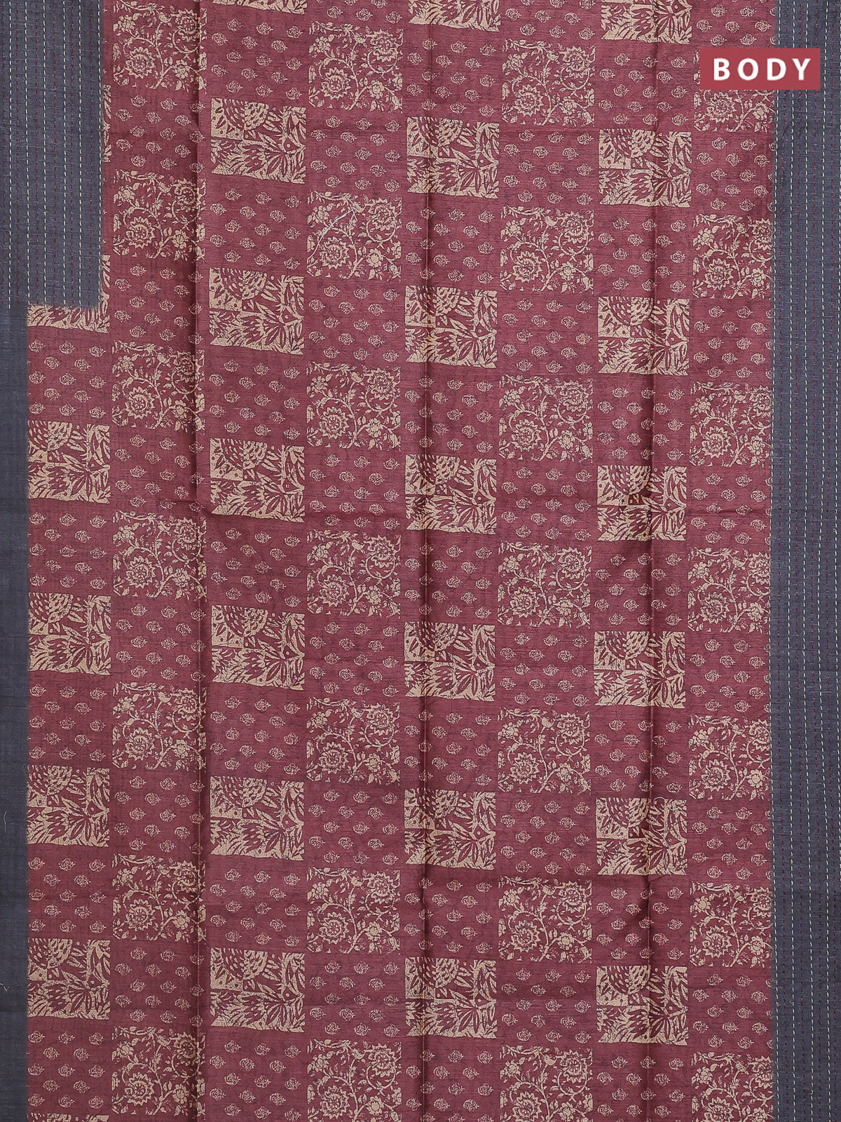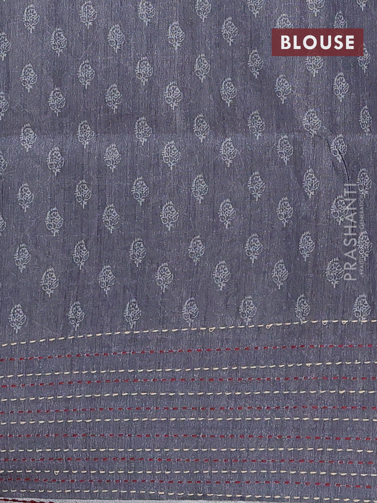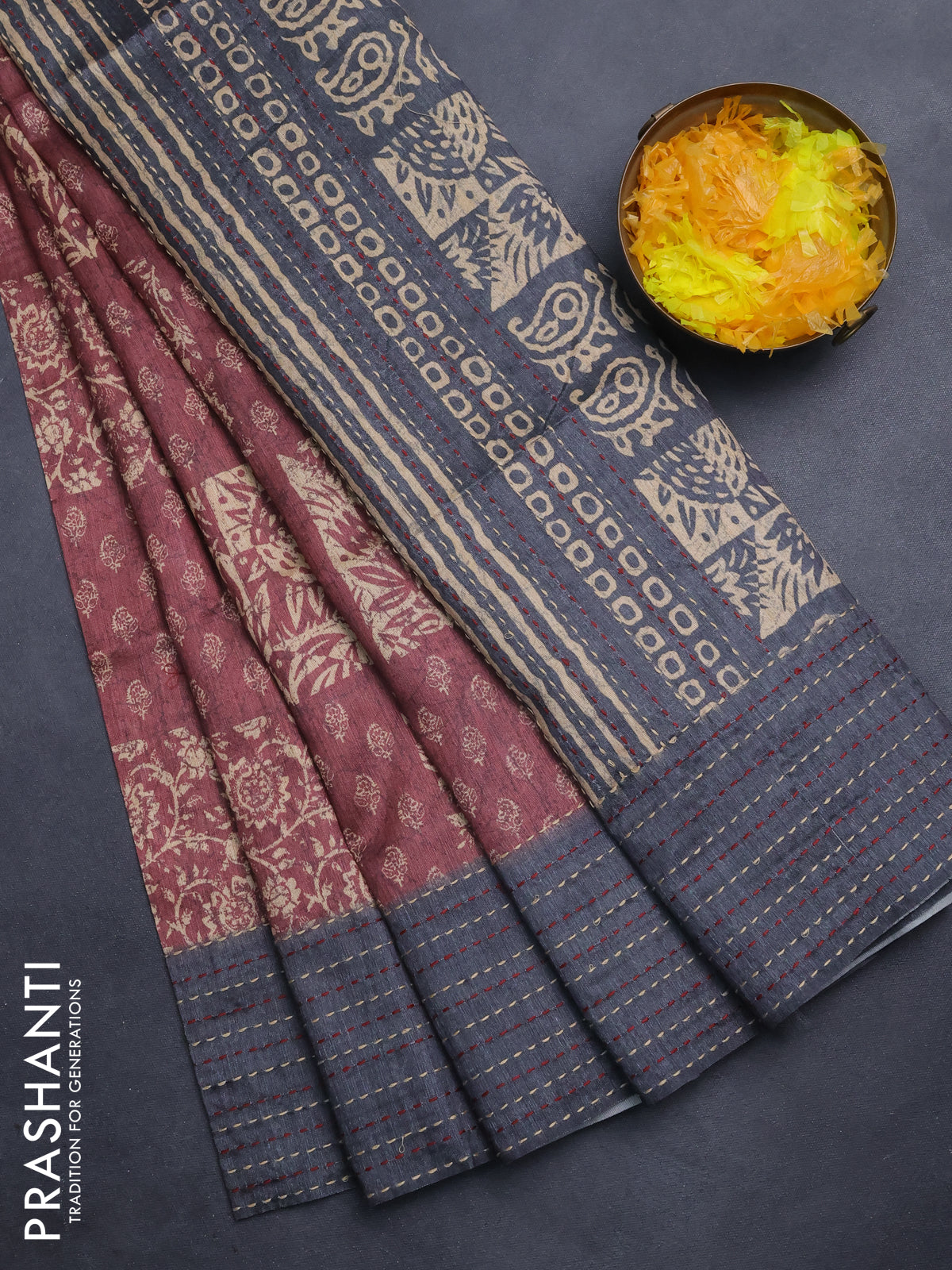 Semi tussar saree green and greyish brown with allover batik prints and katha stitch work pallu & border