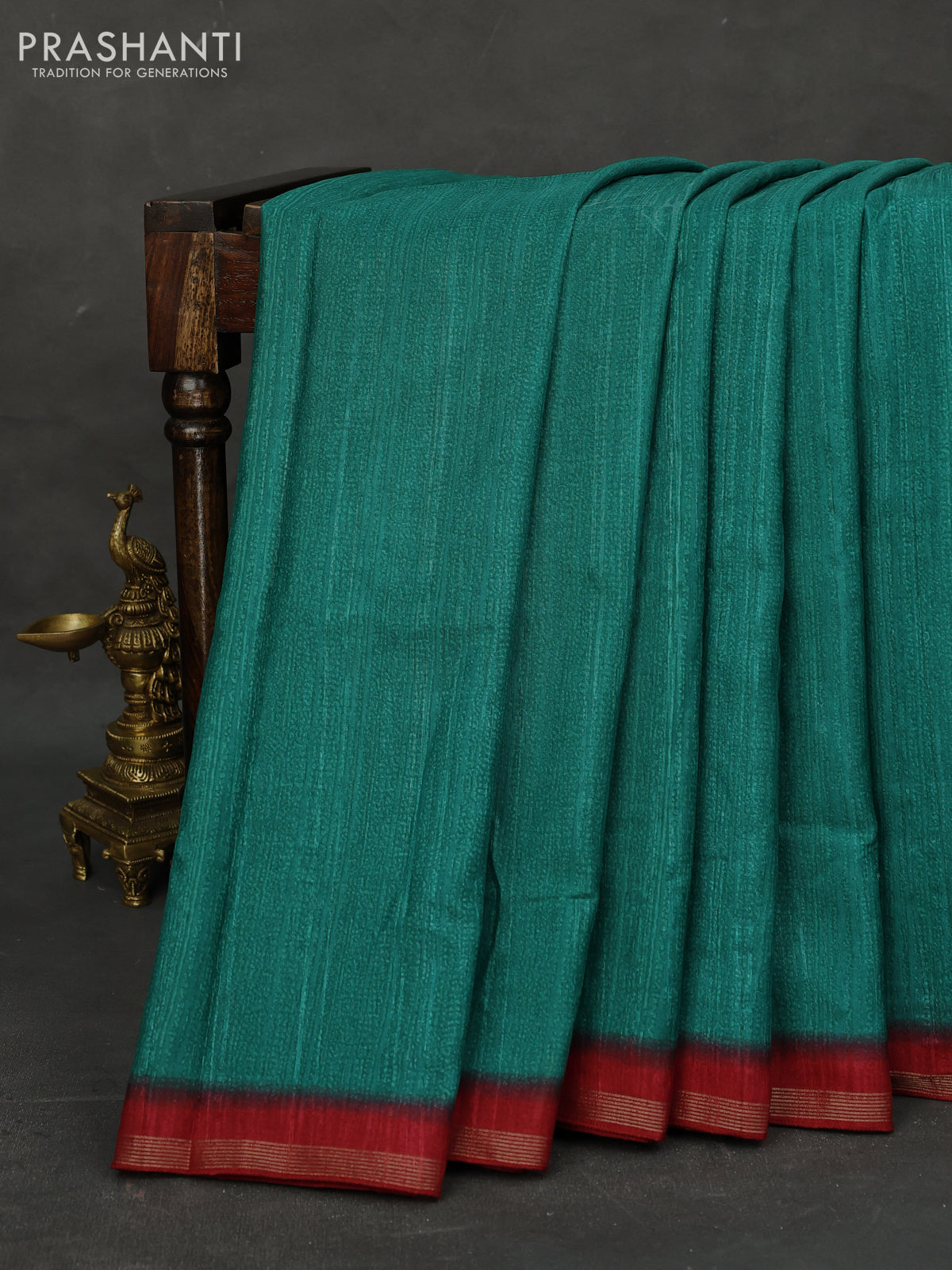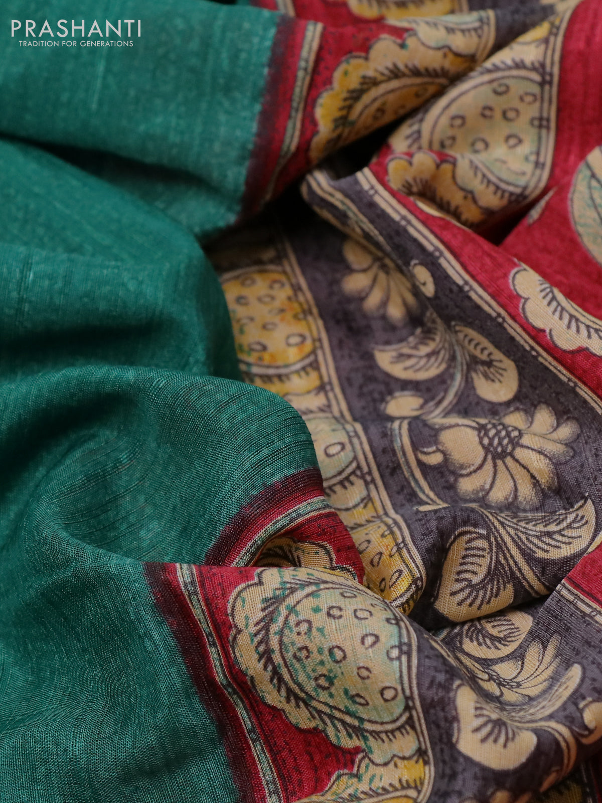 Semi tussar saree green and maroon with plain body and kalamkari printed pallu