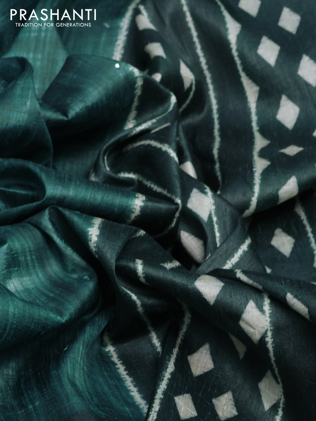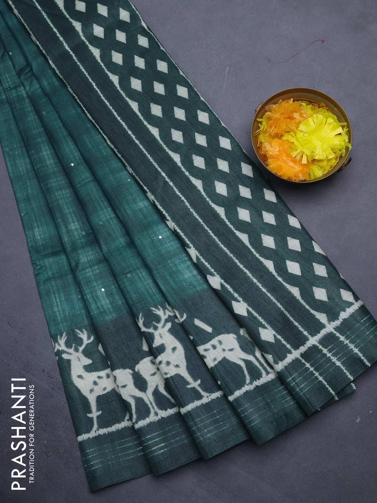 Semi tussar saree green shade with allover mirror work and printed border