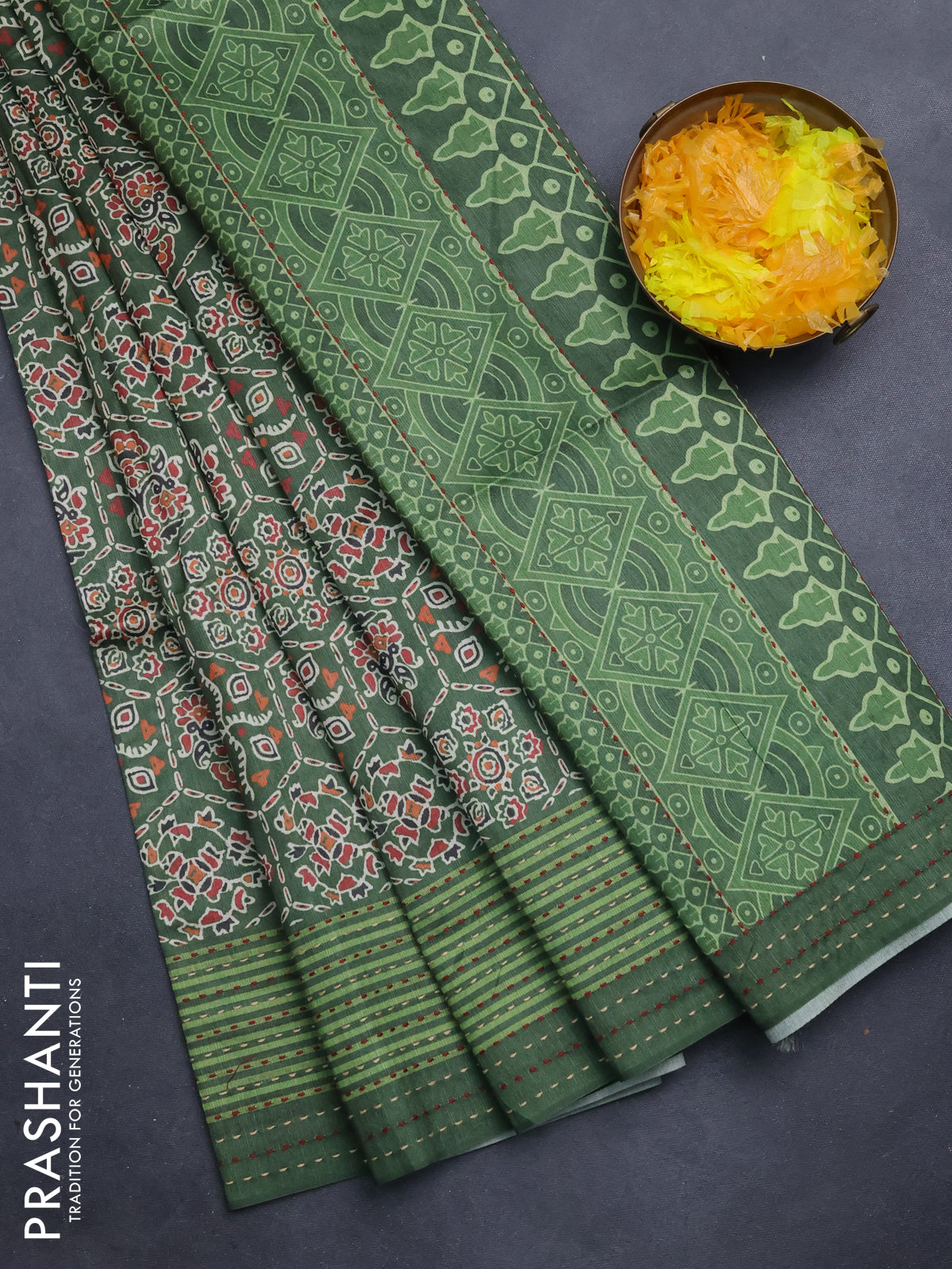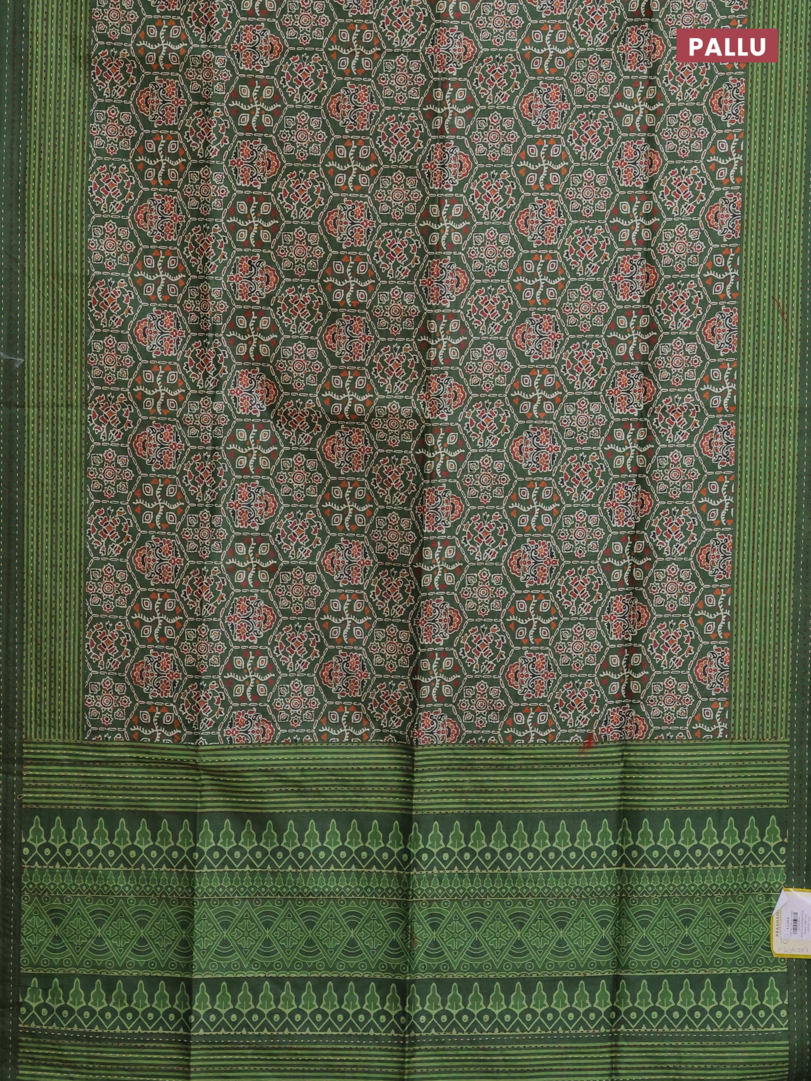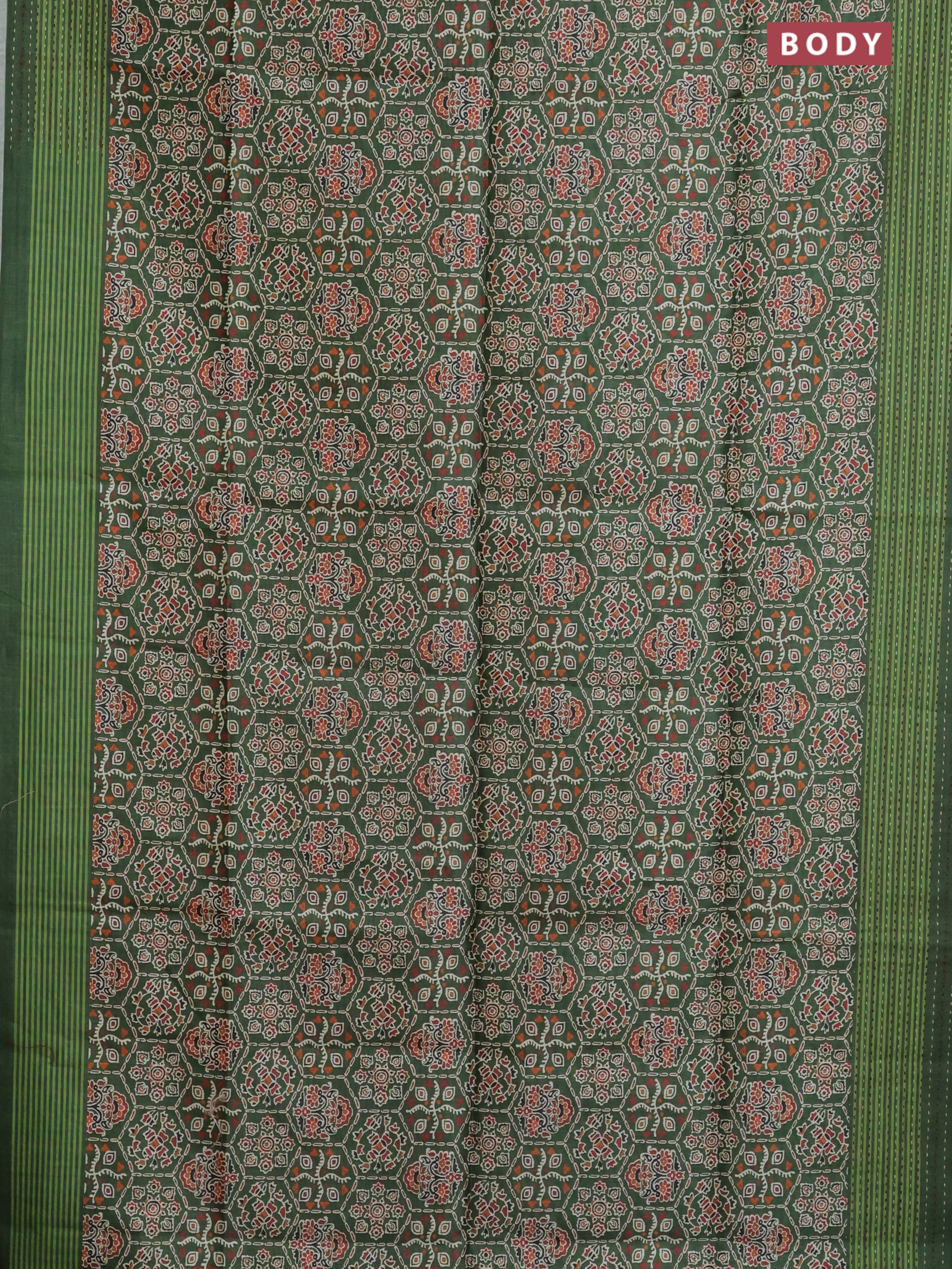 Semi tussar saree green with allover ajrakh prints and katha stitch work pallu & border
