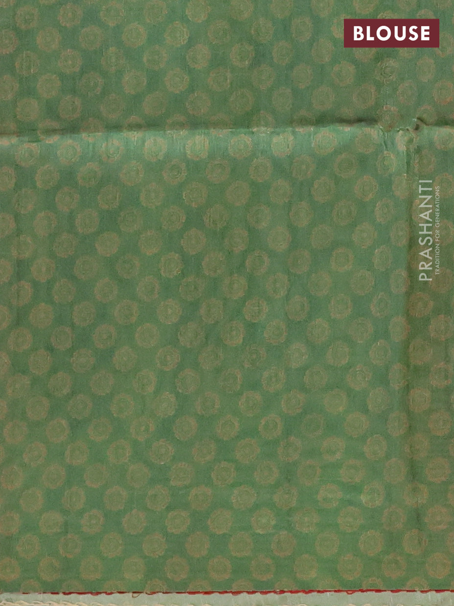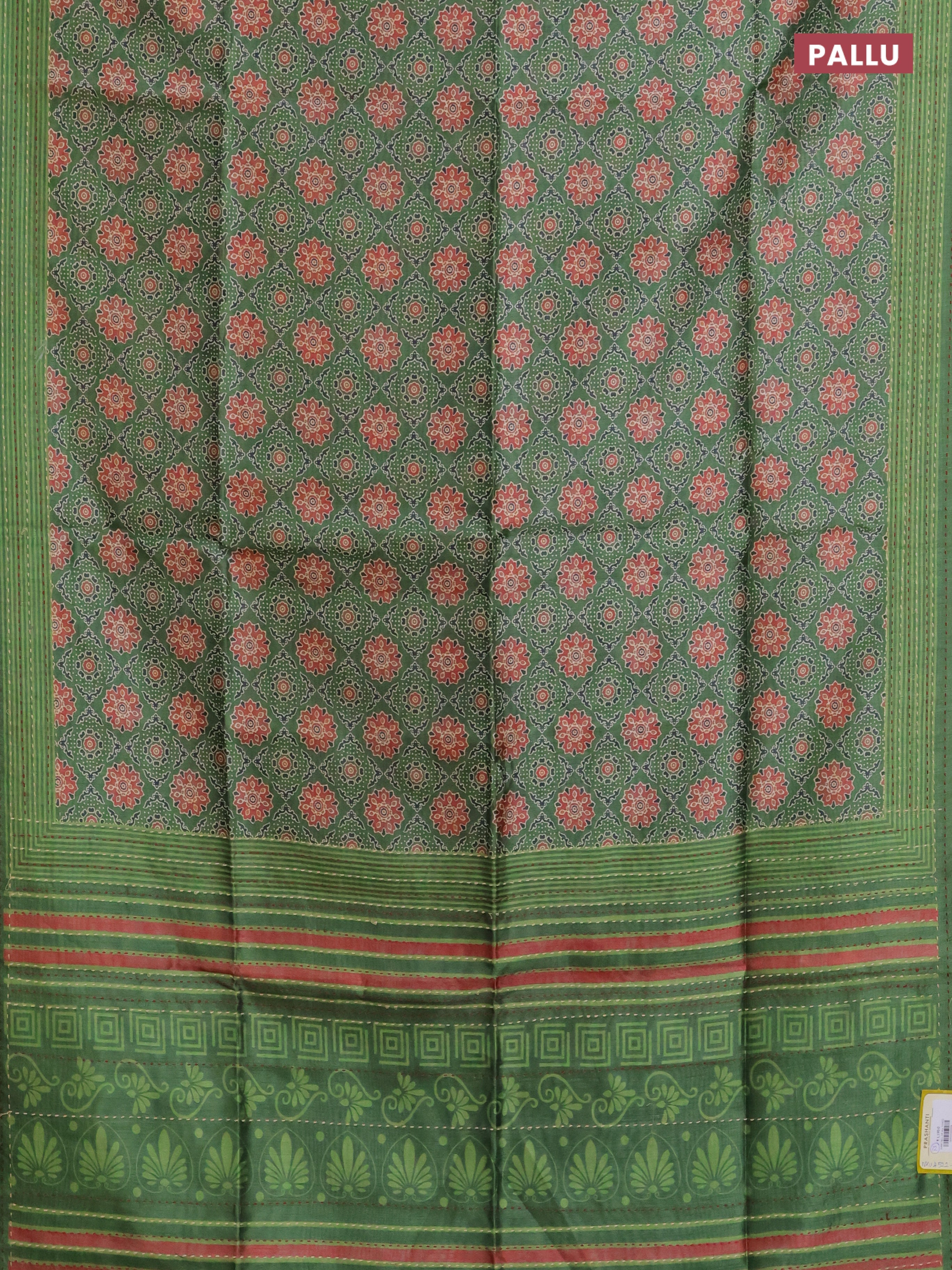 Semi tussar saree green with allover ajrakh prints and katha stitch work pallu & border
