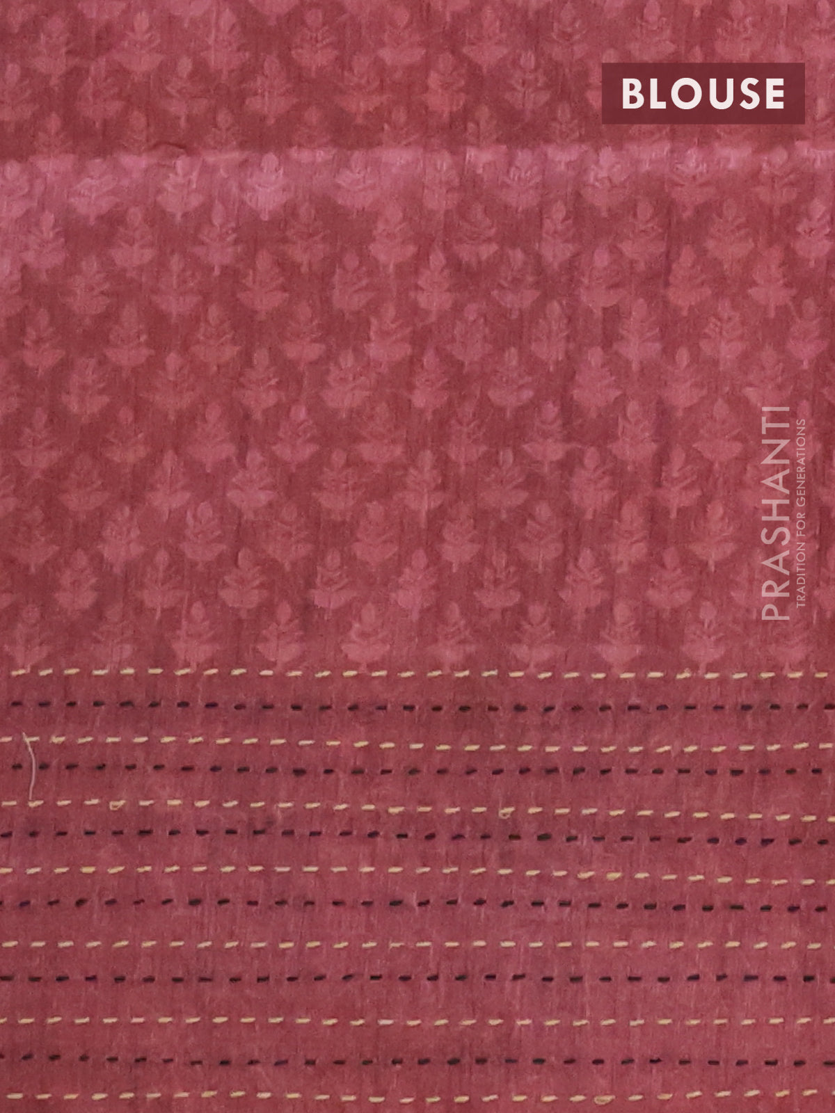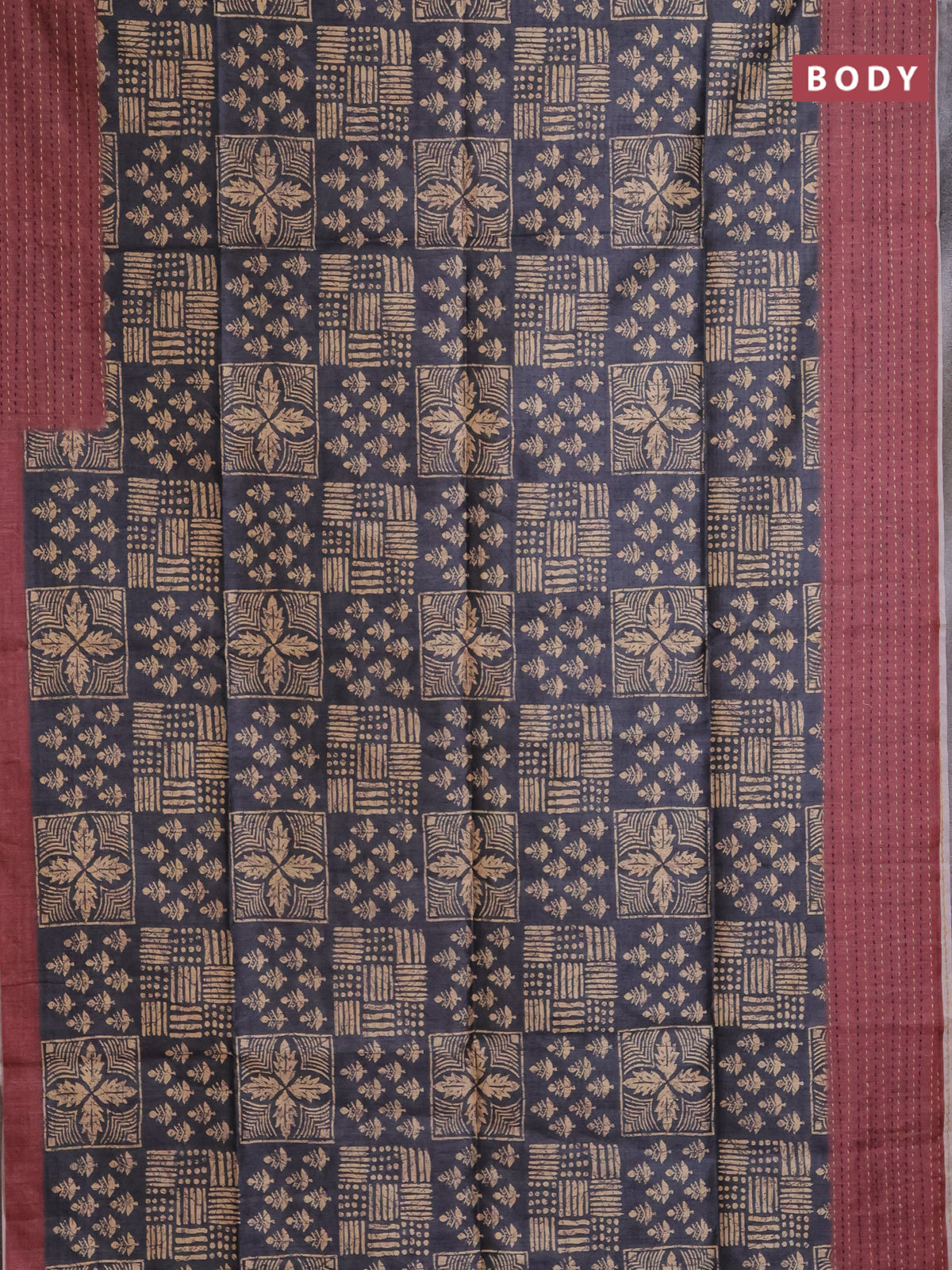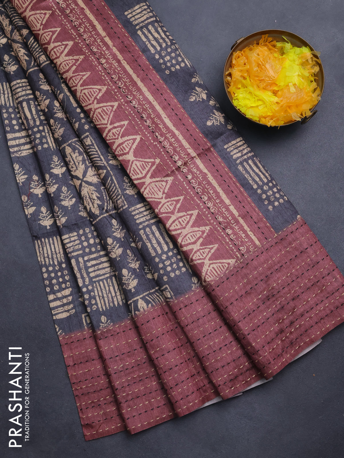 Semi tussar saree grey and maroon shade with allover batik prints and katha stitch work pallu & border