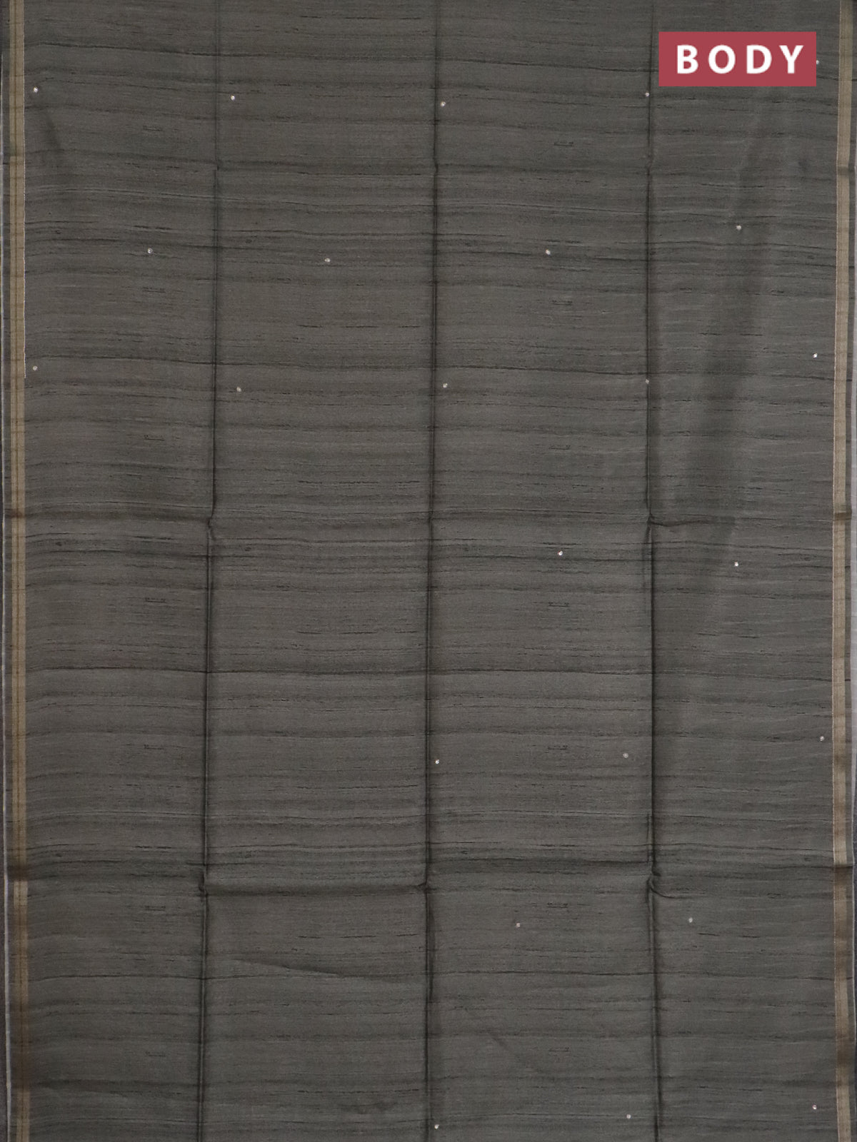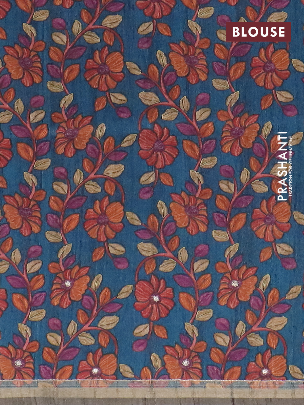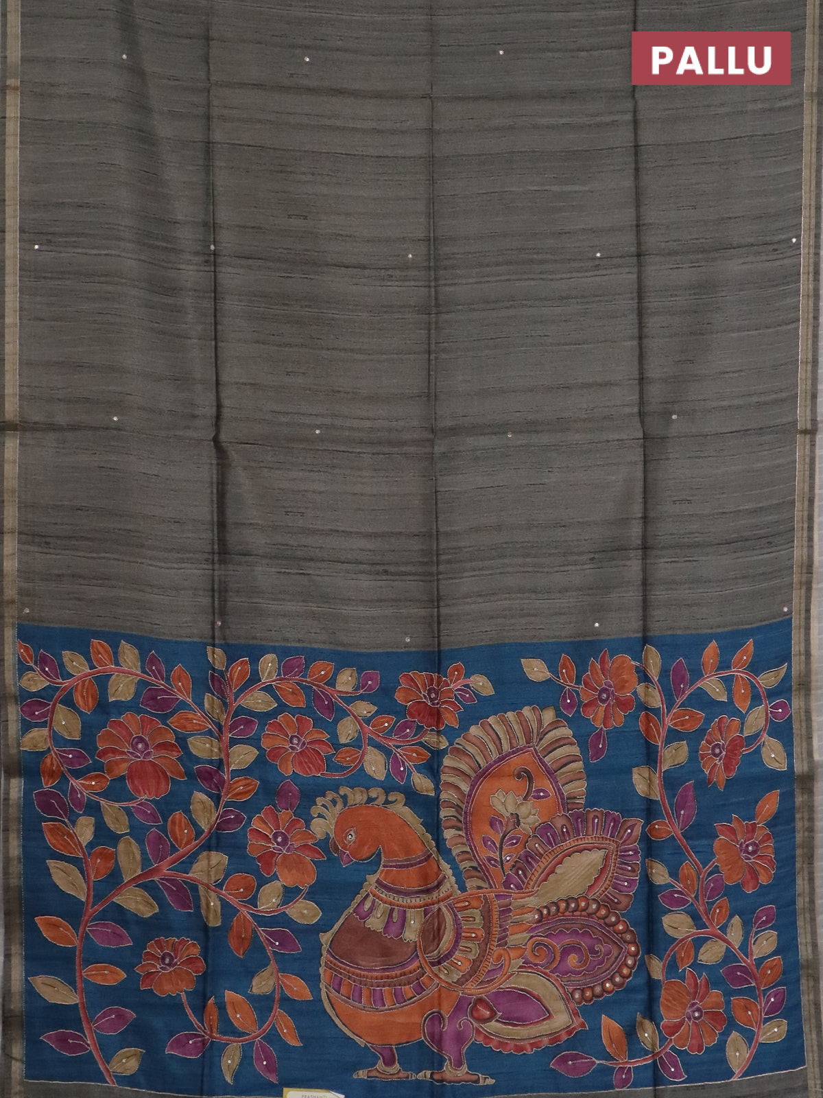 Semi tussar saree grey and peacock blue with embroidery buttas and kalamkari prints & pita work pallu