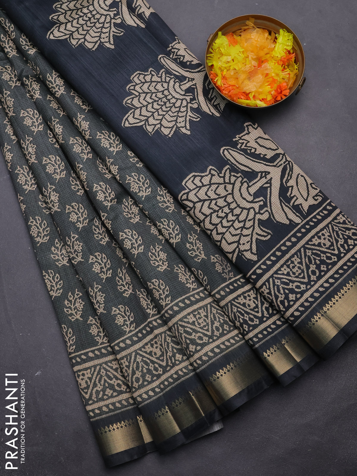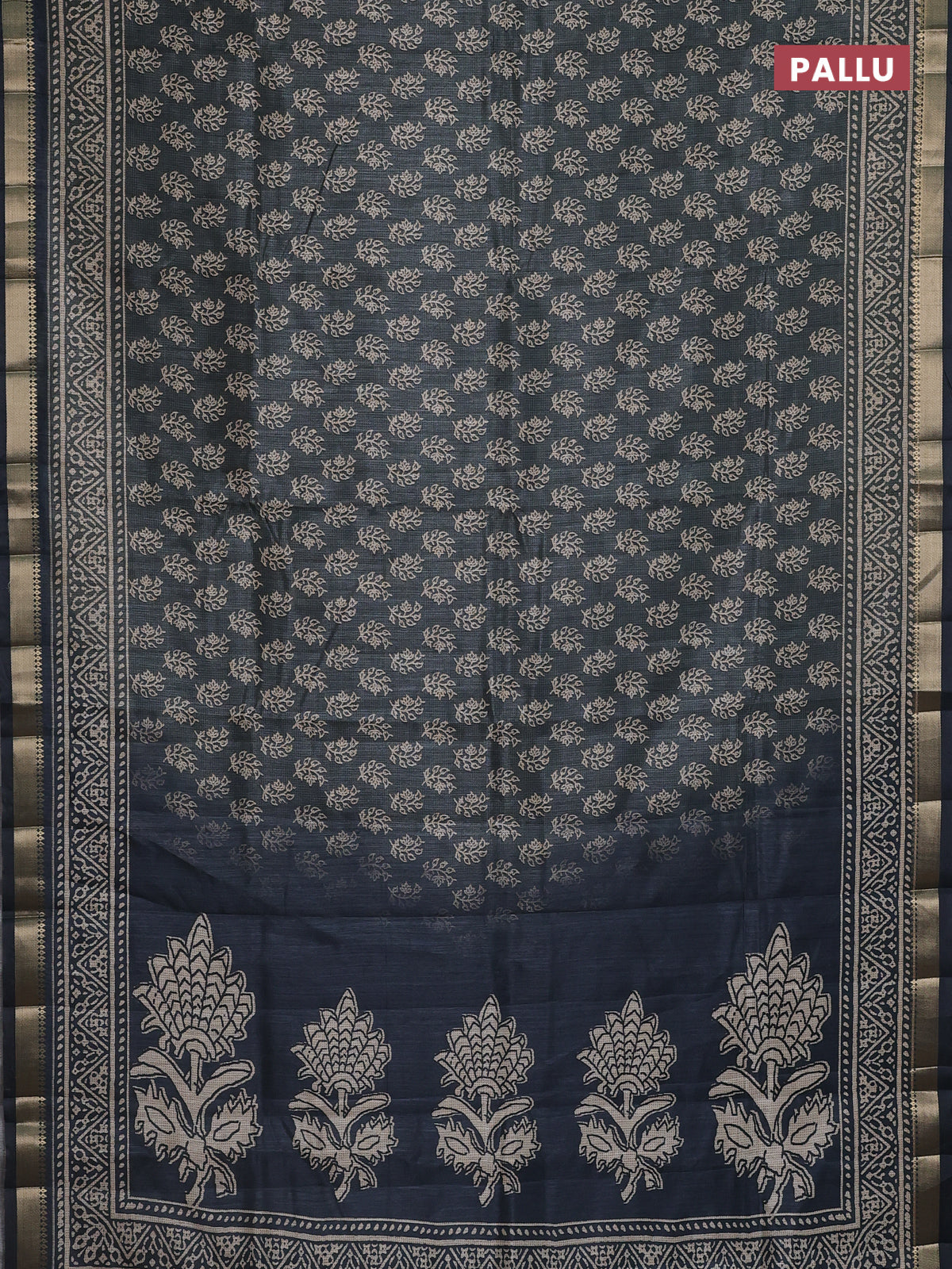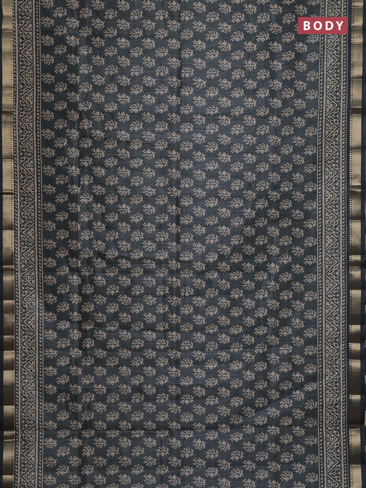Semi tussar saree grey with allover butta prints and zari woven border