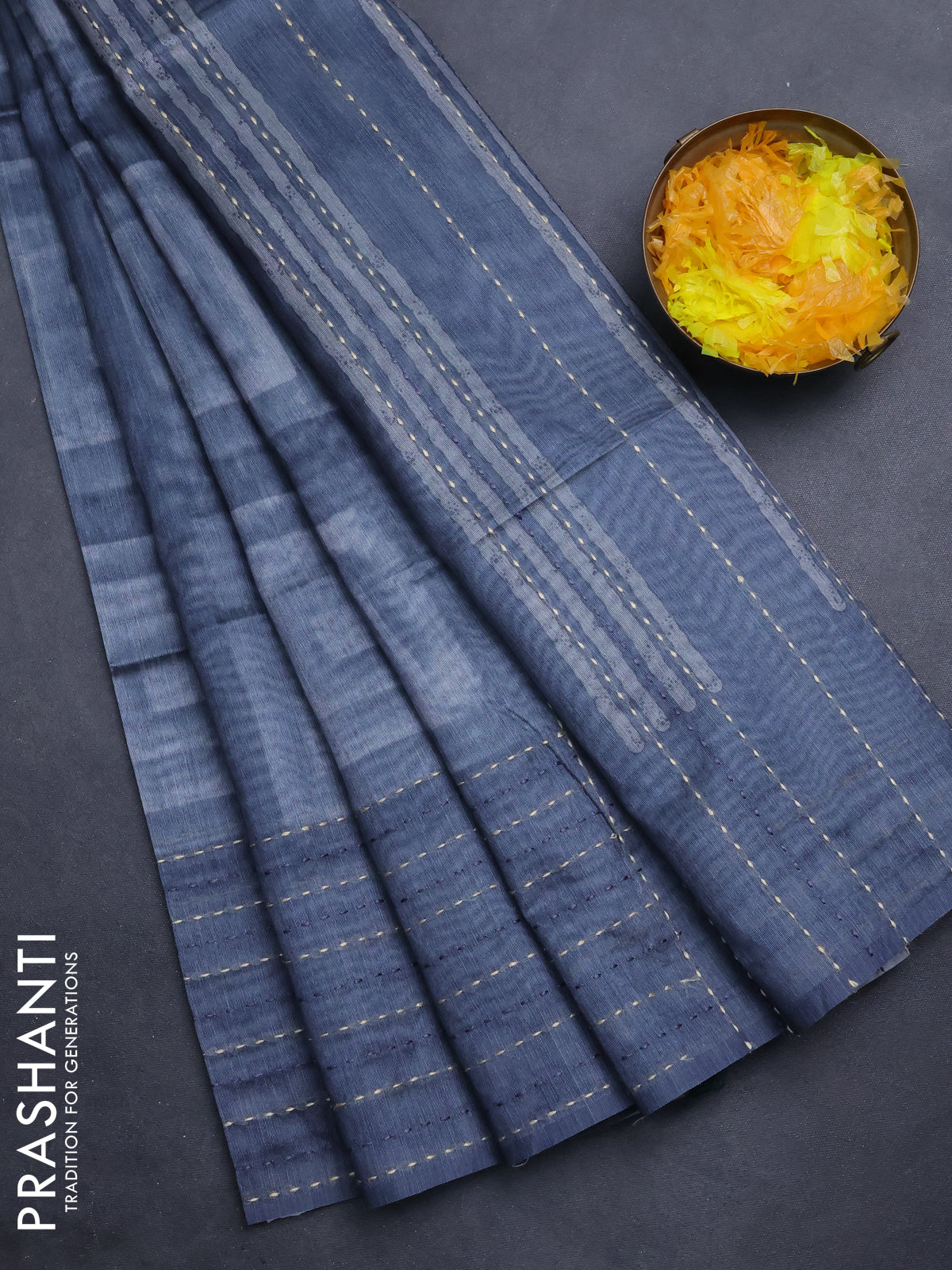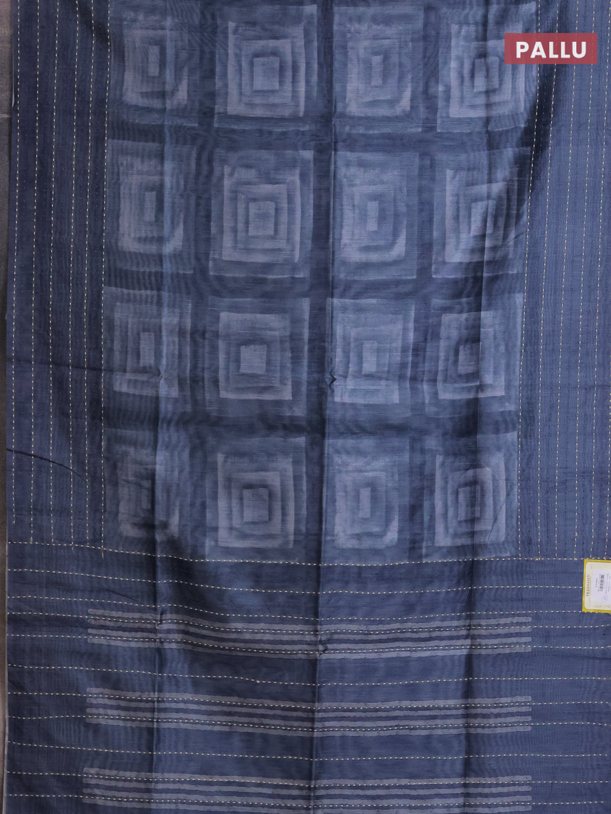 Semi tussar saree grey with allover geometric prints and katha stitch work pallu & border
