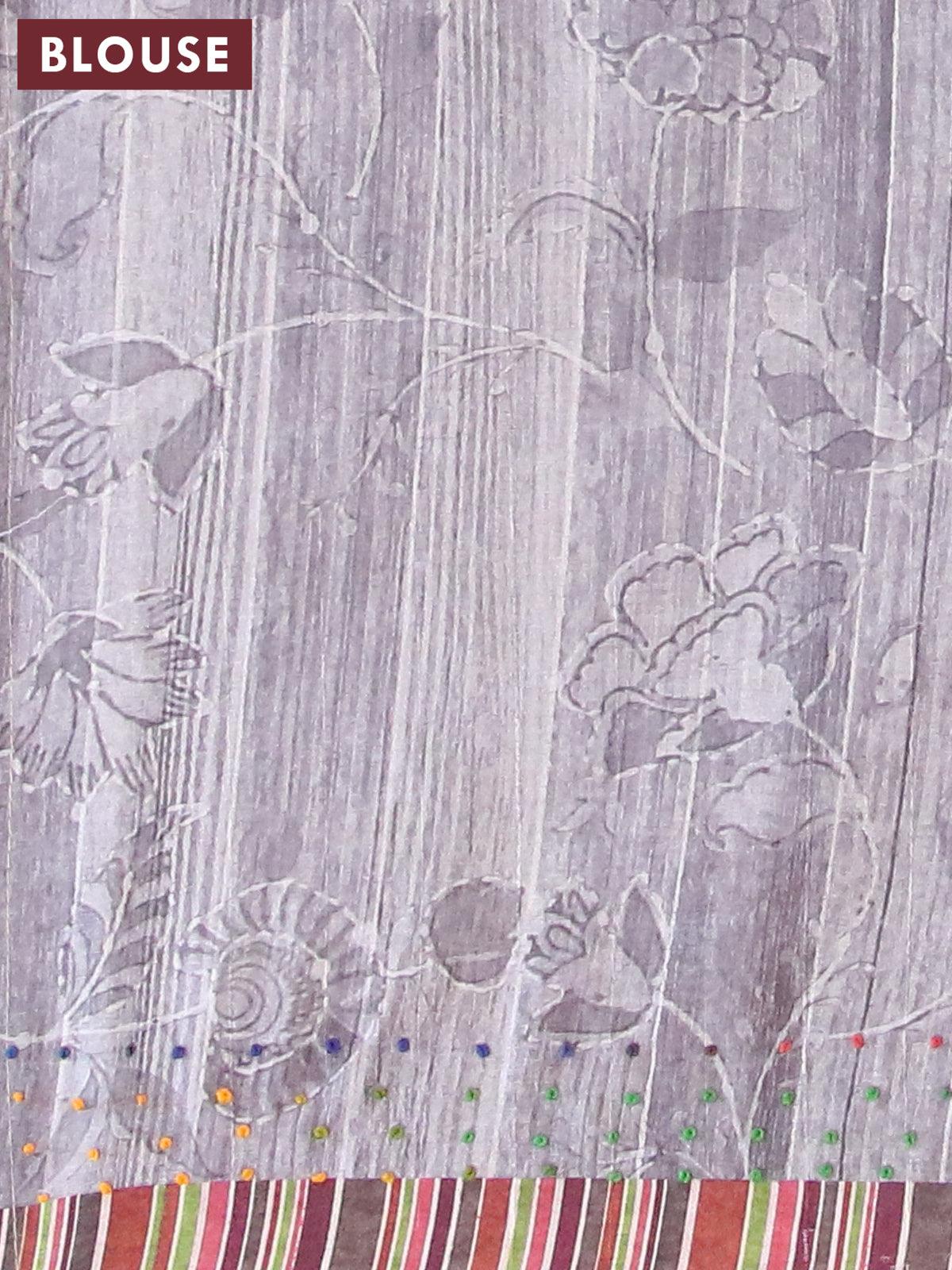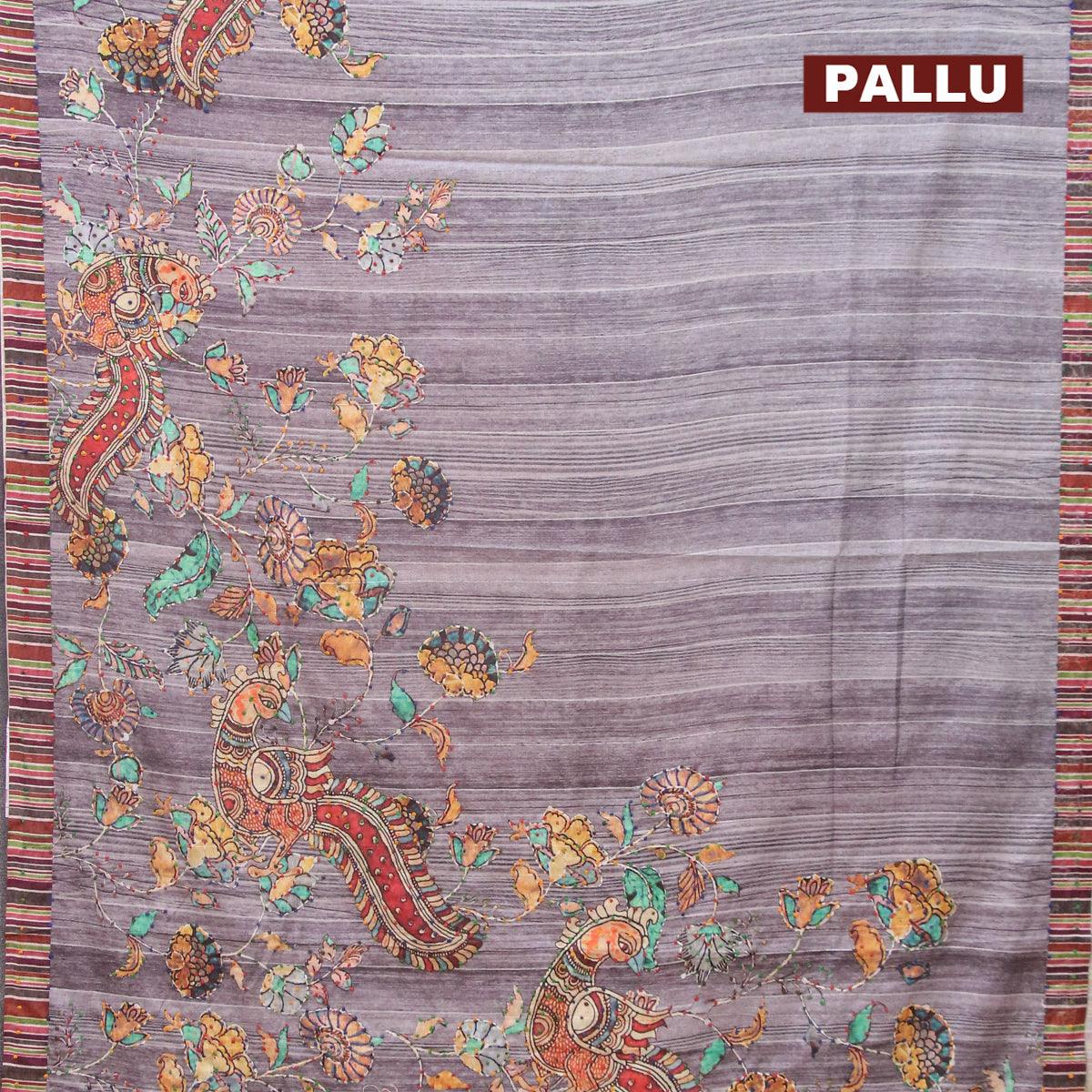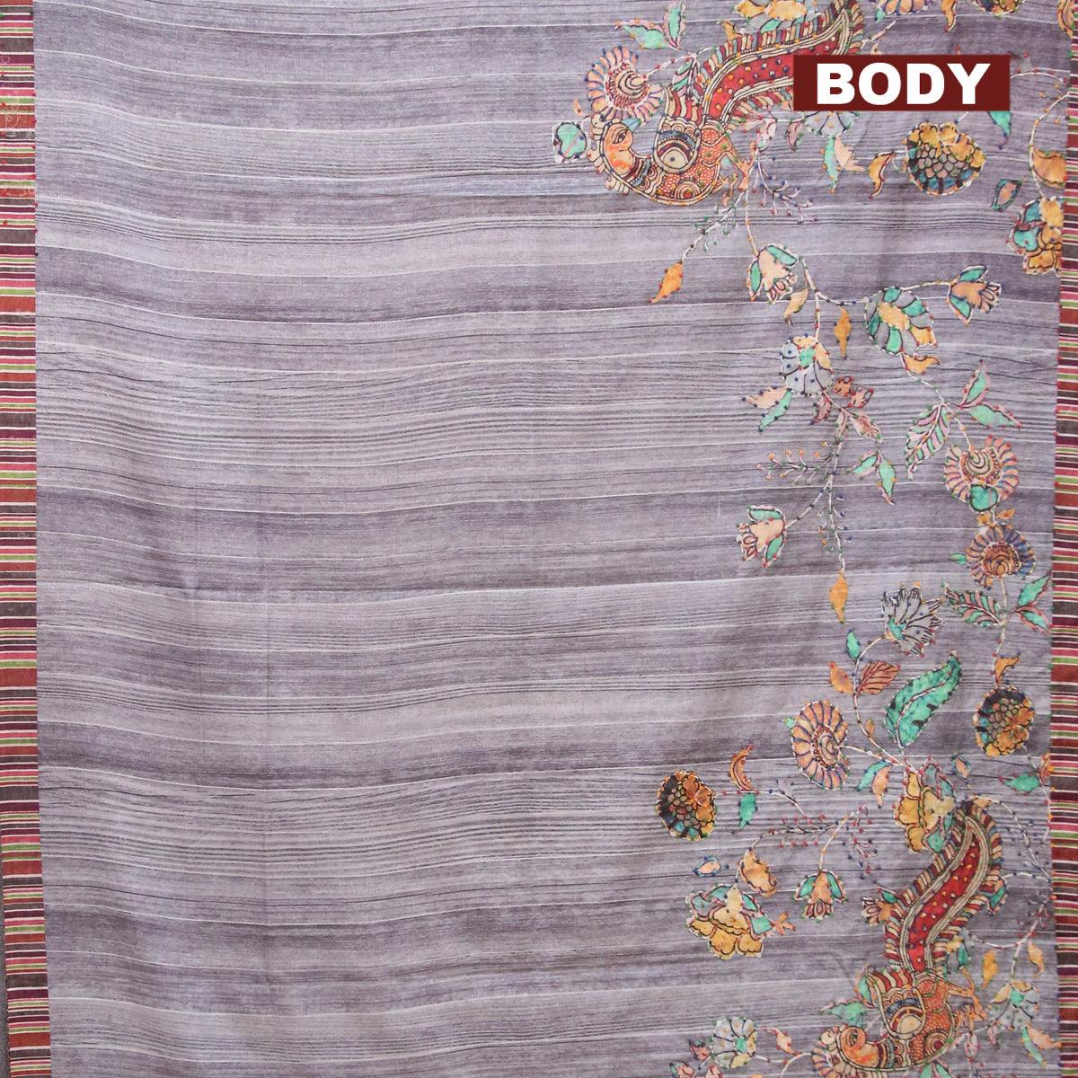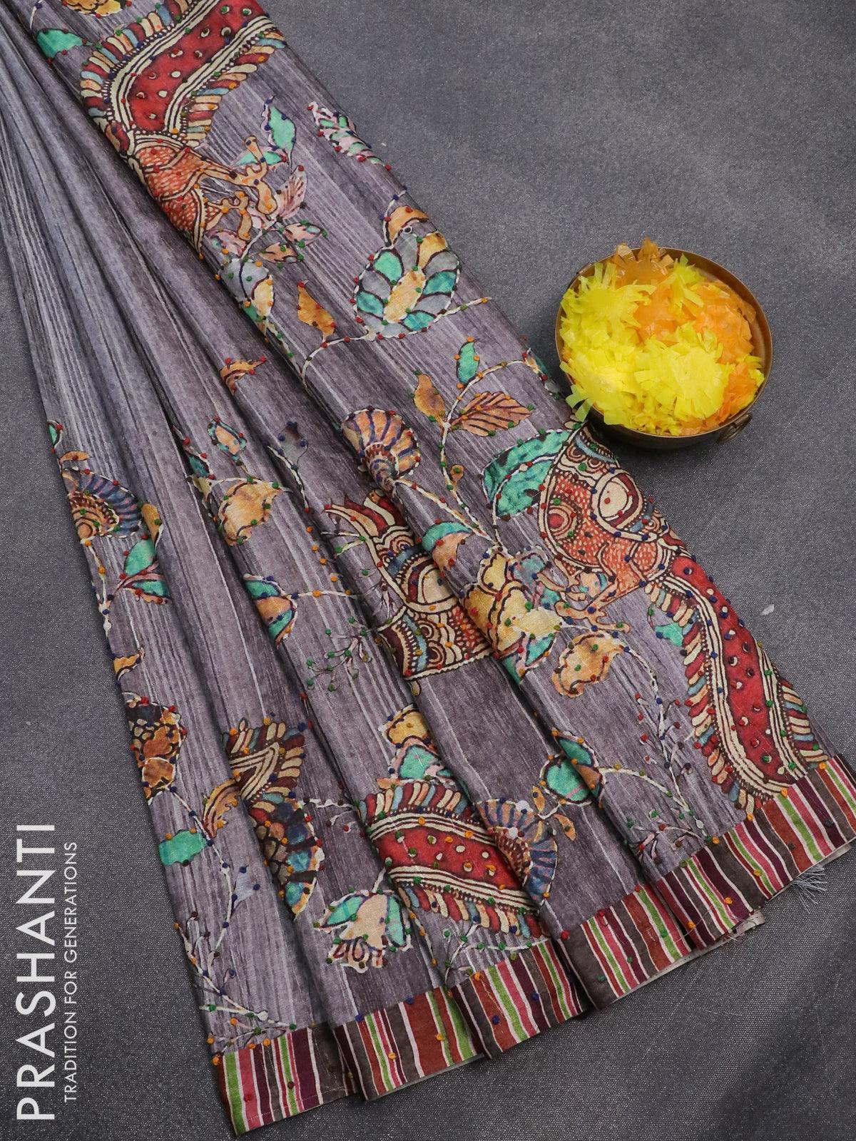 Semi tussar saree grey with kalamkari prints & french knot work and simple border