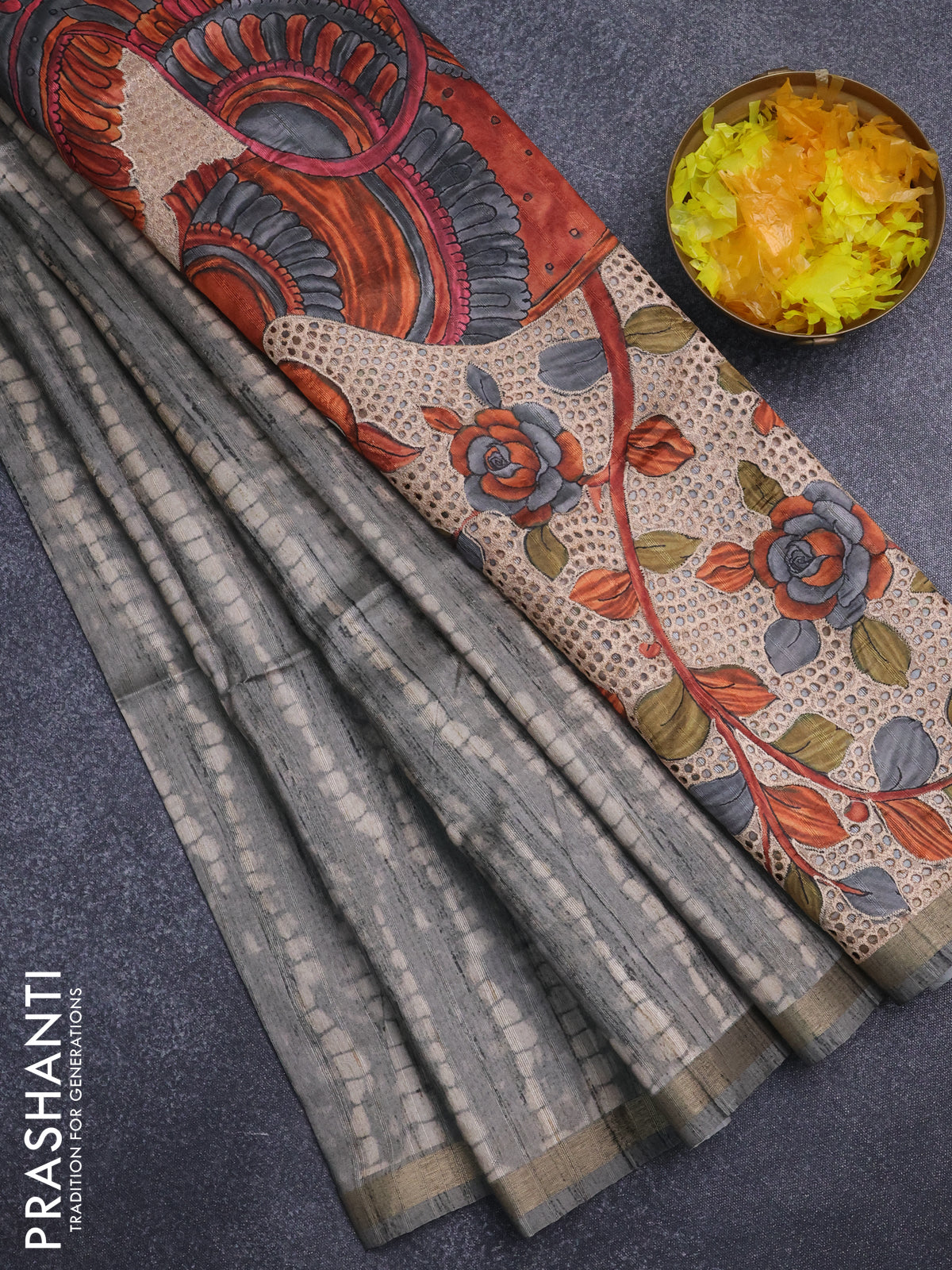 Semi tussar saree grey with shibori prints and kalamkari prints & cut work pallu