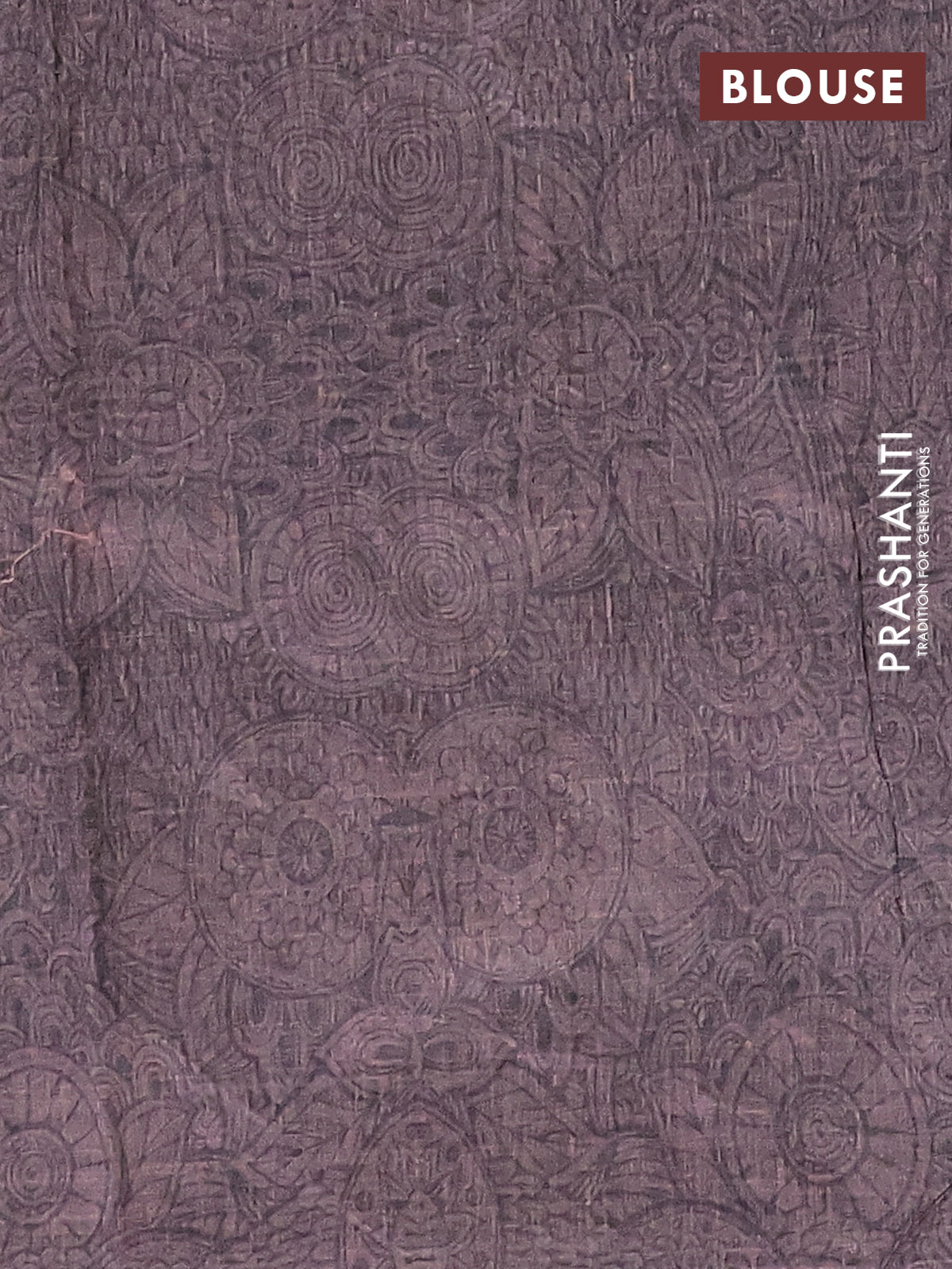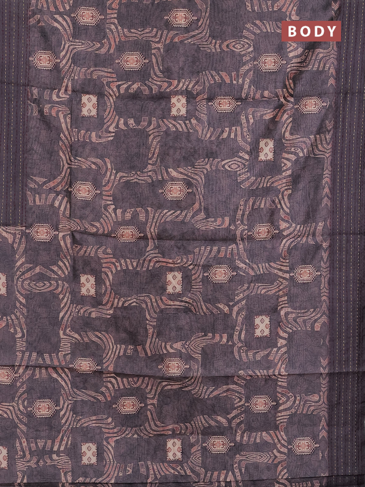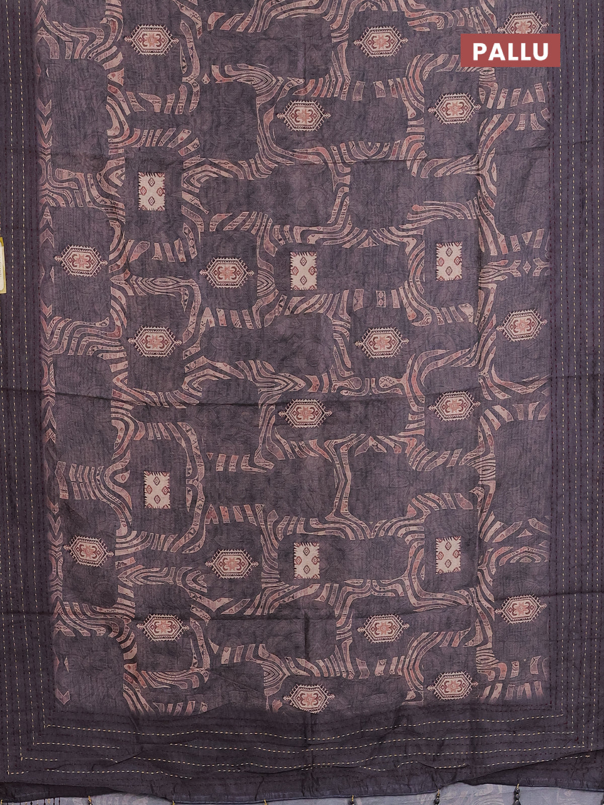 Semi tussar saree greyis brown with allover prints and kantha stitch work border