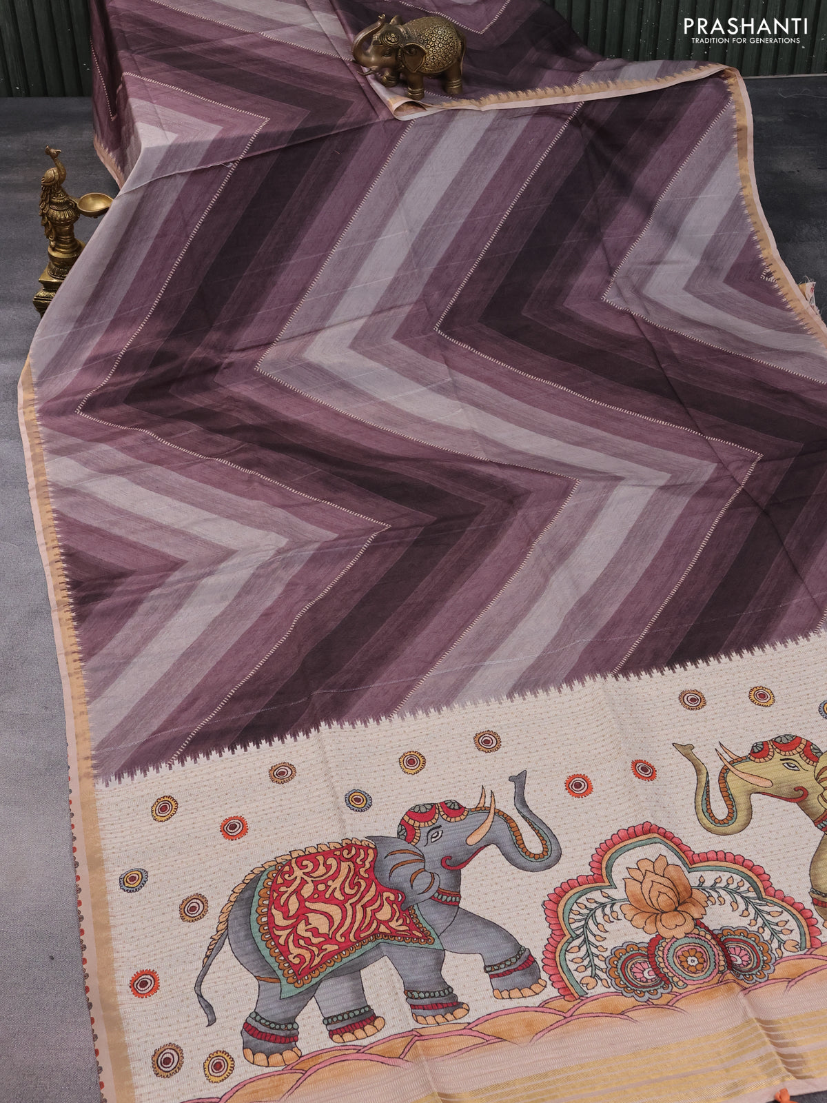 Semi tussar saree greyish brown and beige with allover zig zag saree and kalamkari printed pallu