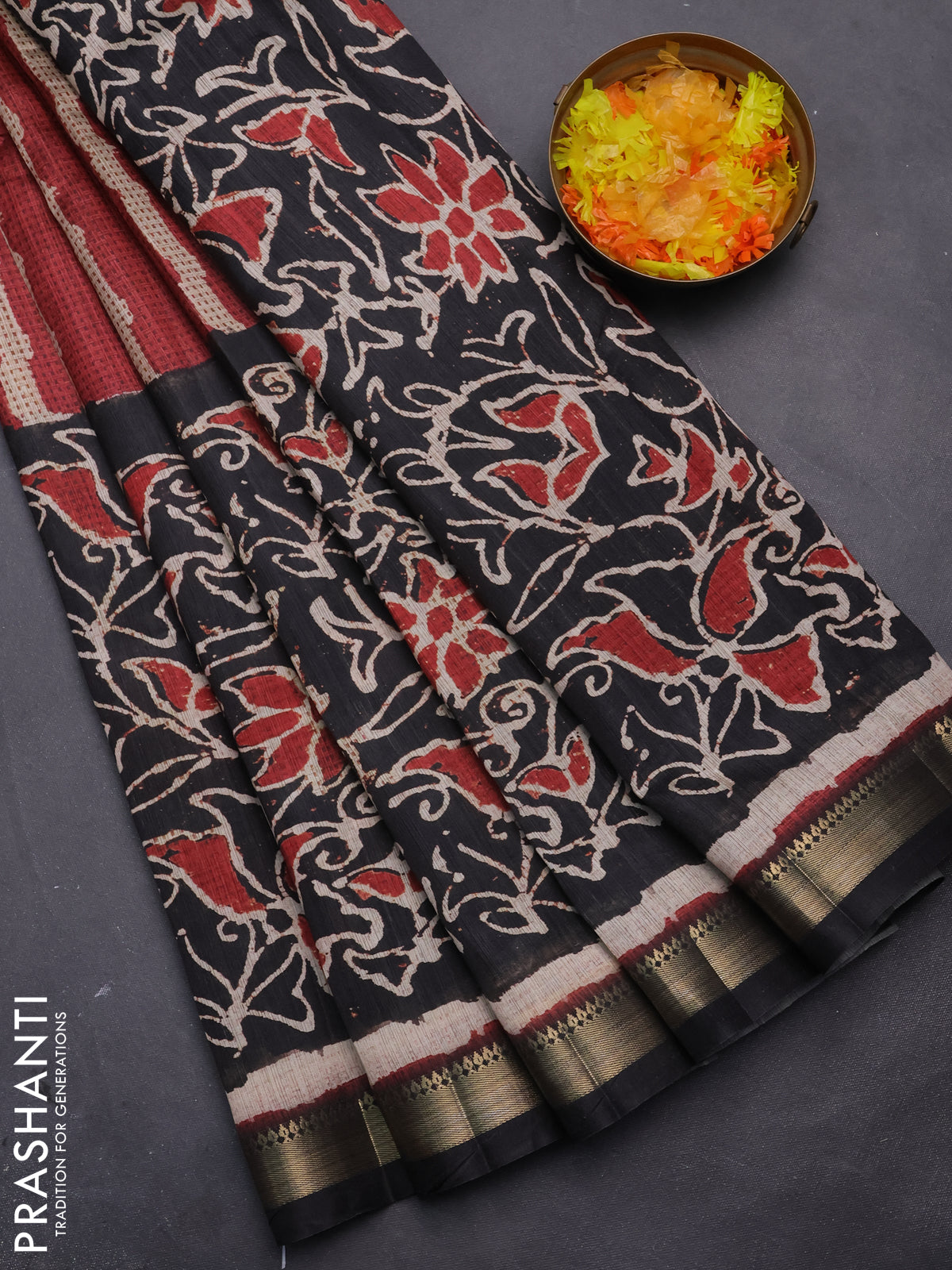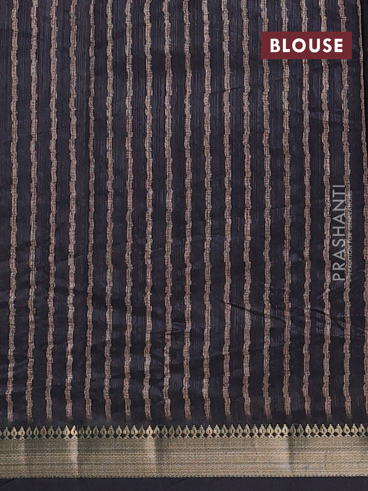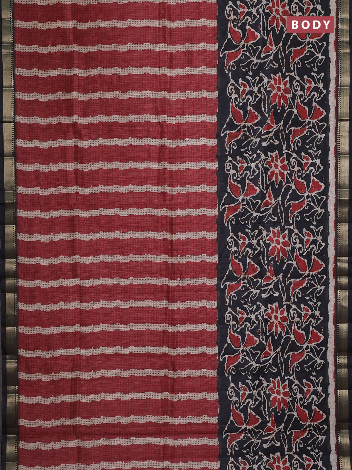 Semi tussar saree maroon and black with stripes pattern and zari woven border