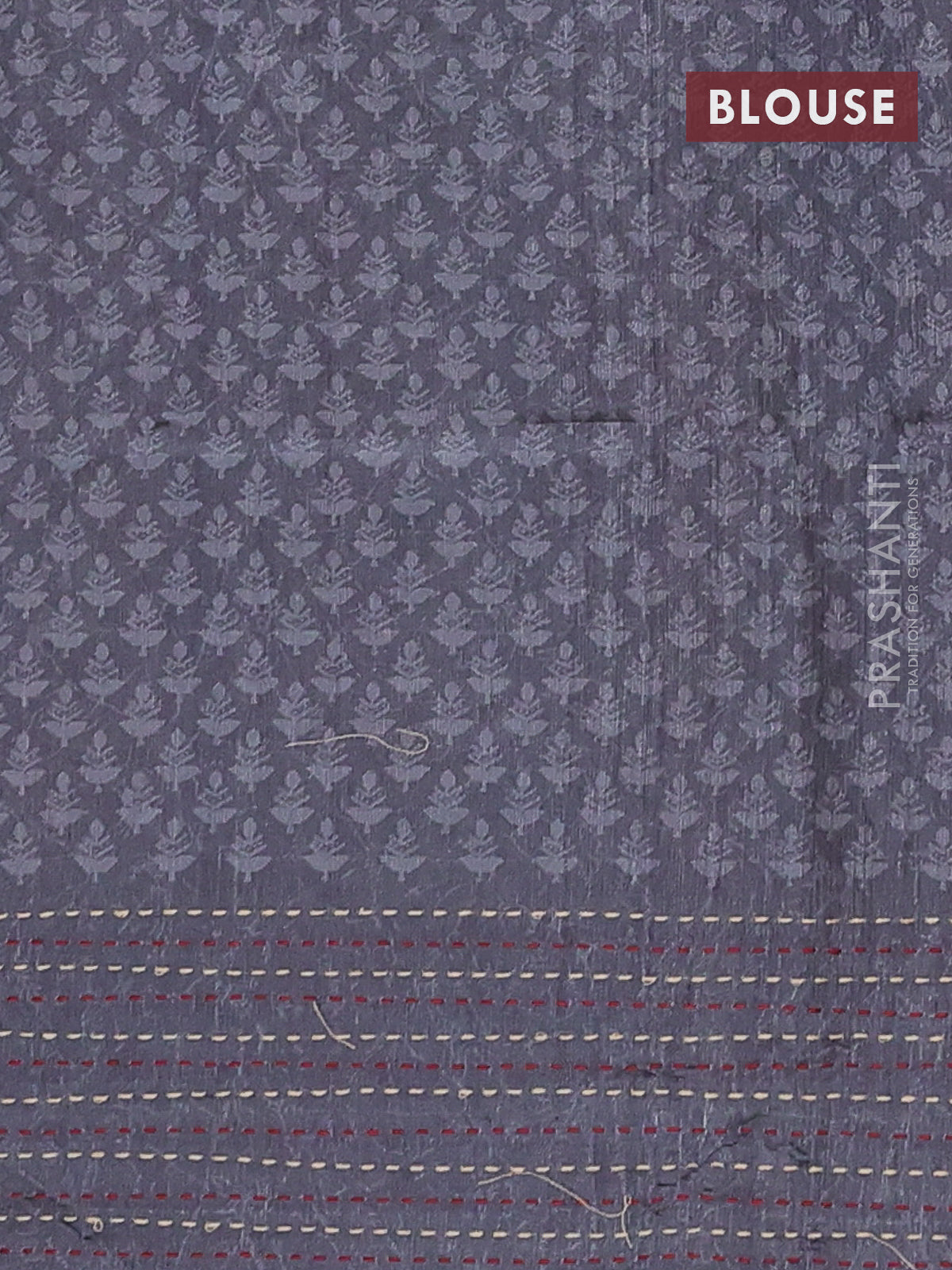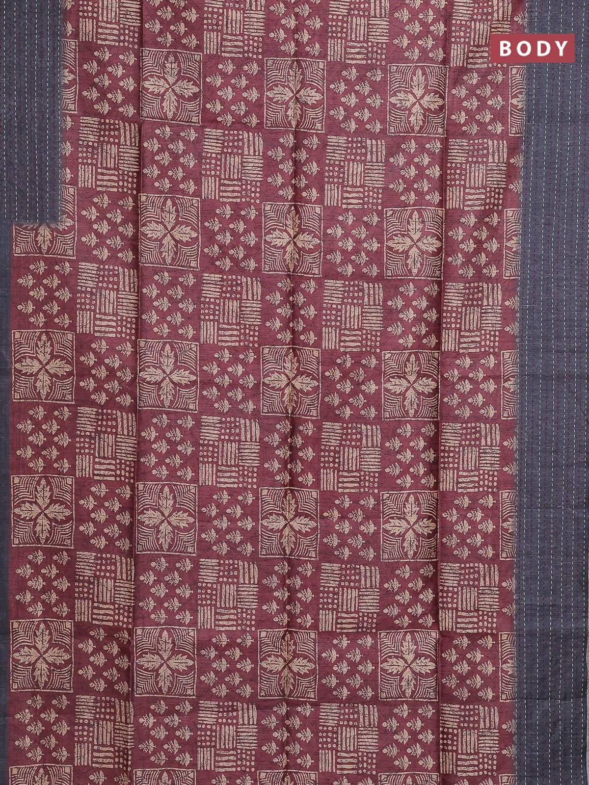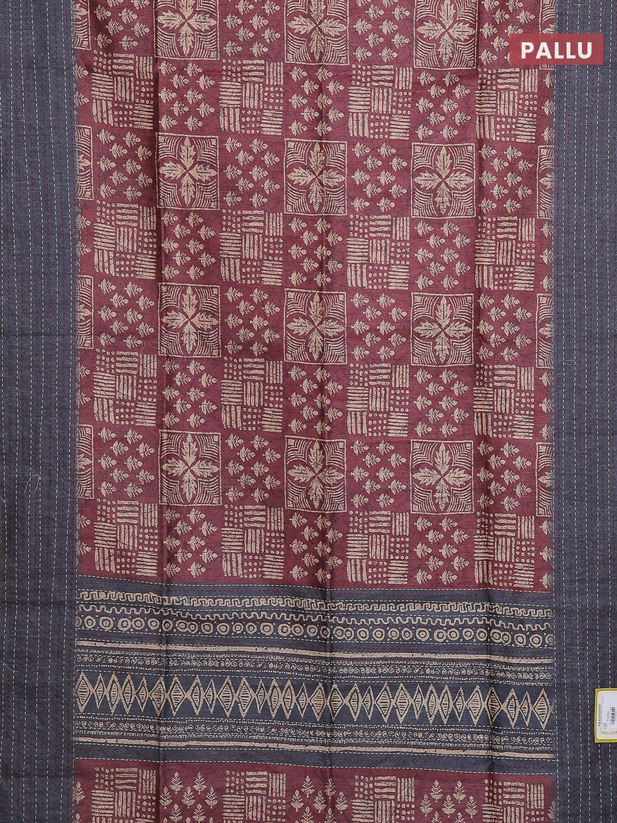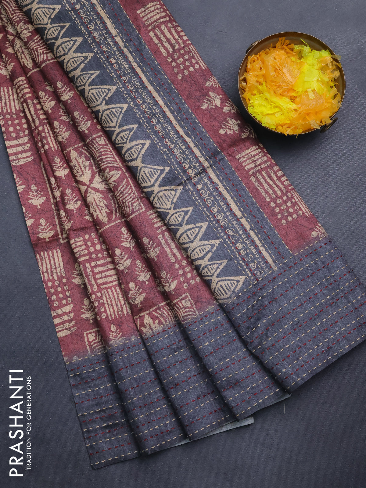 Semi tussar saree maroon and grey with allover batik prints and katha stitch work pallu & border