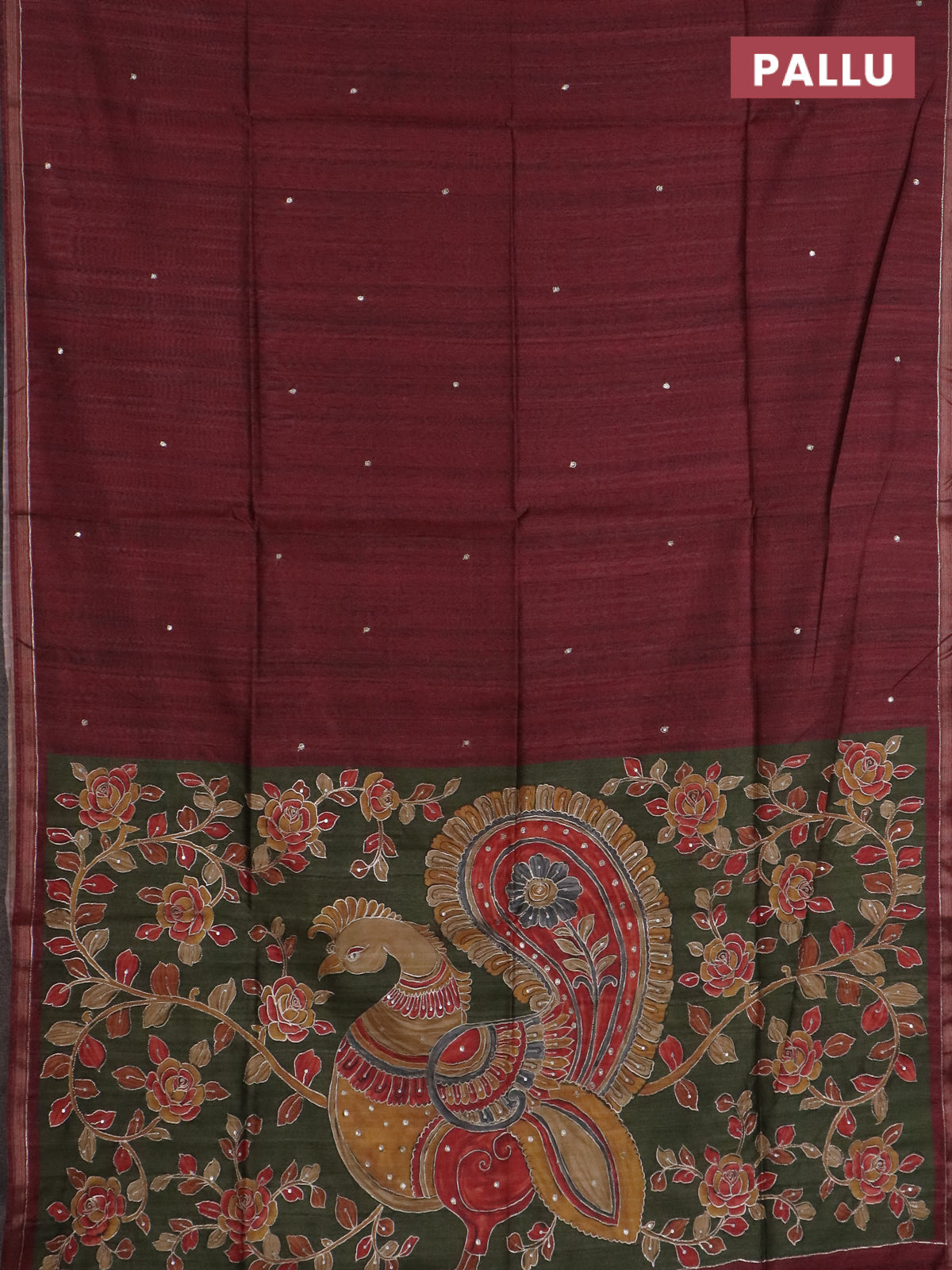 Semi tussar saree maroon and sap green with embroidery buttas and kalamkari prints & pita work pallu