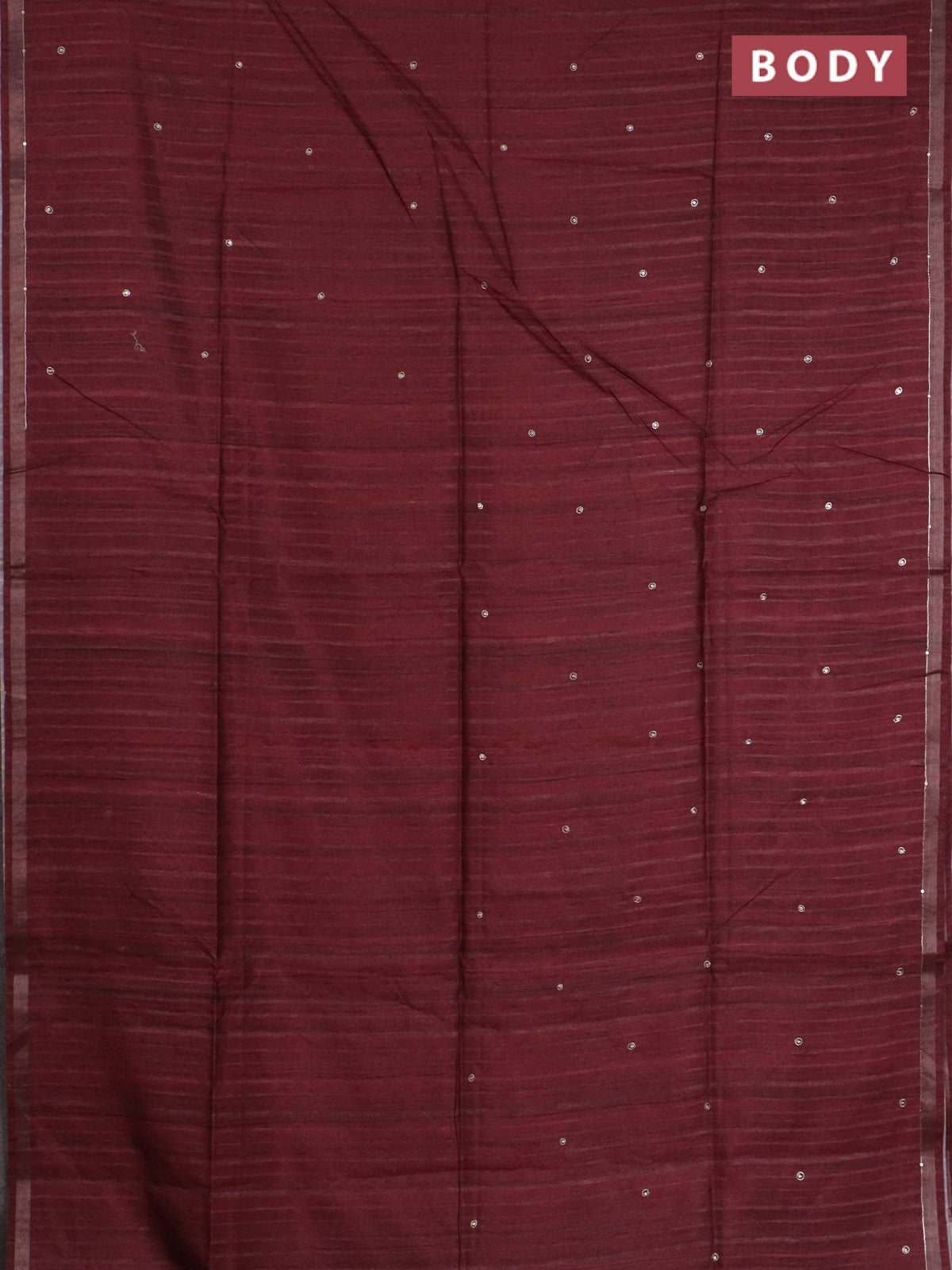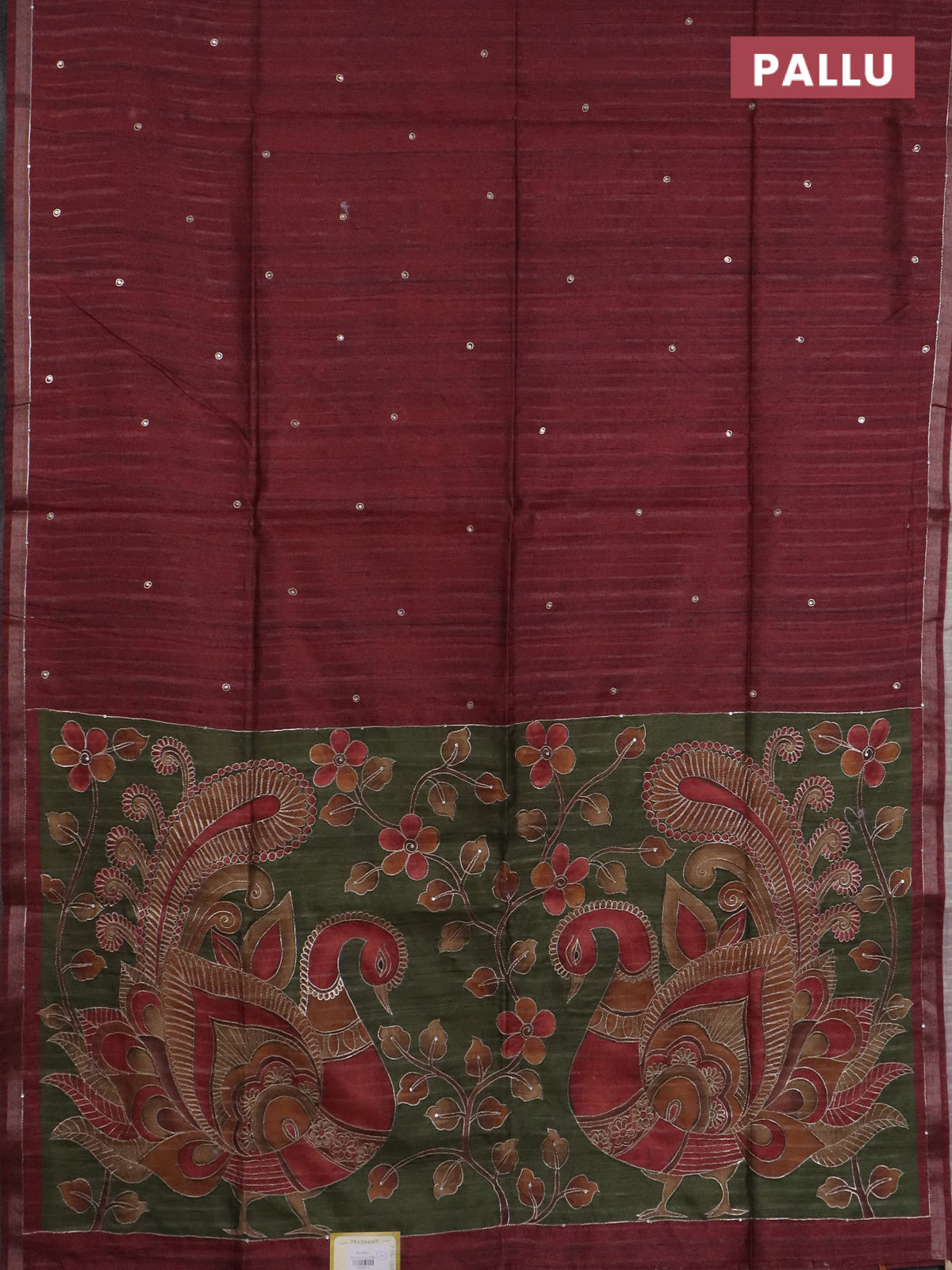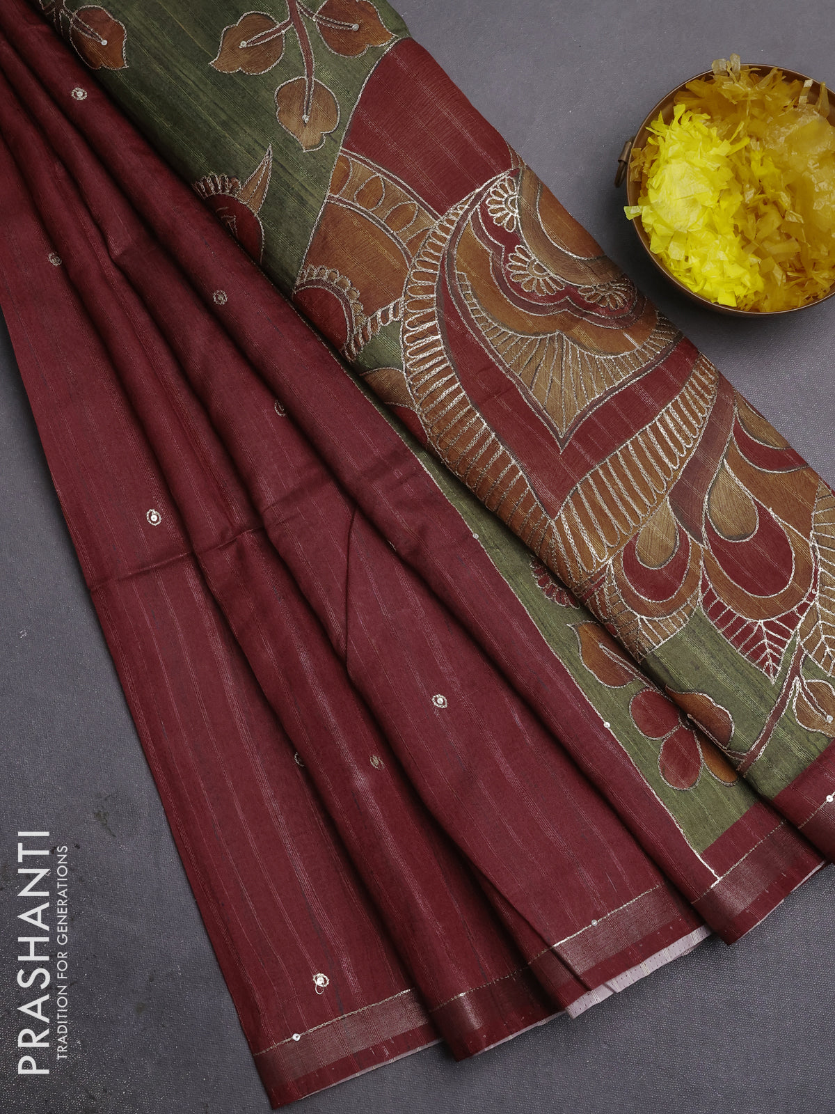 Semi tussar saree maroon and sap green with embroidery buttas and kalamkari prints & pita work pallu