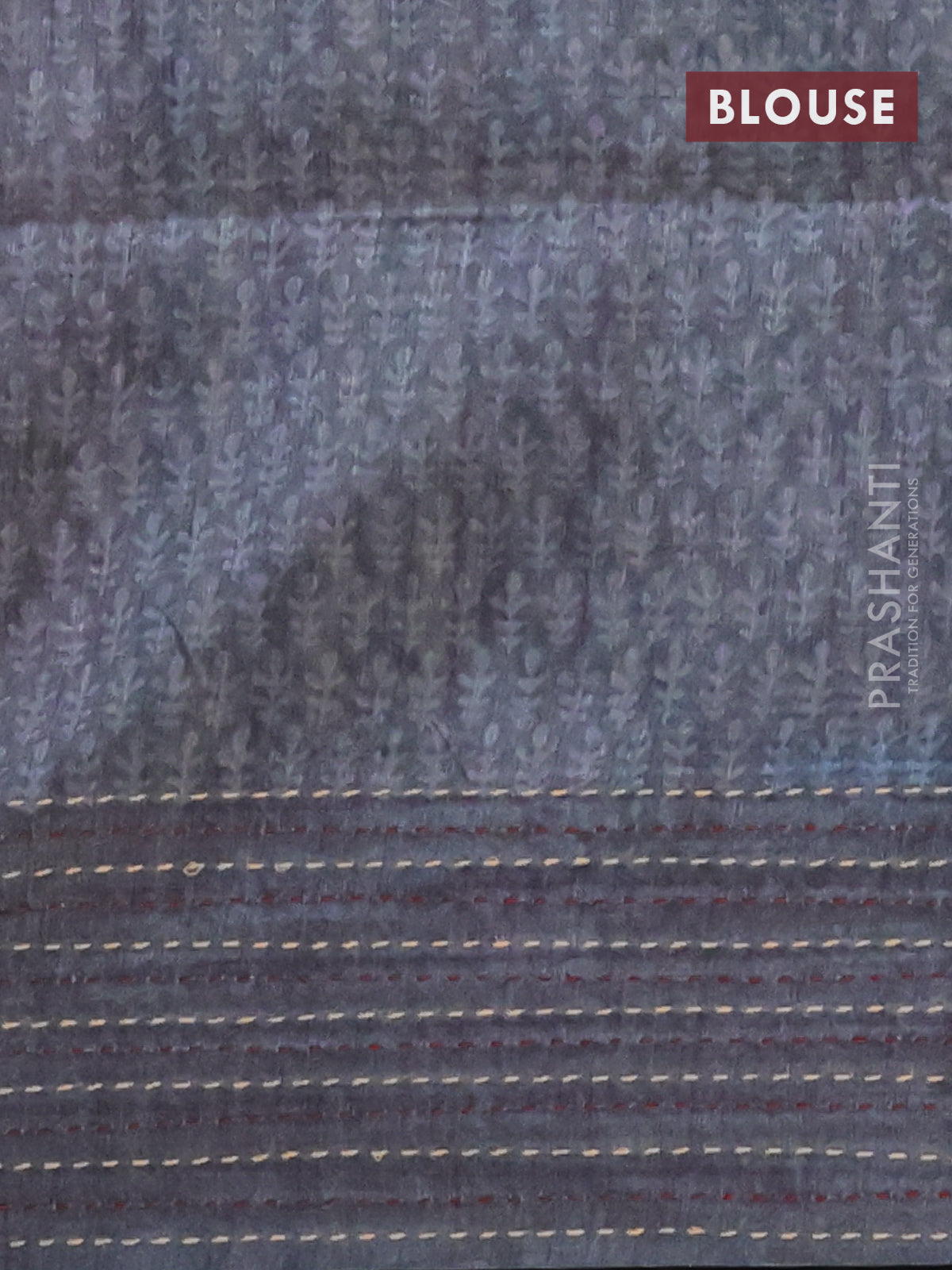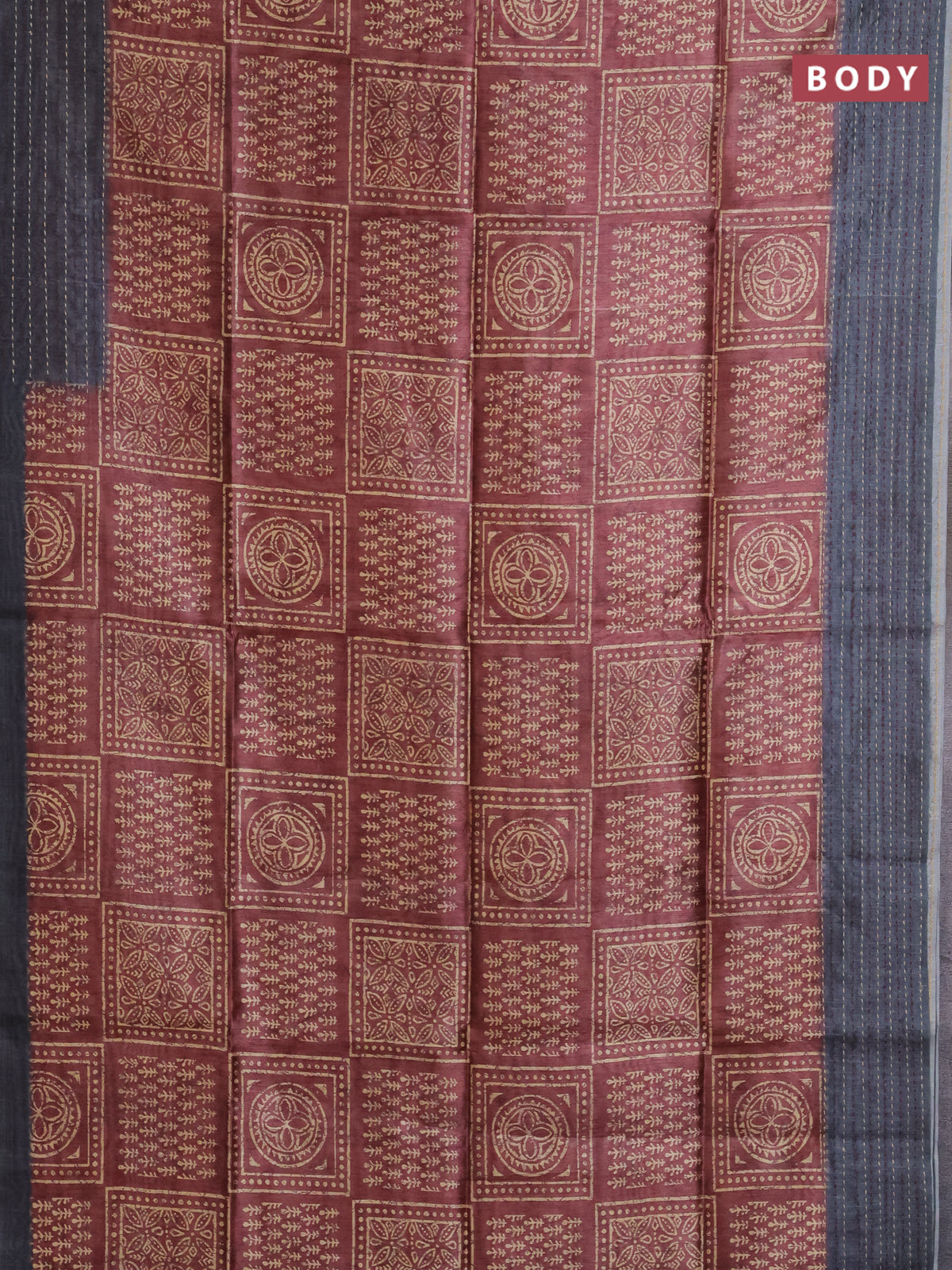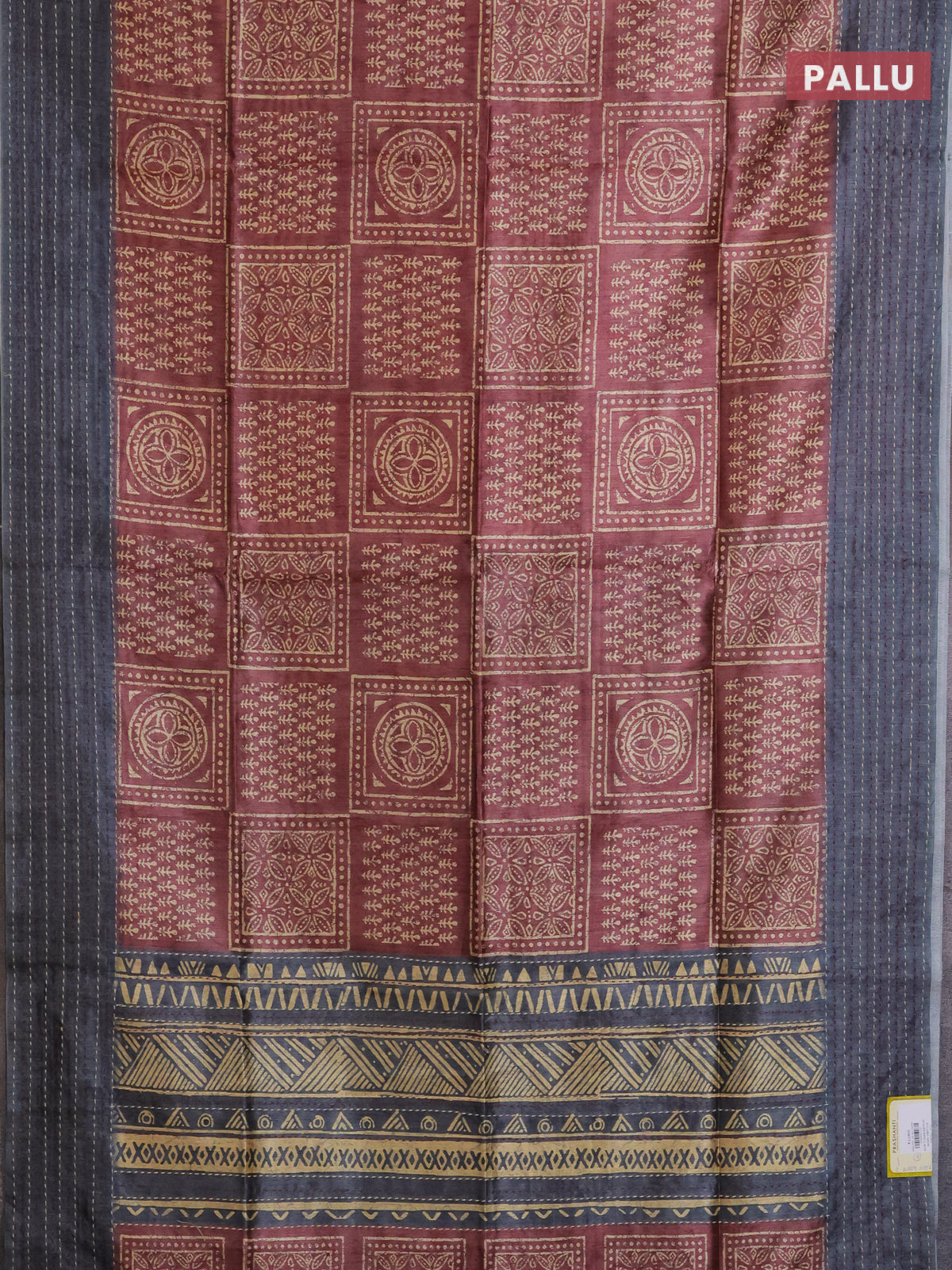 Semi tussar saree maroon shade and grey with allover batik prints and katha stitch work pallu & border
