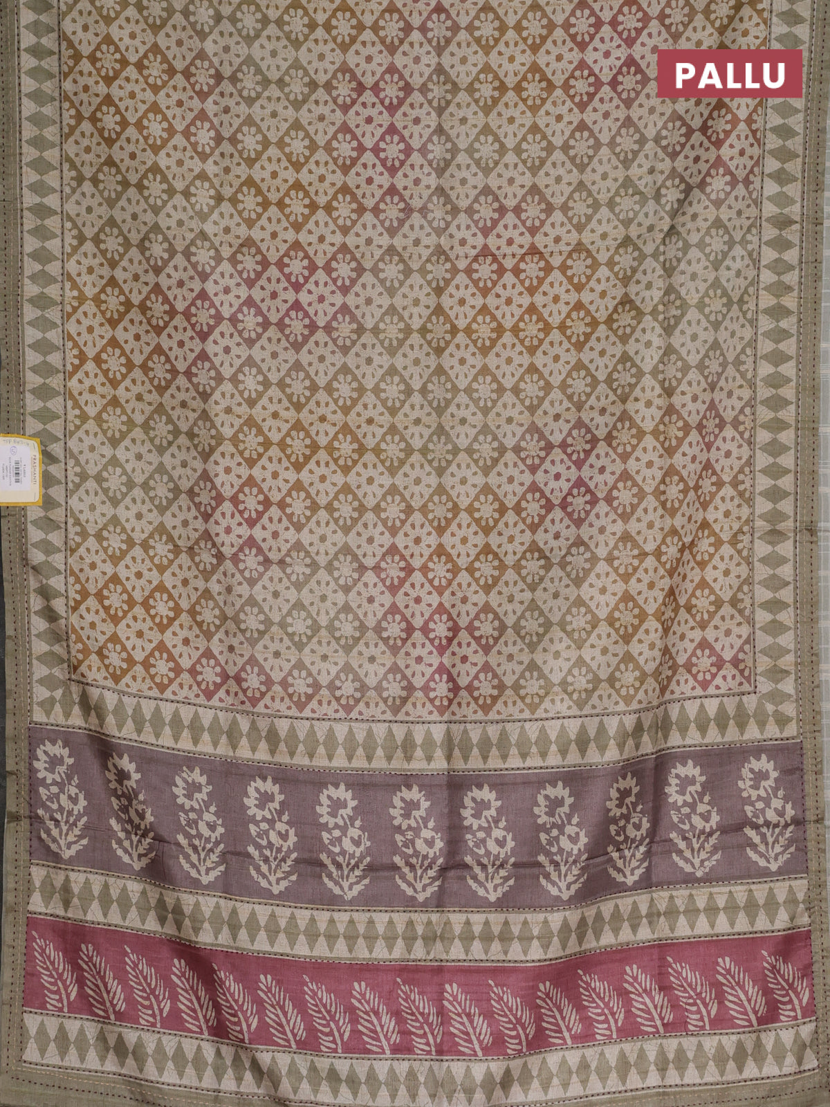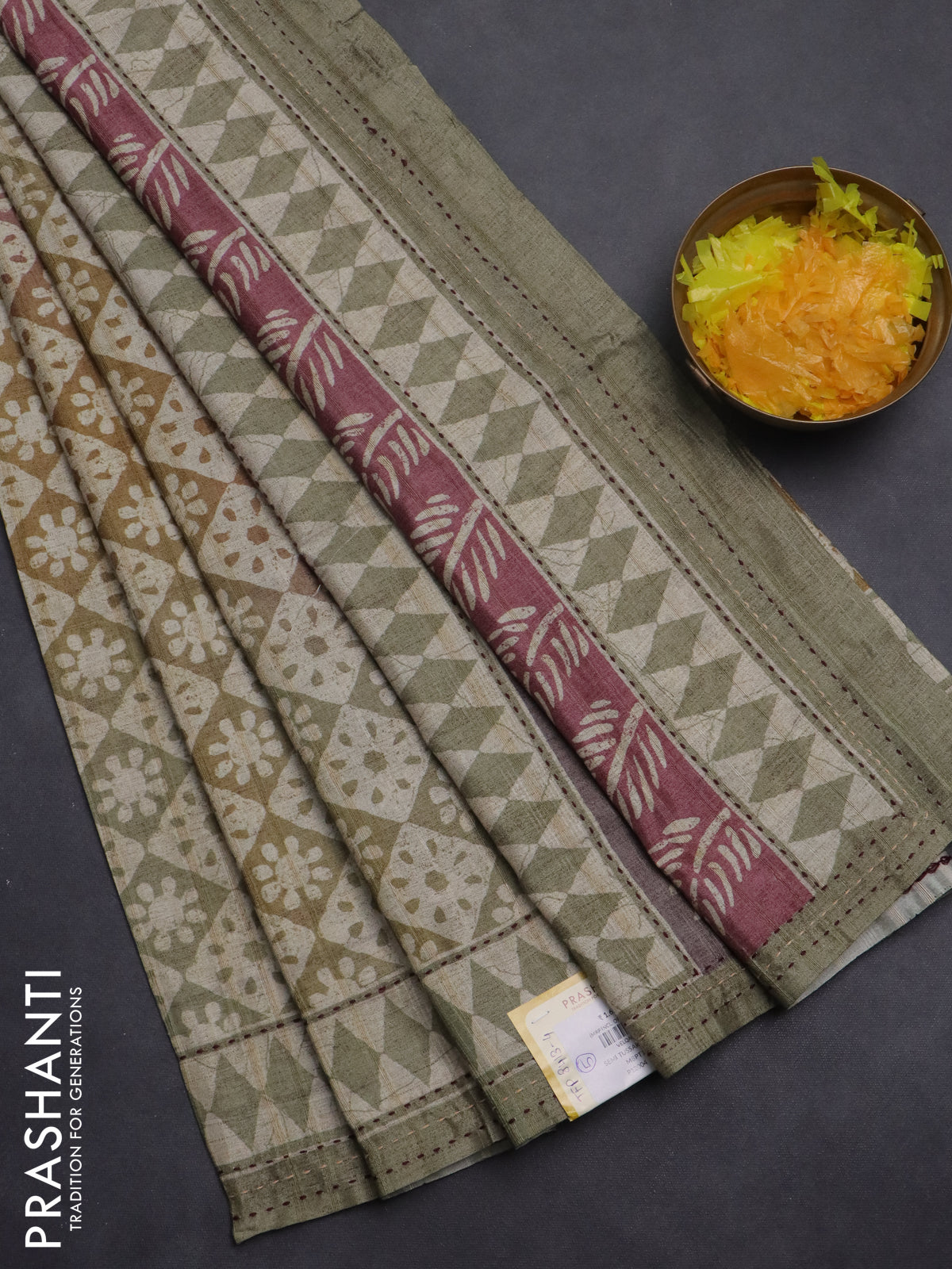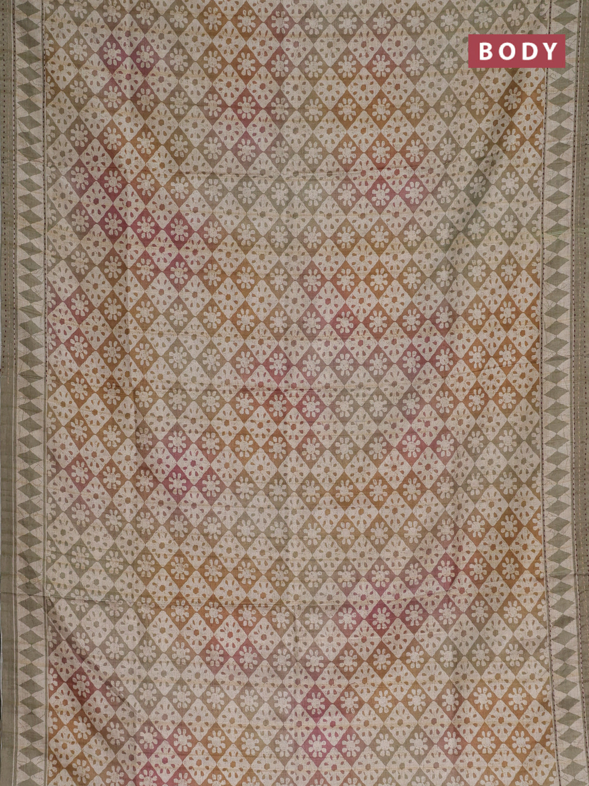 Semi tussar saree multi colour and elaichi green with allover geometric prints and kantha stitch work border