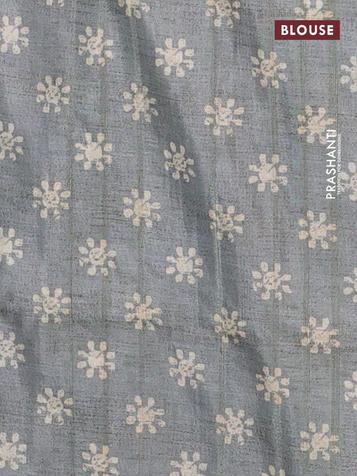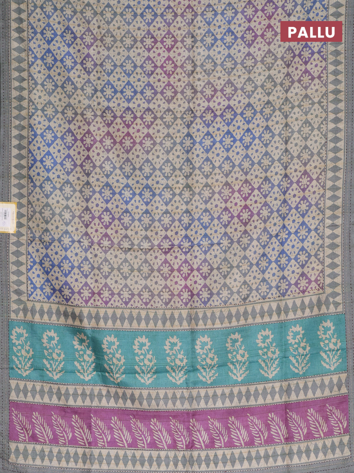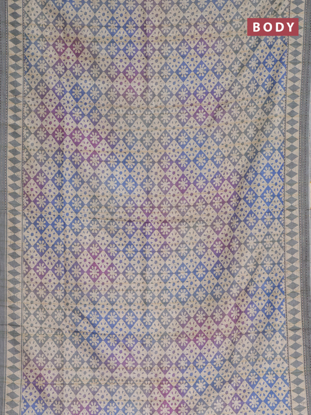 Semi tussar saree multi colour and grey shade with allover geometric prints and kantha stitch work border