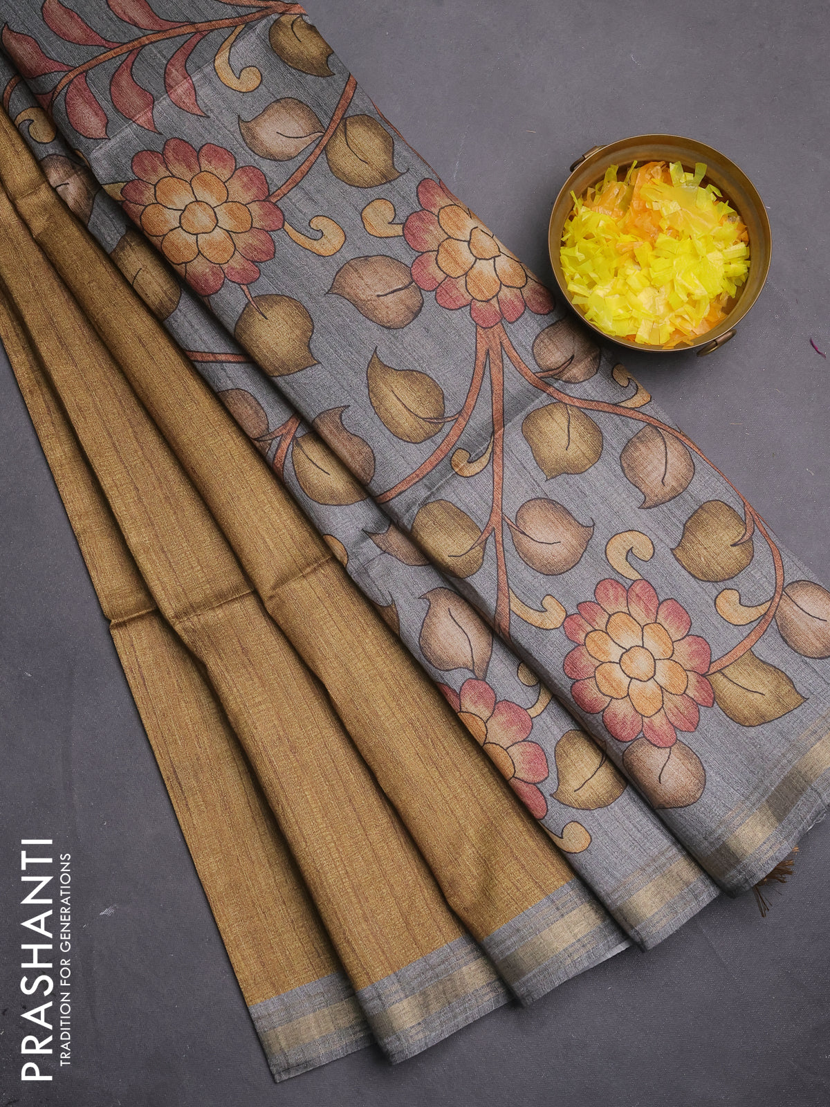Semi tussar saree mustard shade and grey with plain body and kalamkari printed pallu