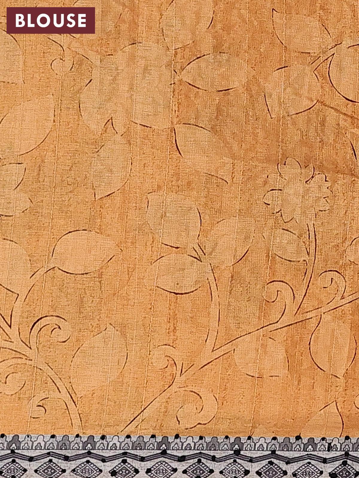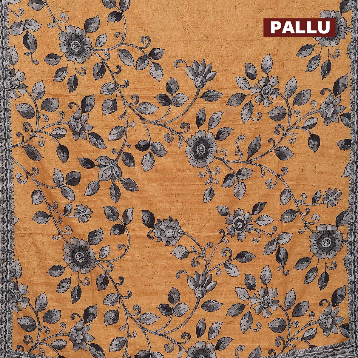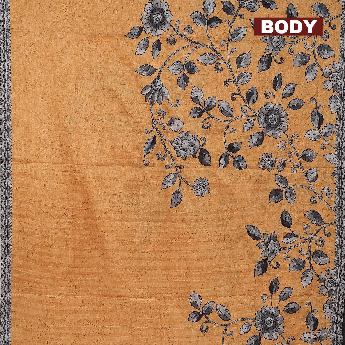 Semi tussar saree mustard yellow and grey with kalamkari prints & french knot work and printed border