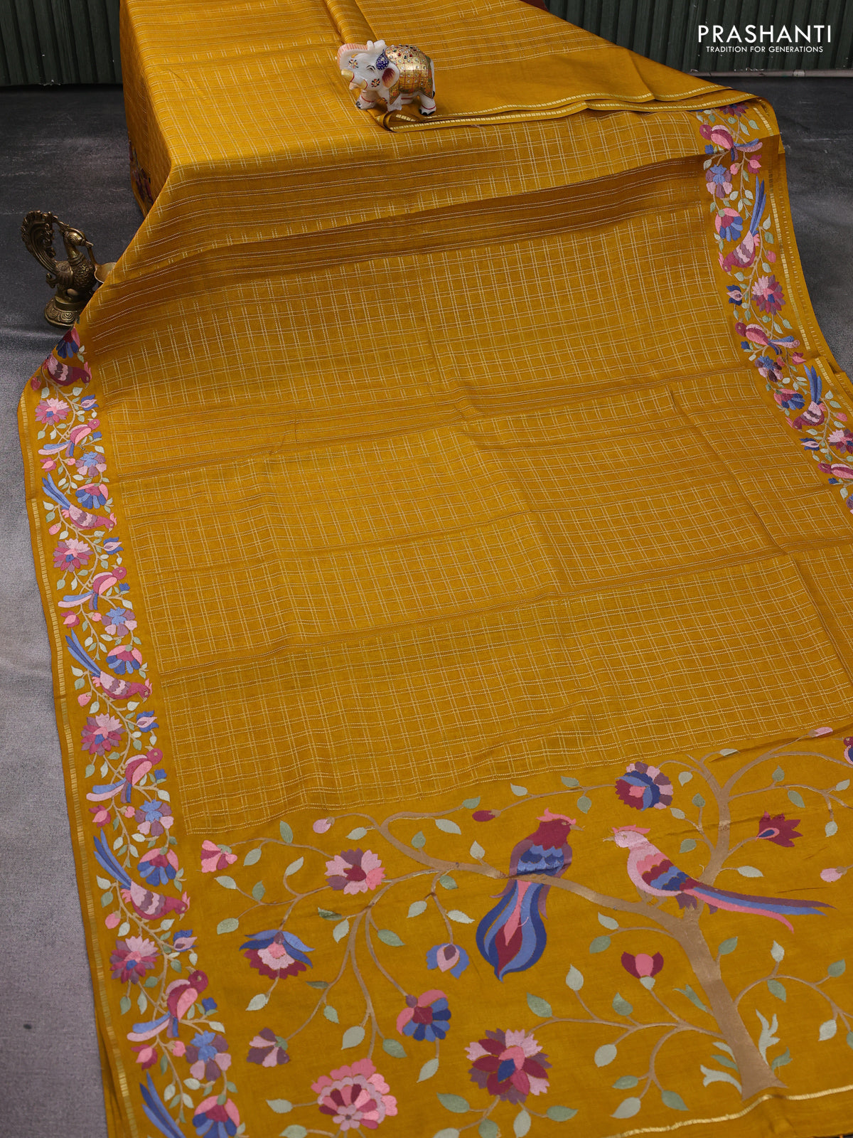 Semi tussar saree mustard yellow with allover zari checked pattern and embroidery border